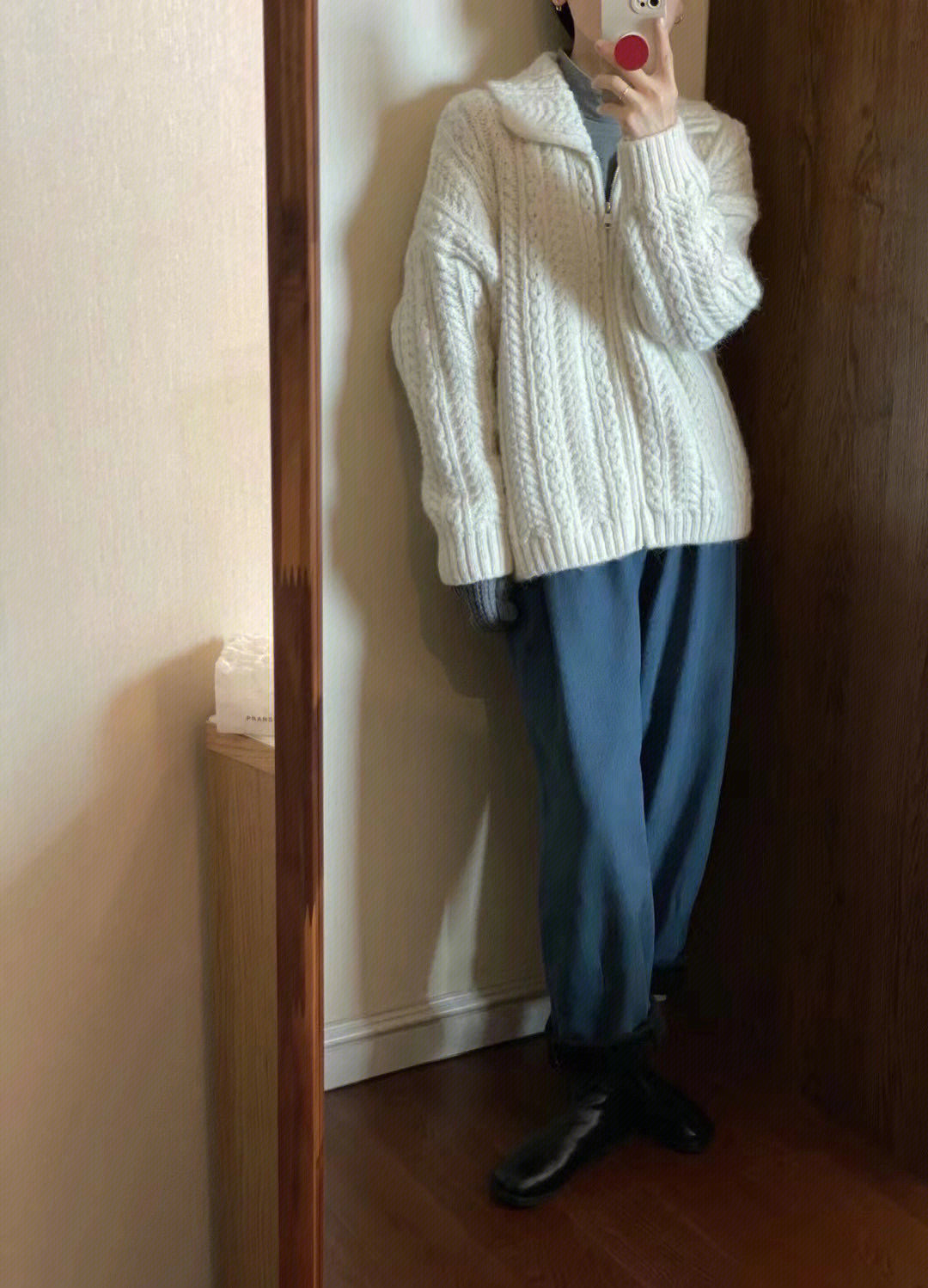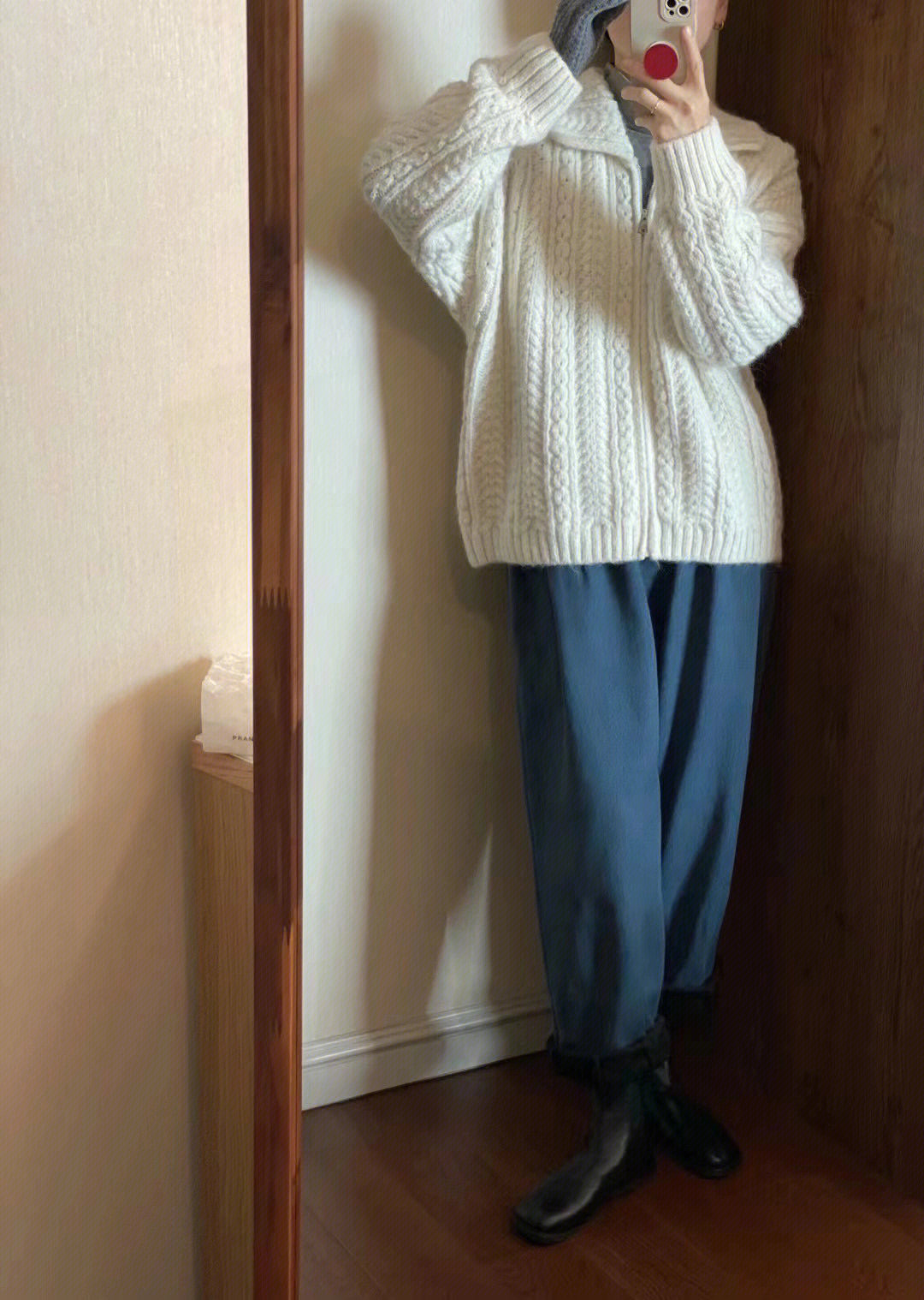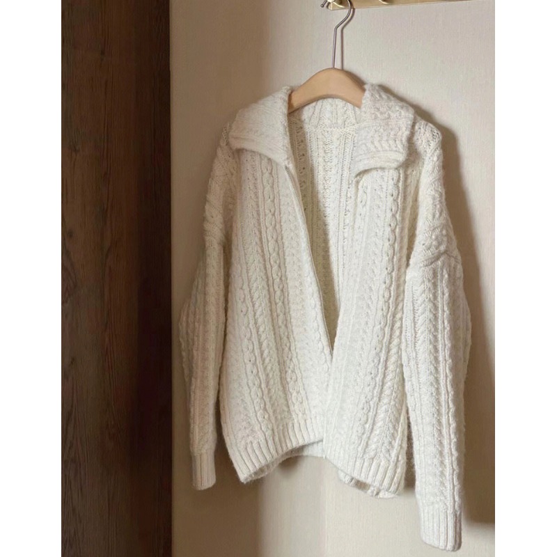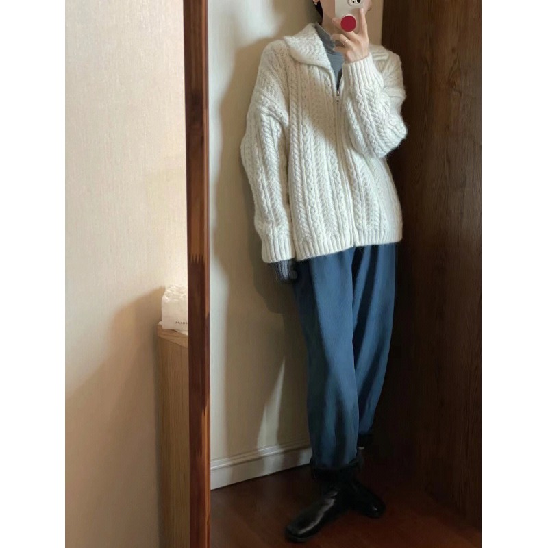 早秋白色polo翻領麻花毛衣外套女秋冬浣熊絨針織開衫春秋日系上衣