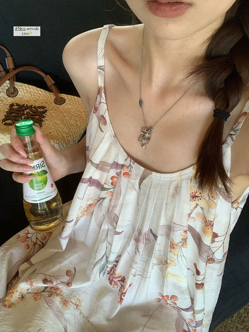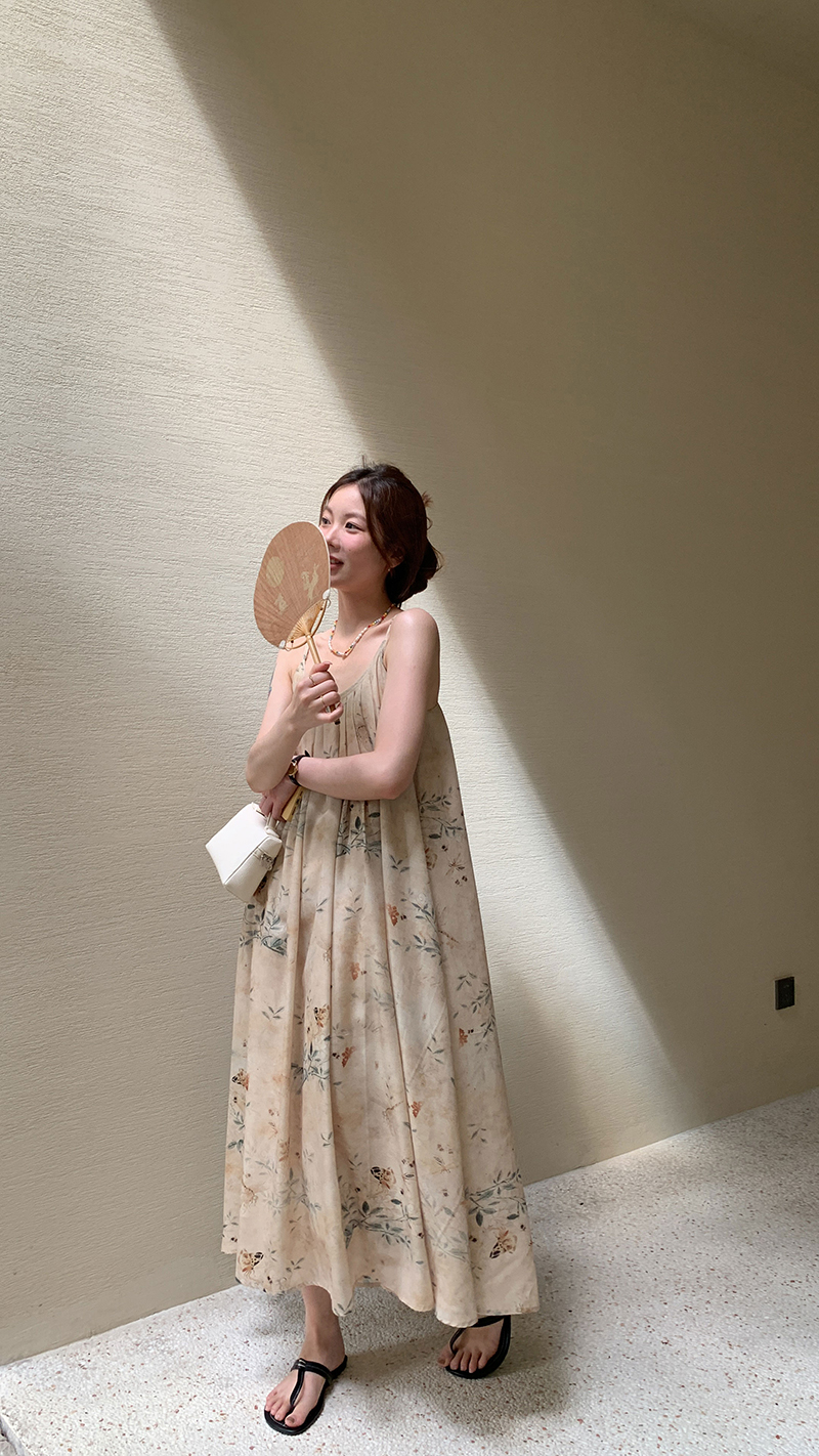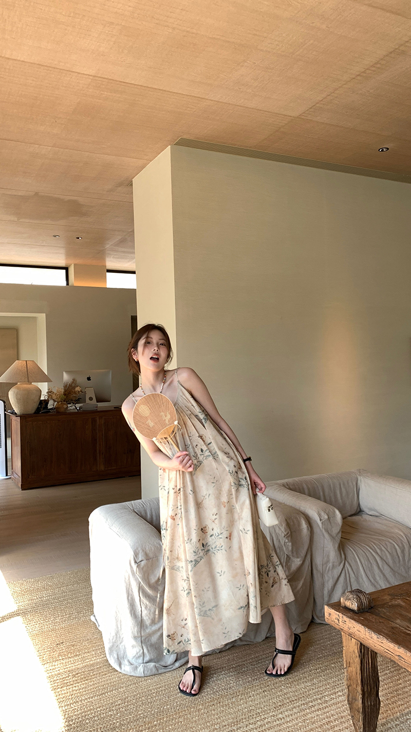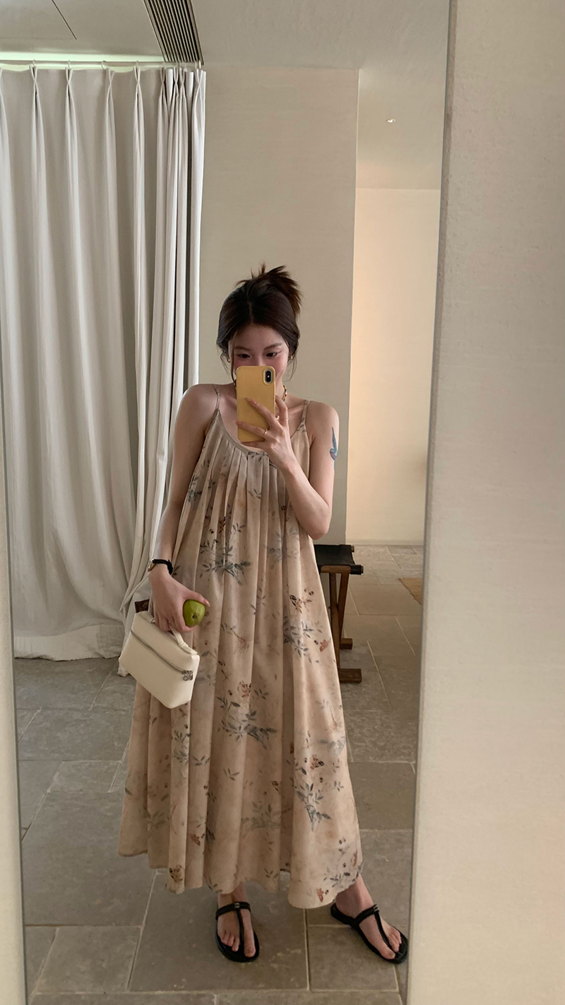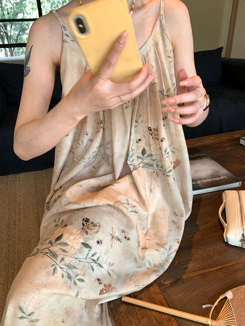 【現貨】im向 江南仲夏天新中式清冷印花吊帶裙度假風無袖洋裝