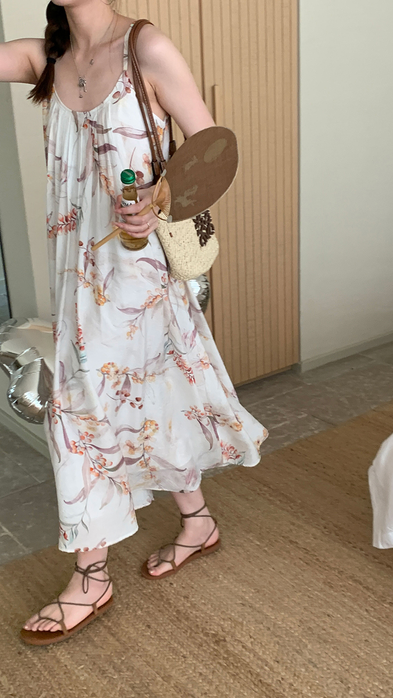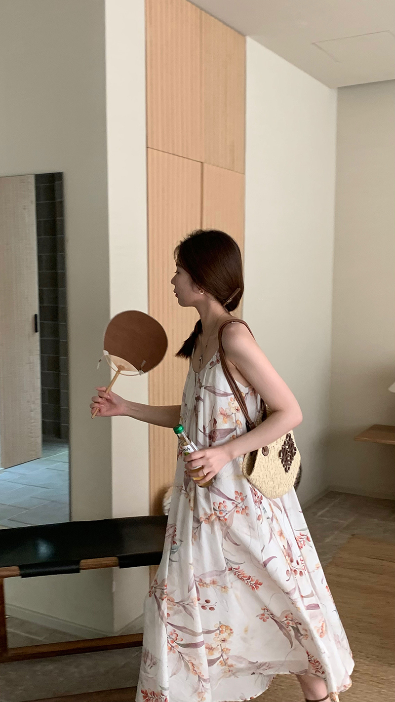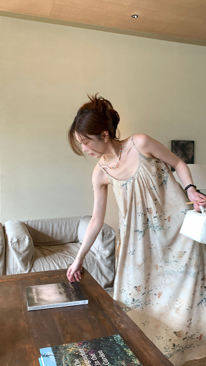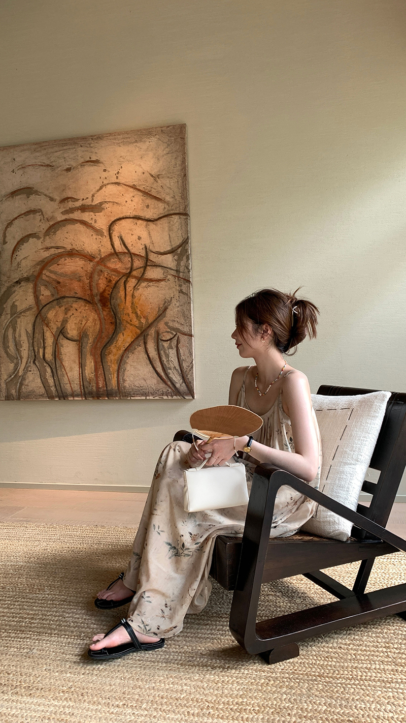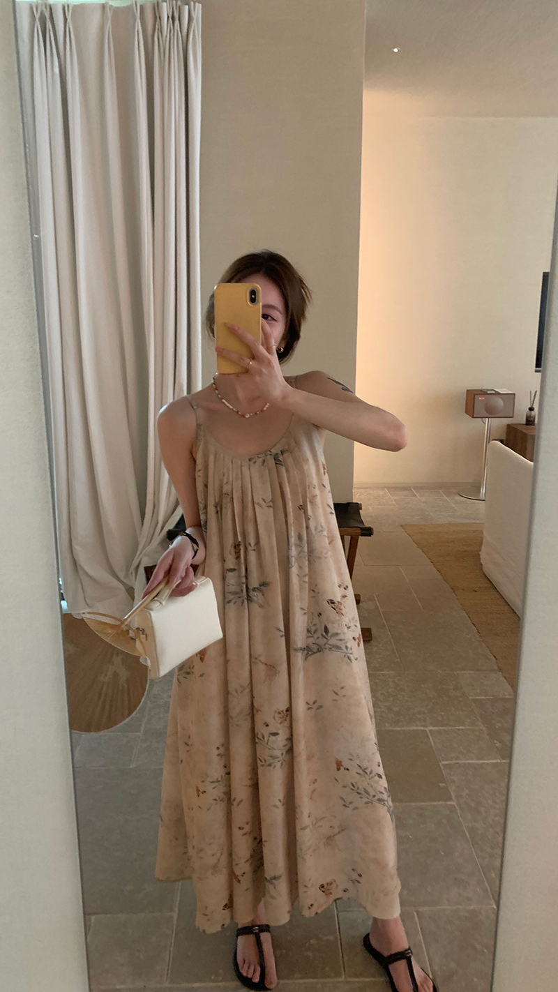 【現貨】im向 江南仲夏天新中式清冷印花吊帶裙度假風無袖洋裝