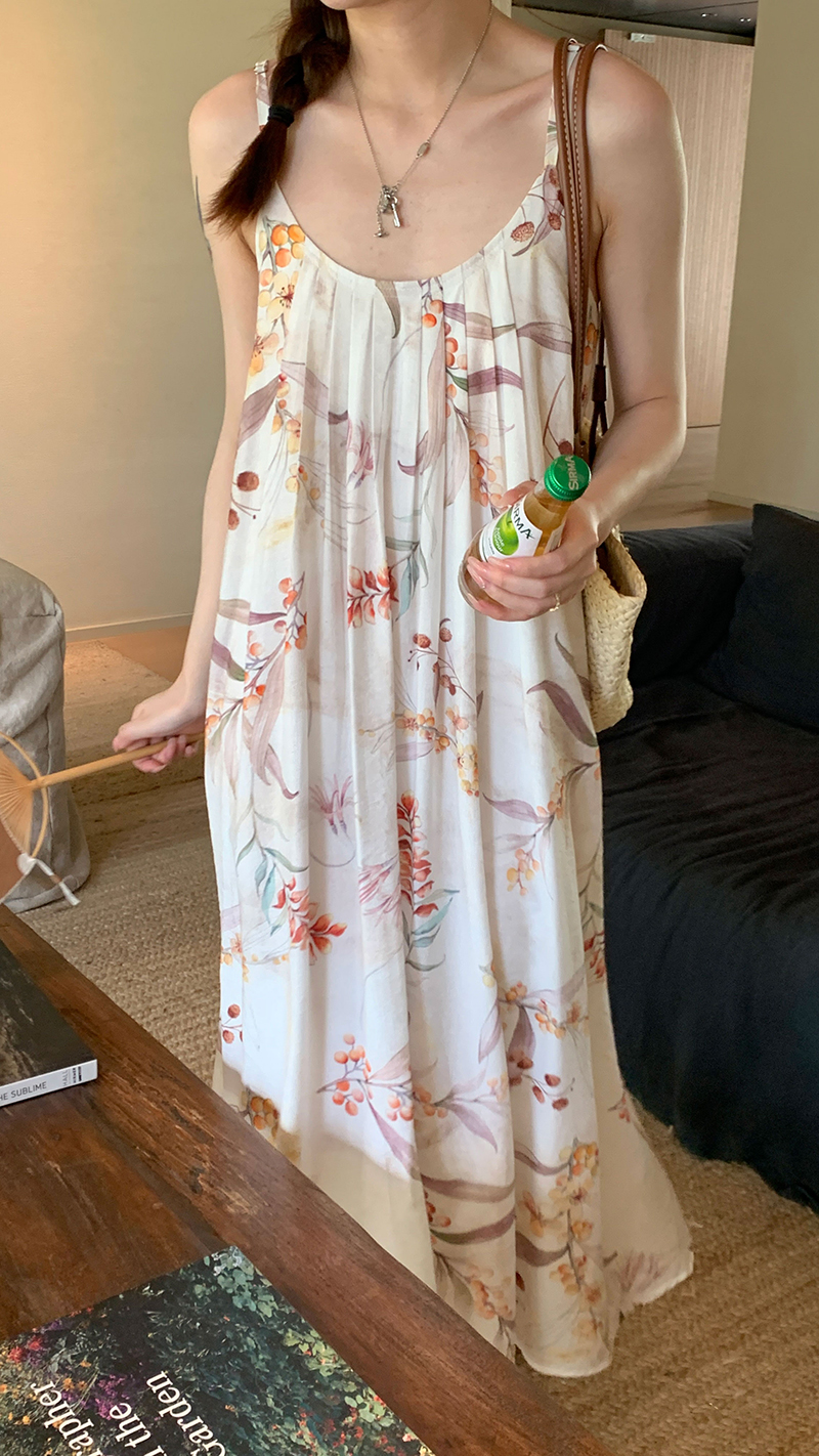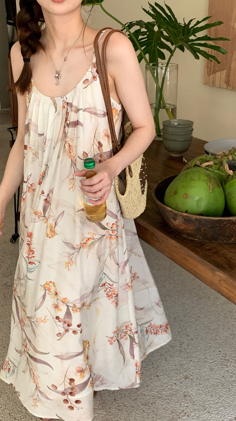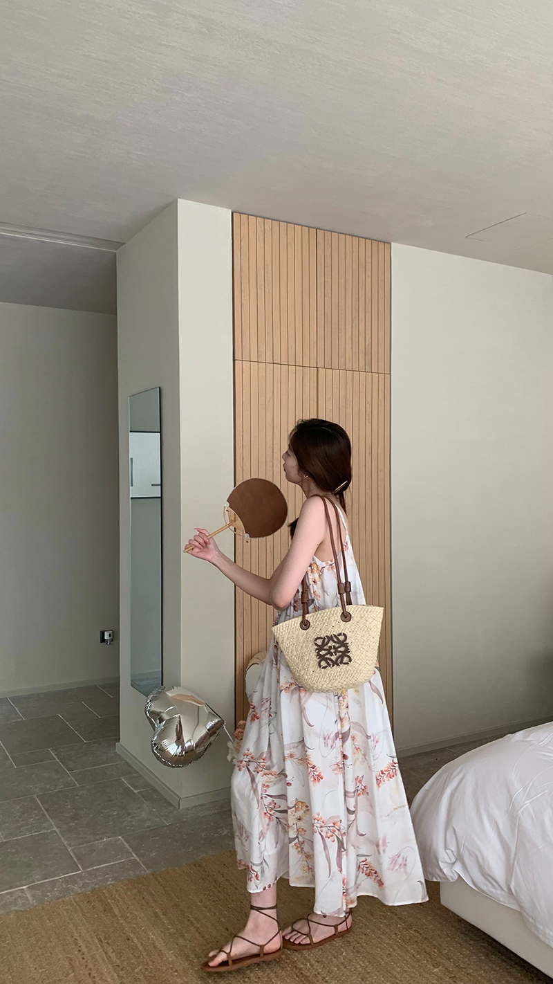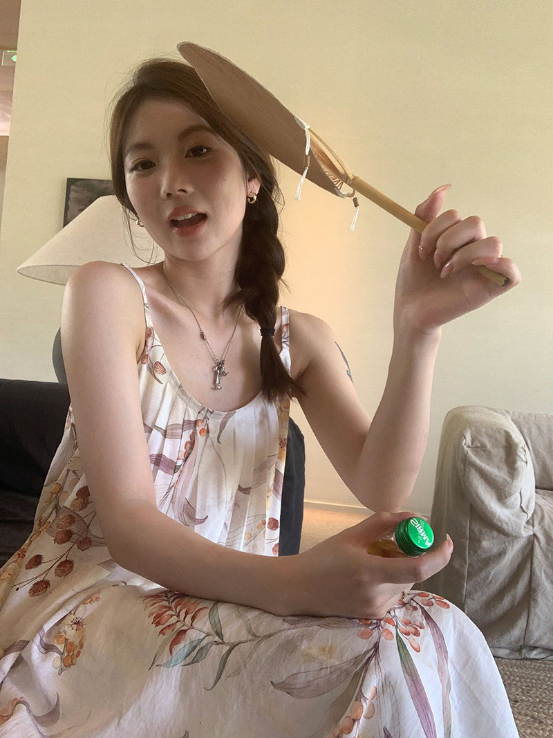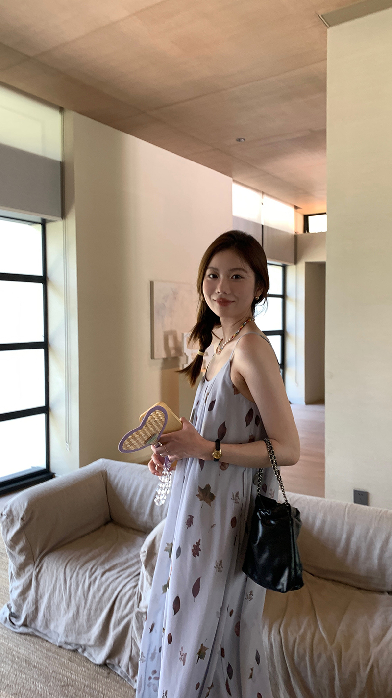 【現貨】im向 江南仲夏天新中式清冷印花吊帶裙度假風無袖洋裝