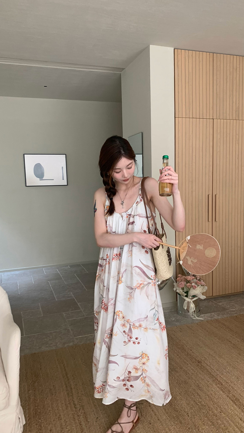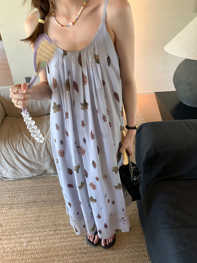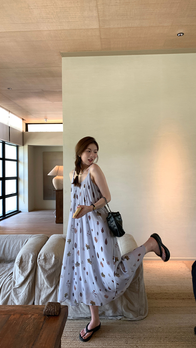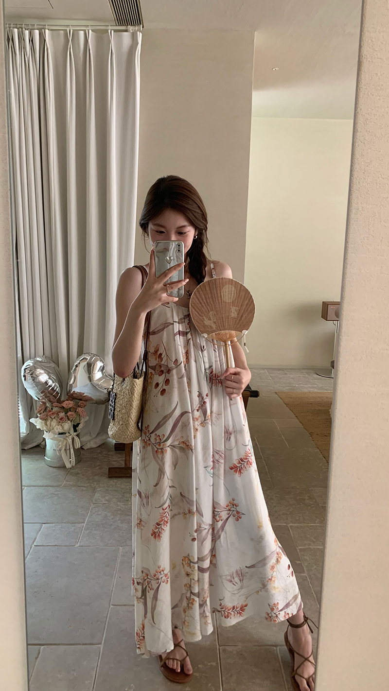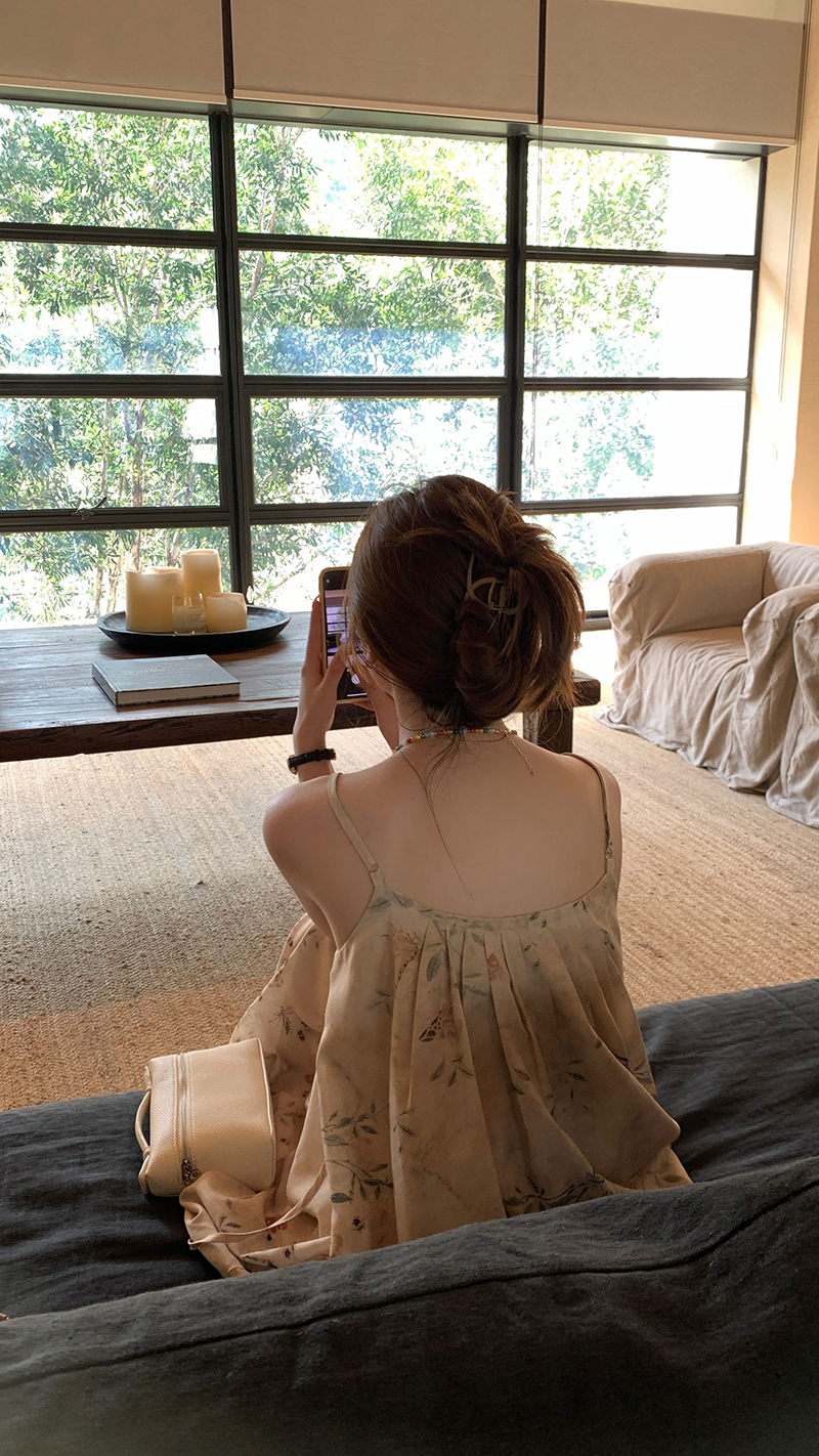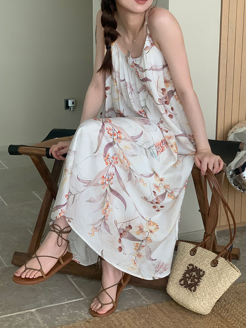 【現貨】im向 江南仲夏天新中式清冷印花吊帶裙度假風無袖洋裝