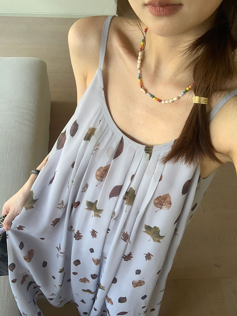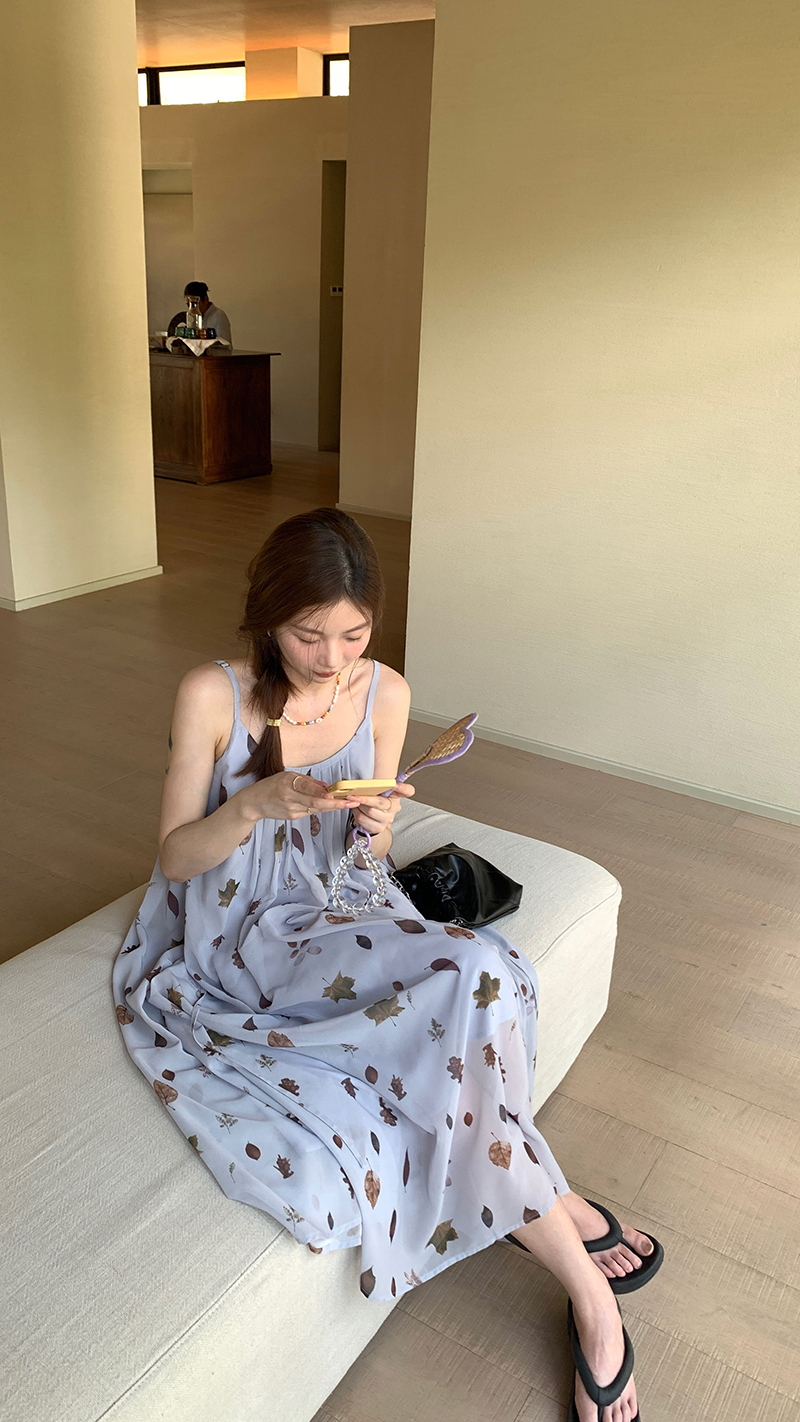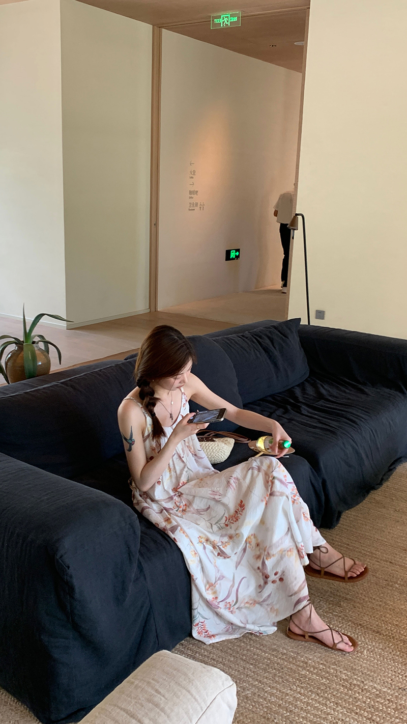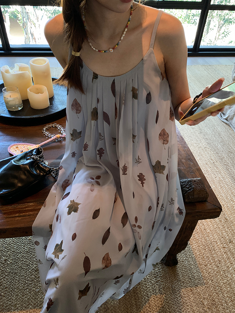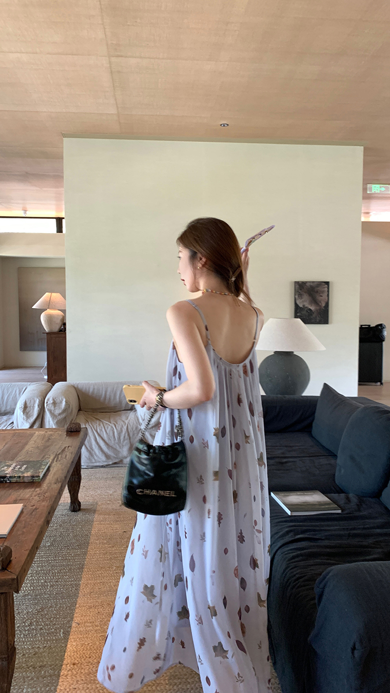 【現貨】im向 江南仲夏天新中式清冷印花吊帶裙度假風無袖洋裝