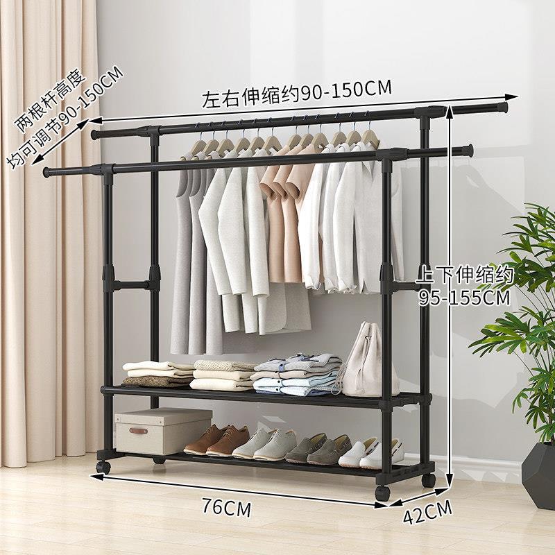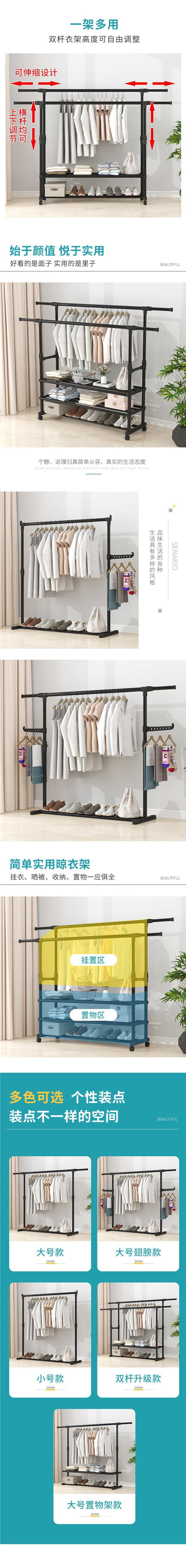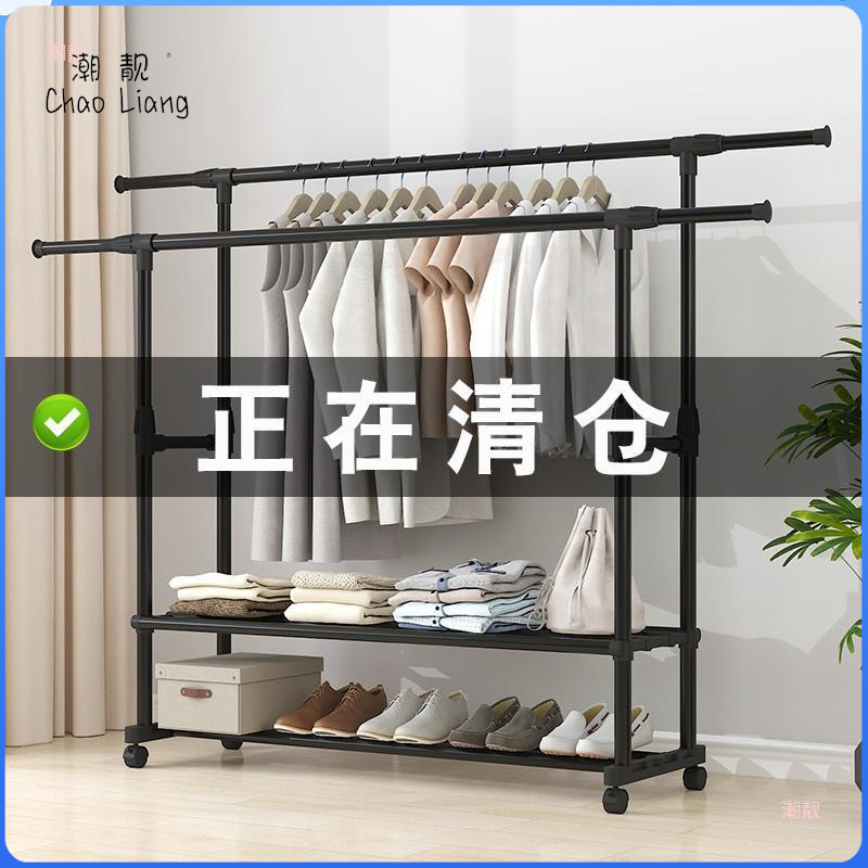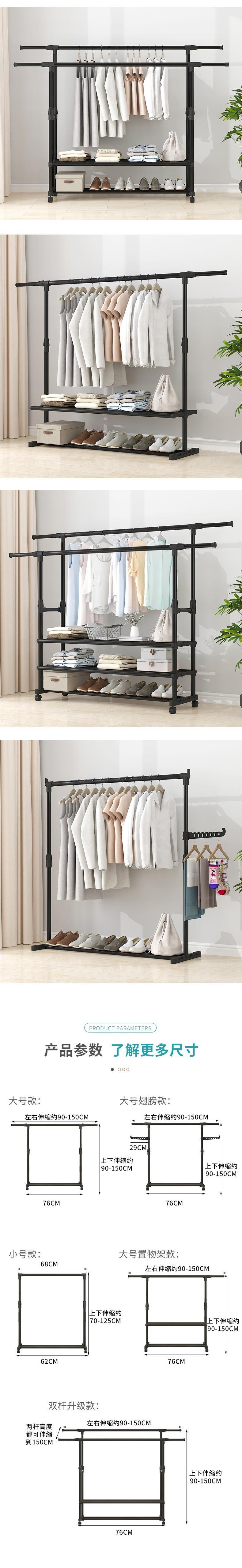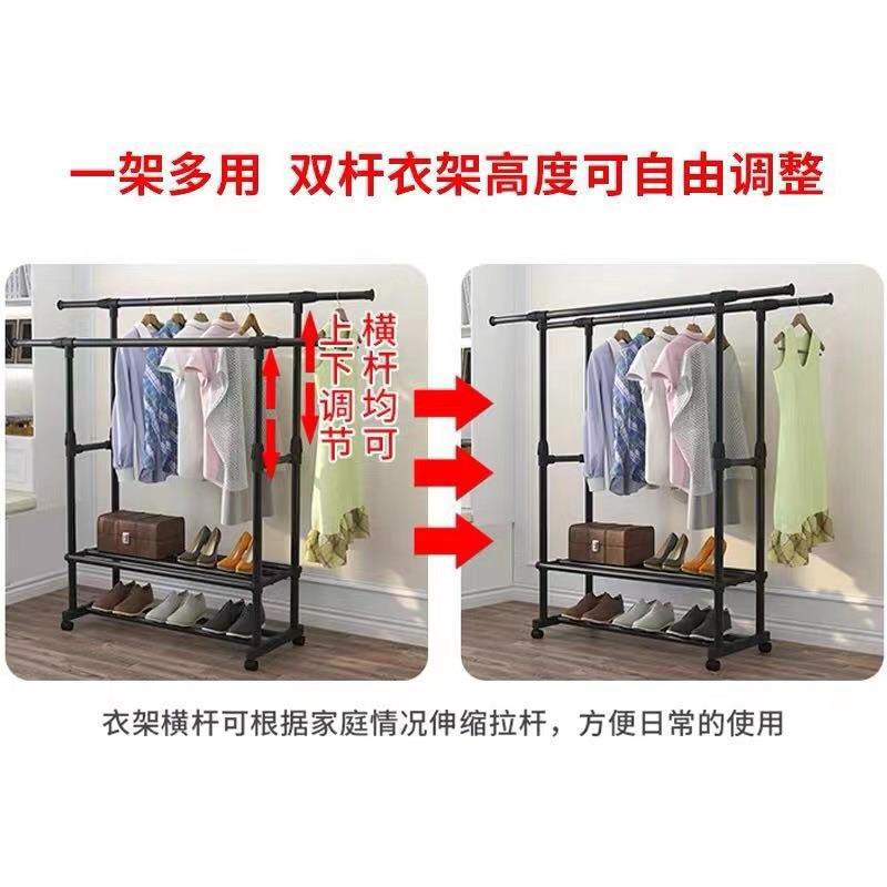 家用衣架落地加厚加粗卧室内结实耐用挂衣架子双层感移动带轮