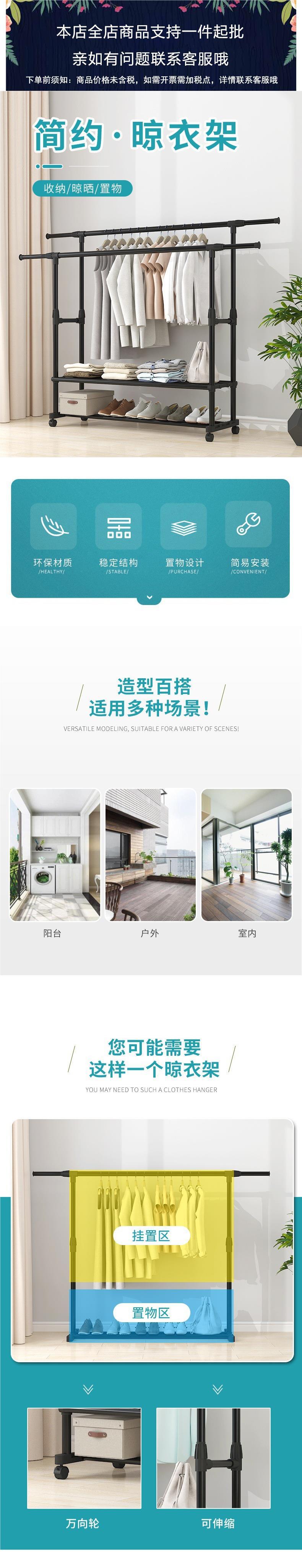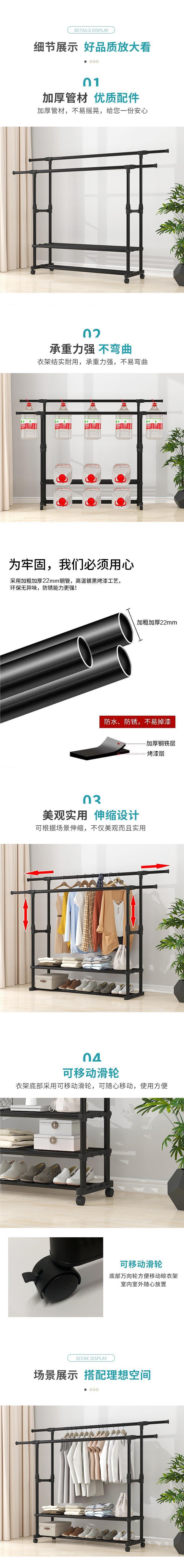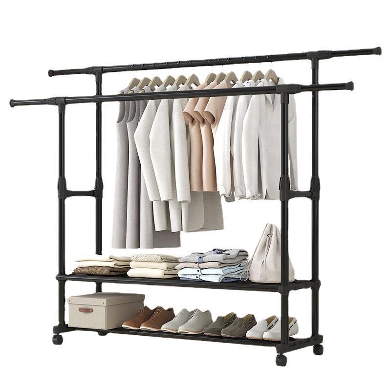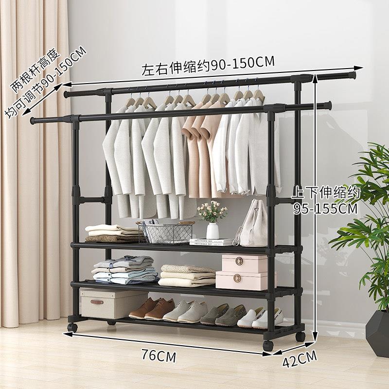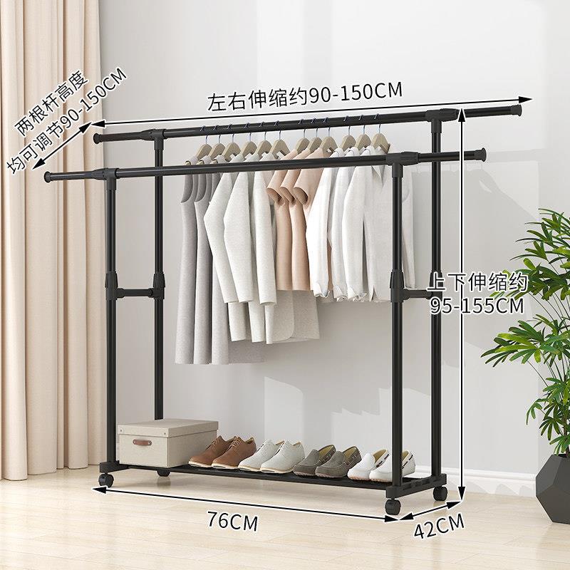 家用衣架落地加厚加粗卧室内结实耐用挂衣架子双层感移动带轮