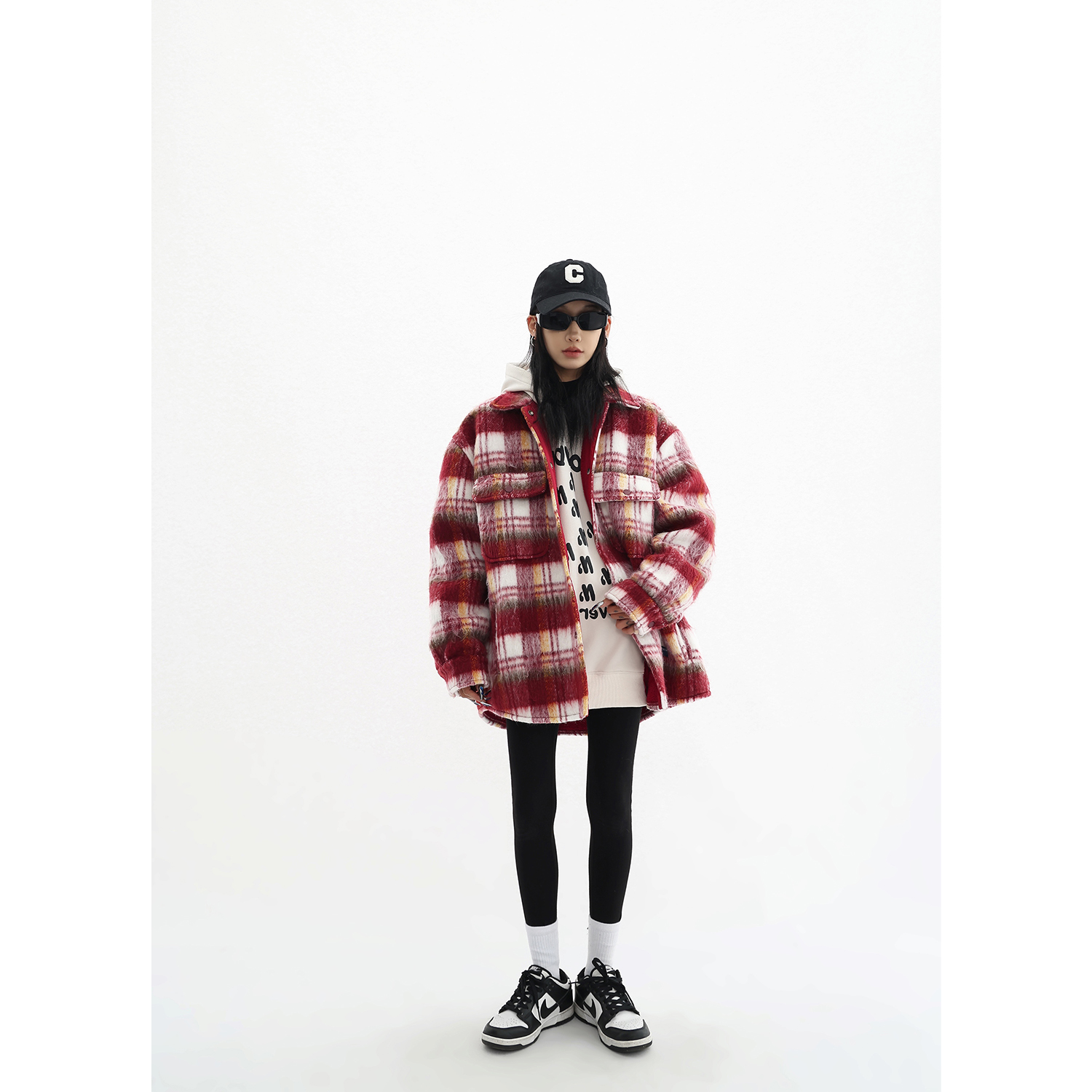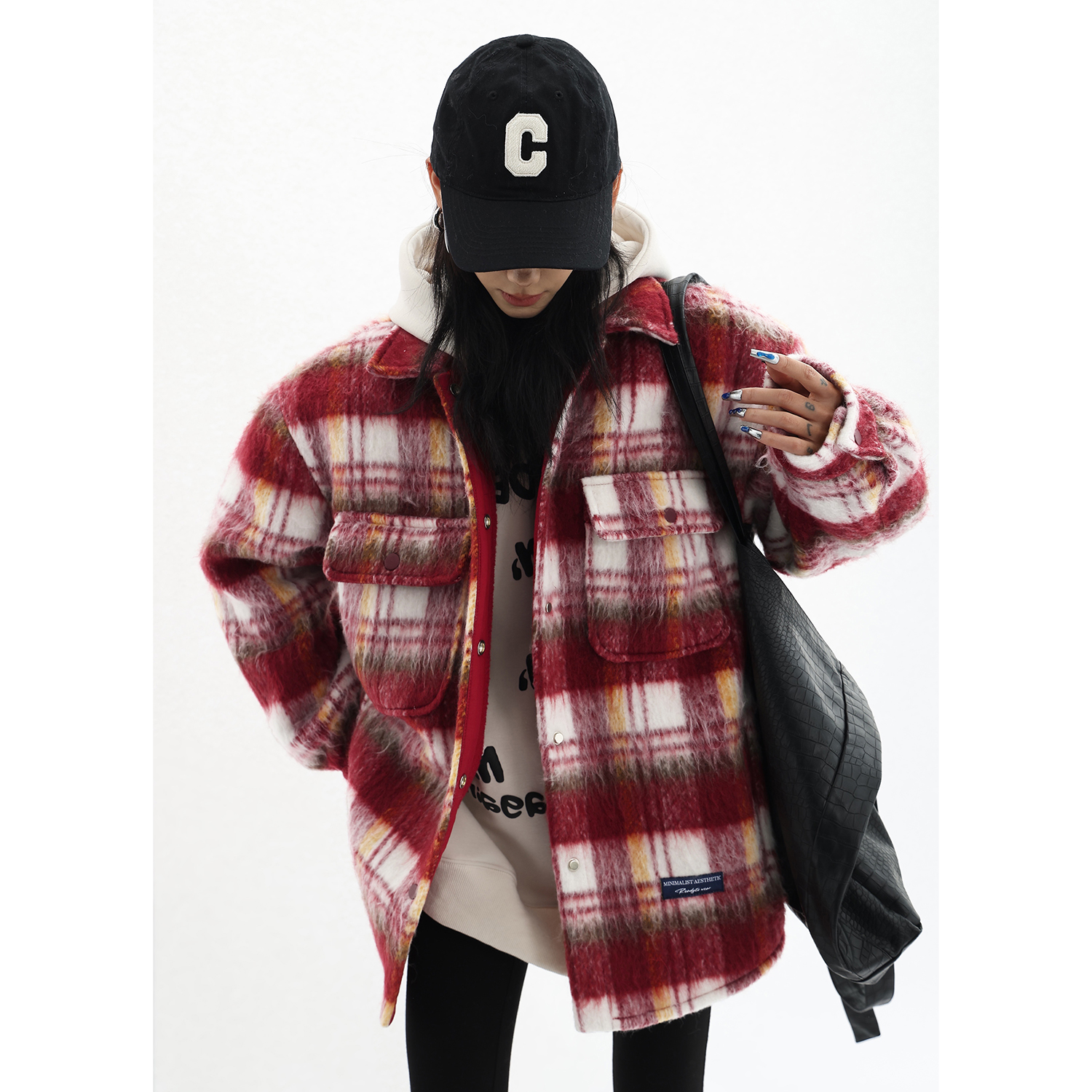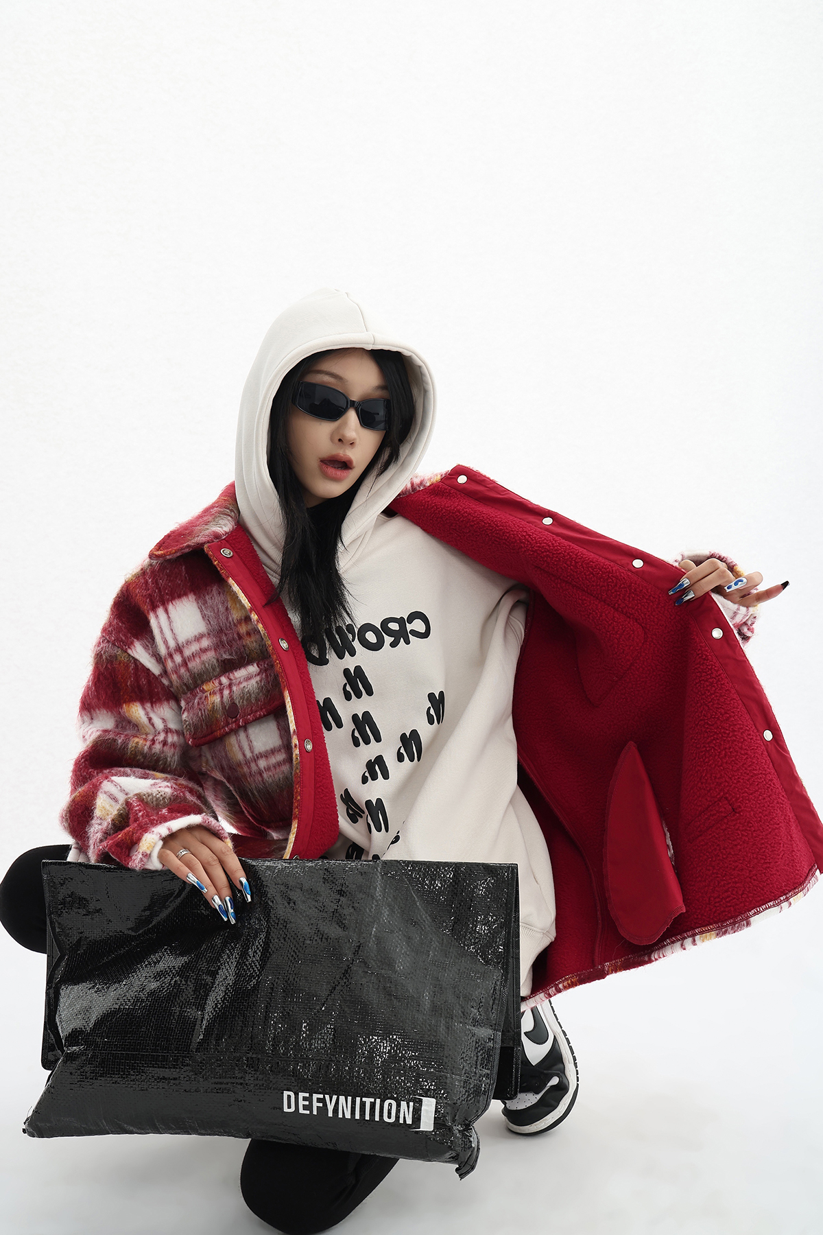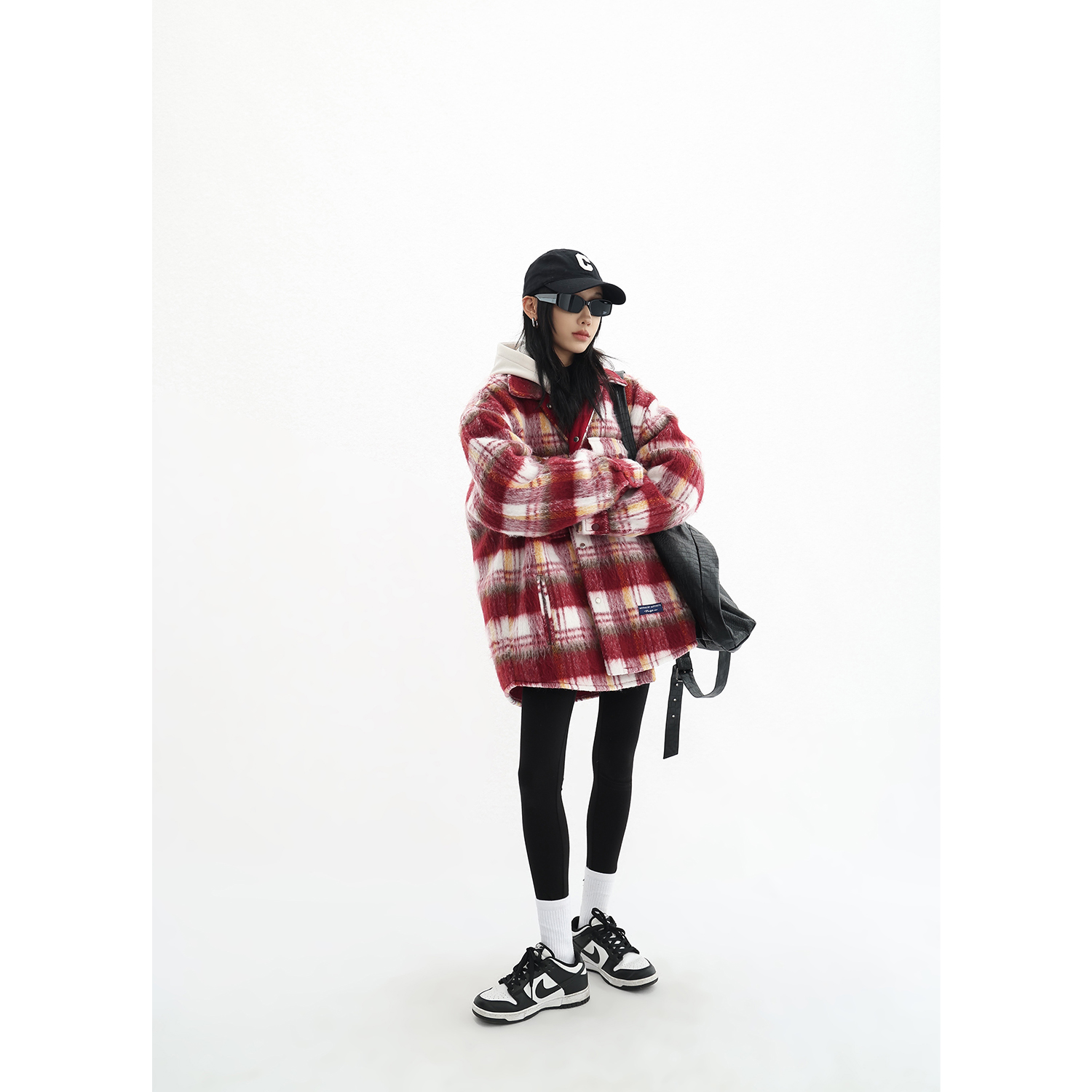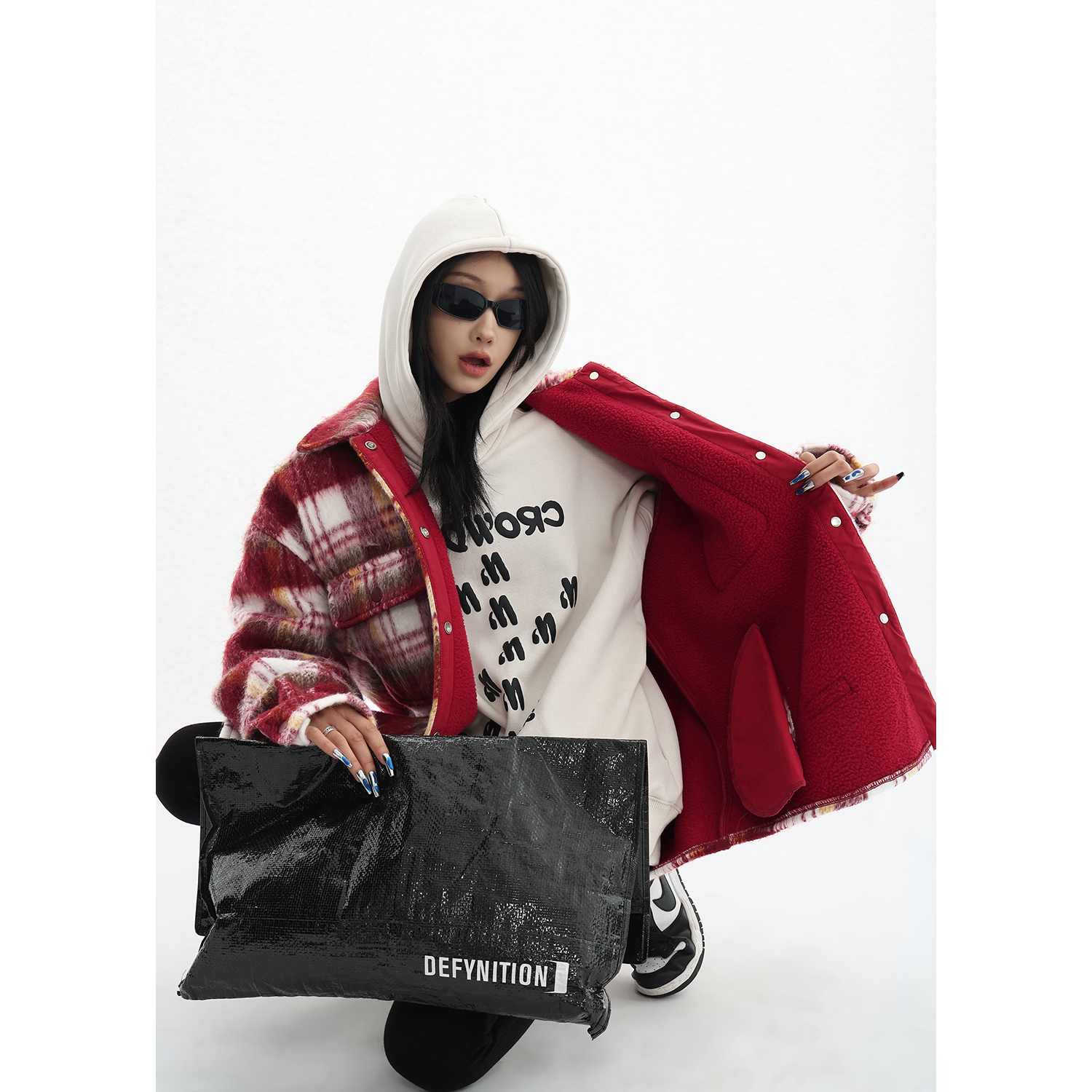 Acestudios 新年粗呢格子外套女2023春秋新款寬鬆紅色搖粒絨夾克