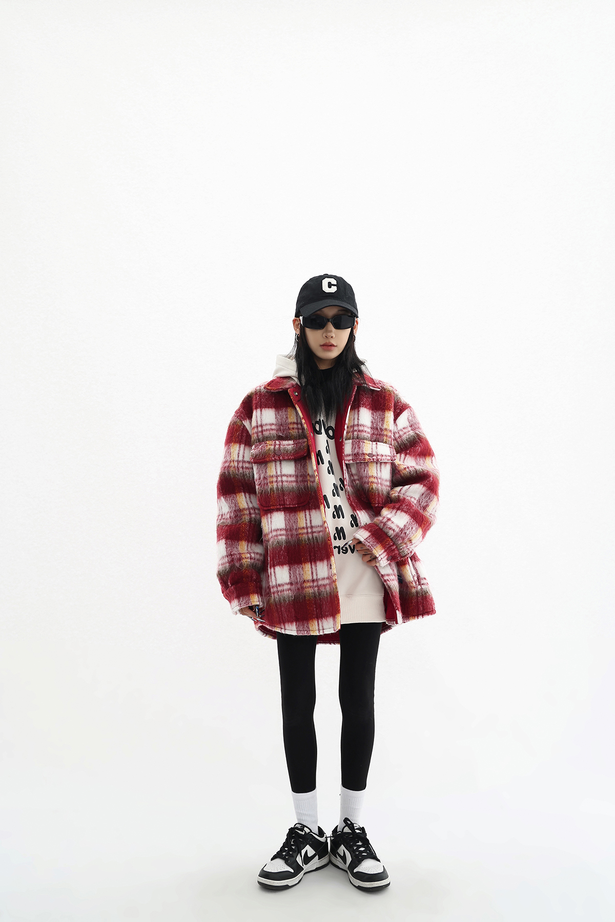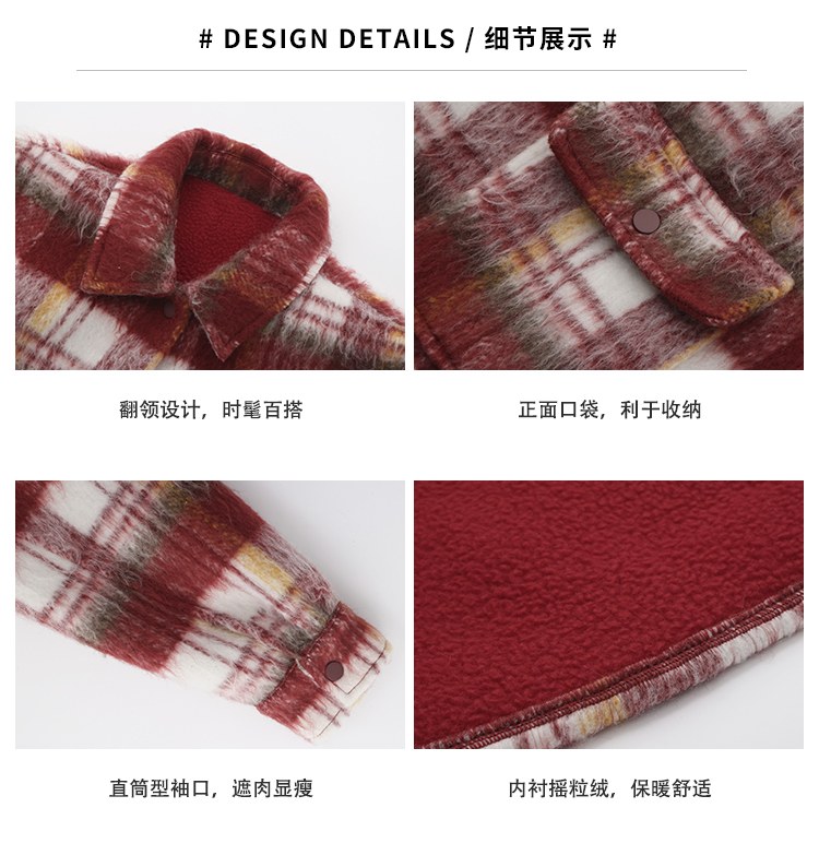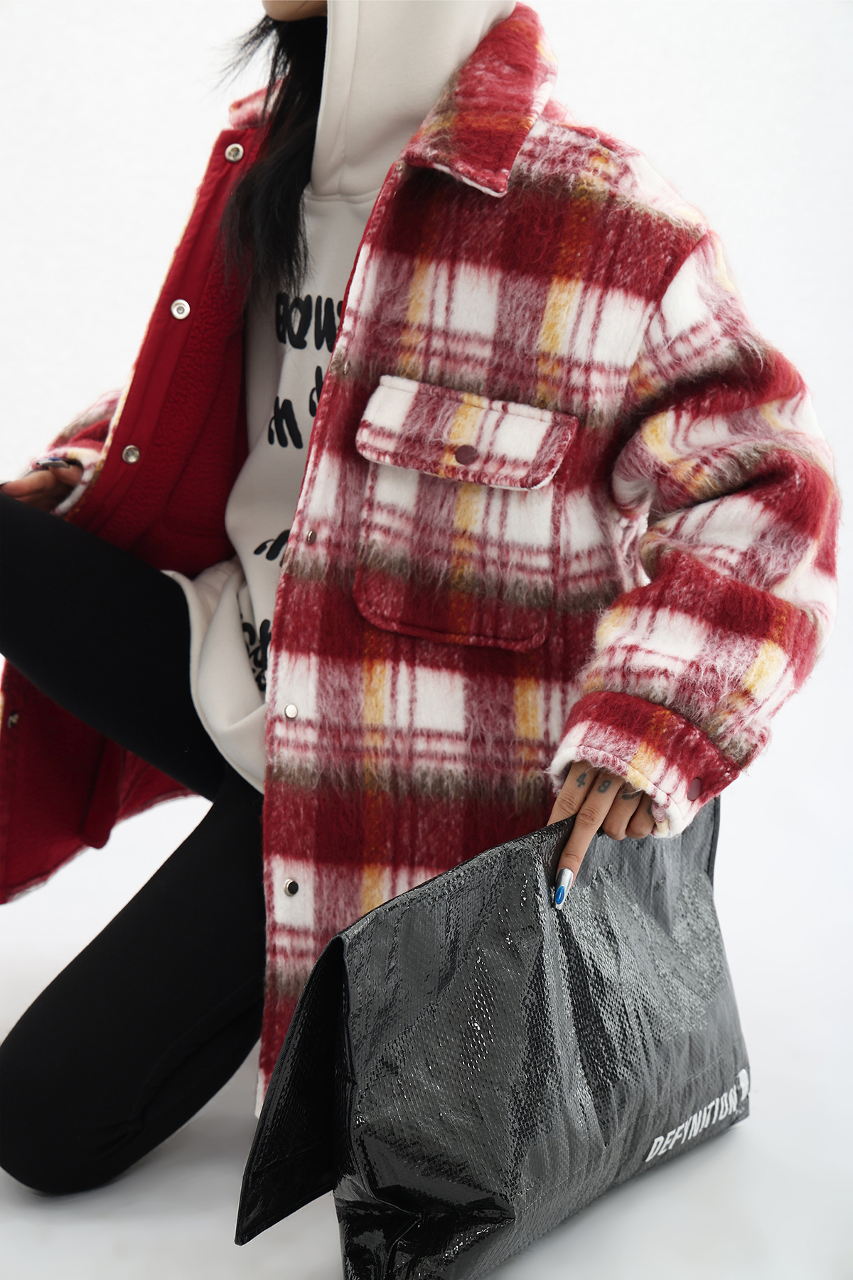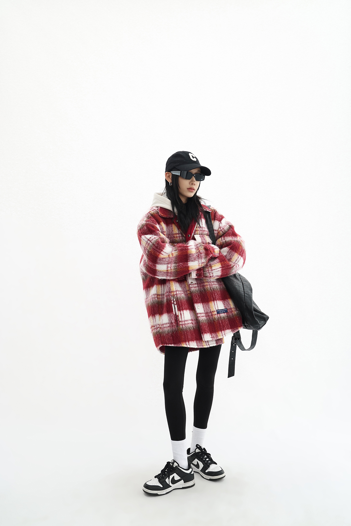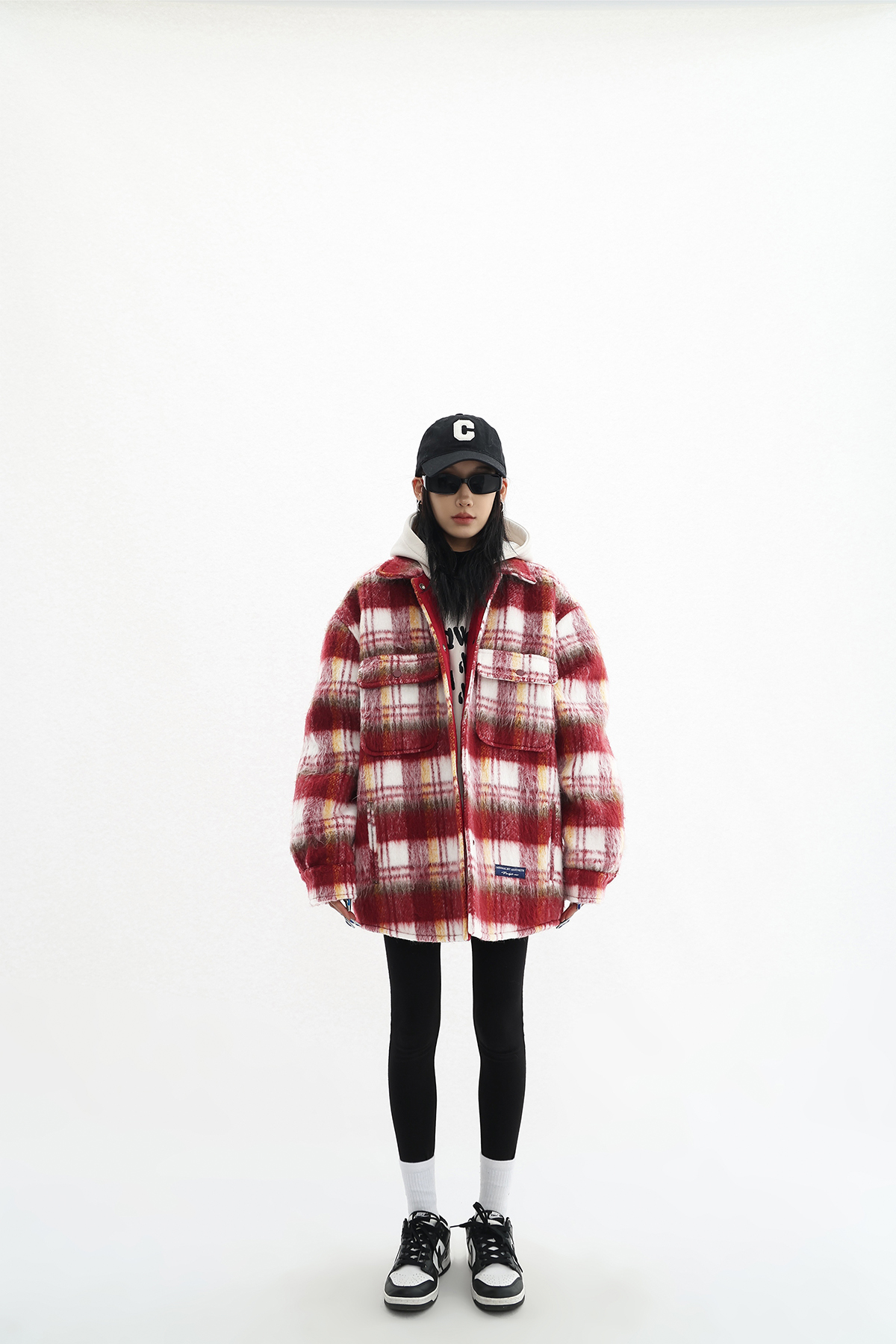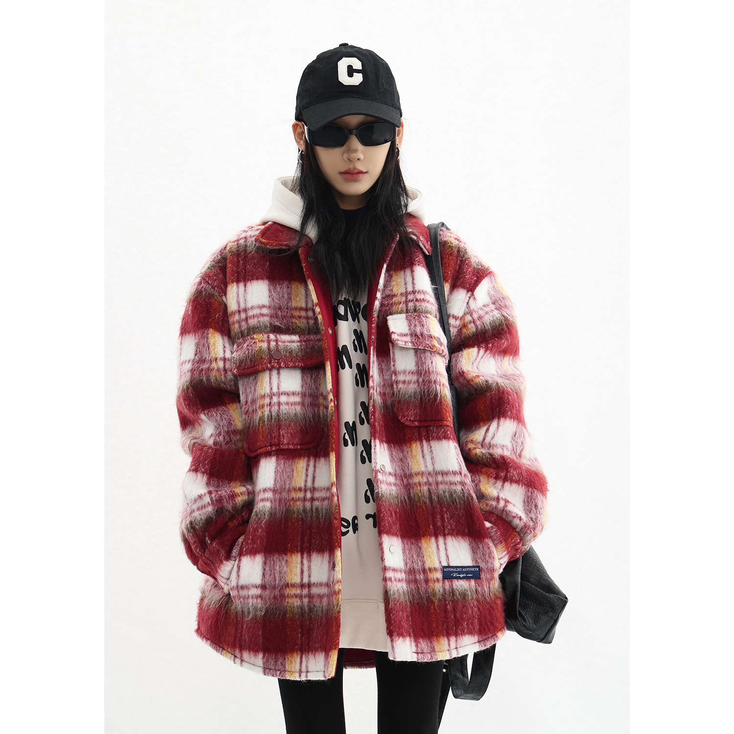 Acestudios 新年粗呢格子外套女2023春秋新款寬鬆紅色搖粒絨夾克