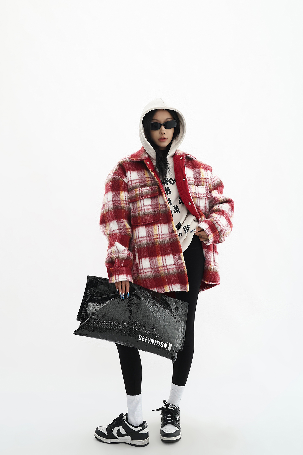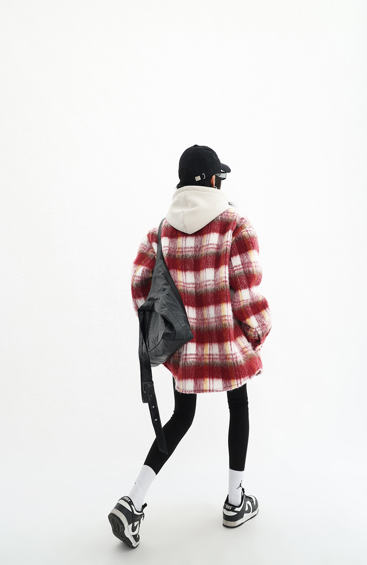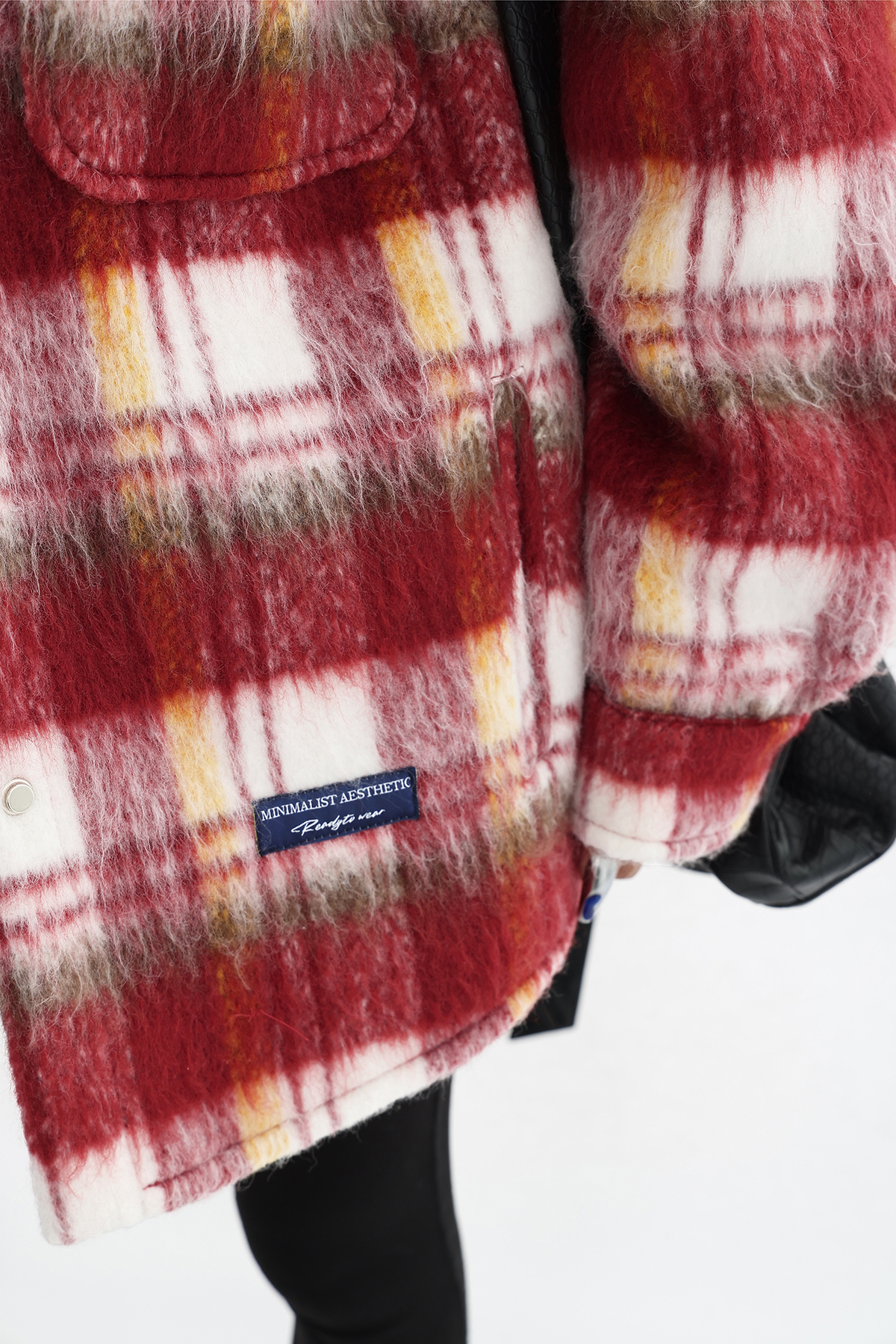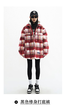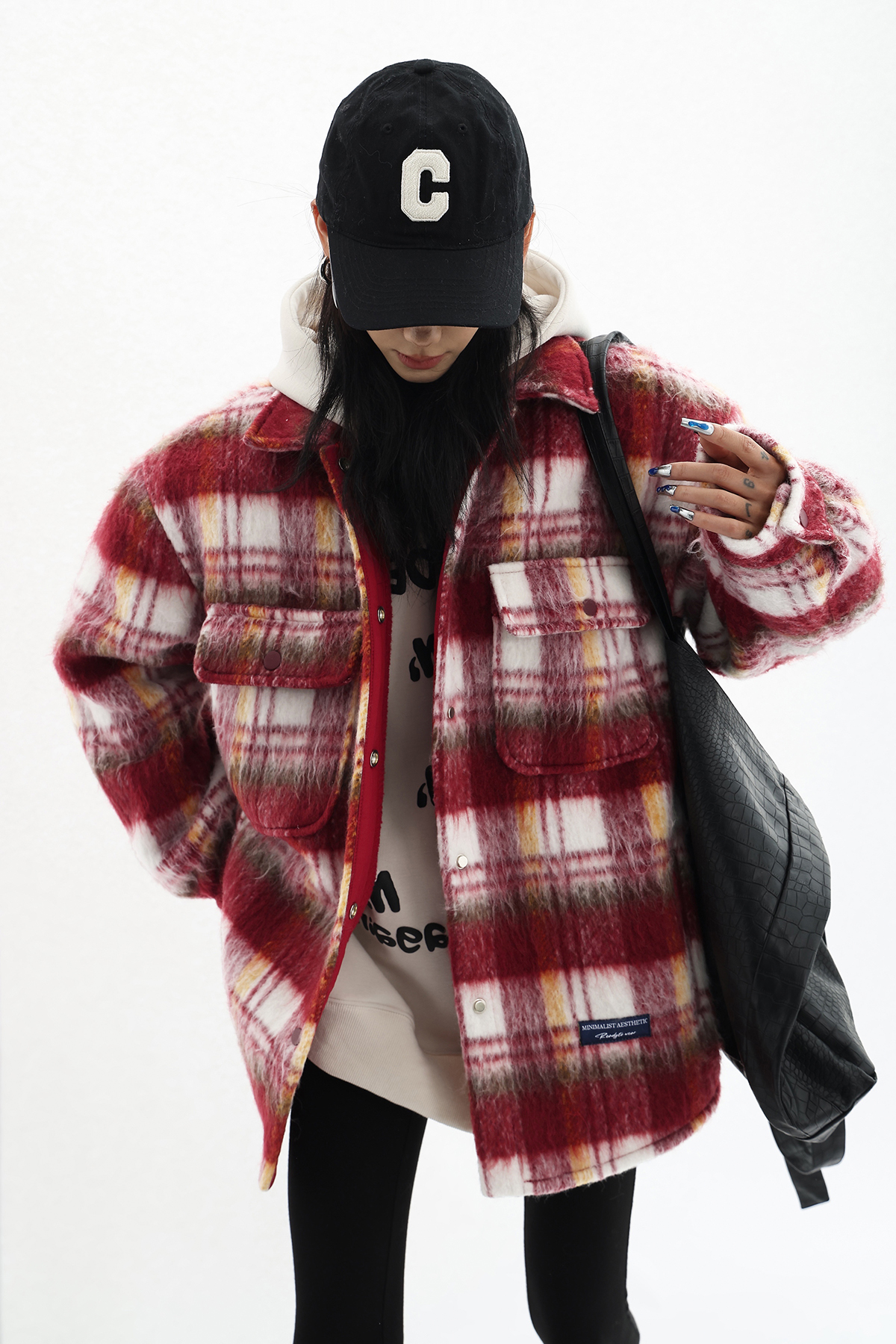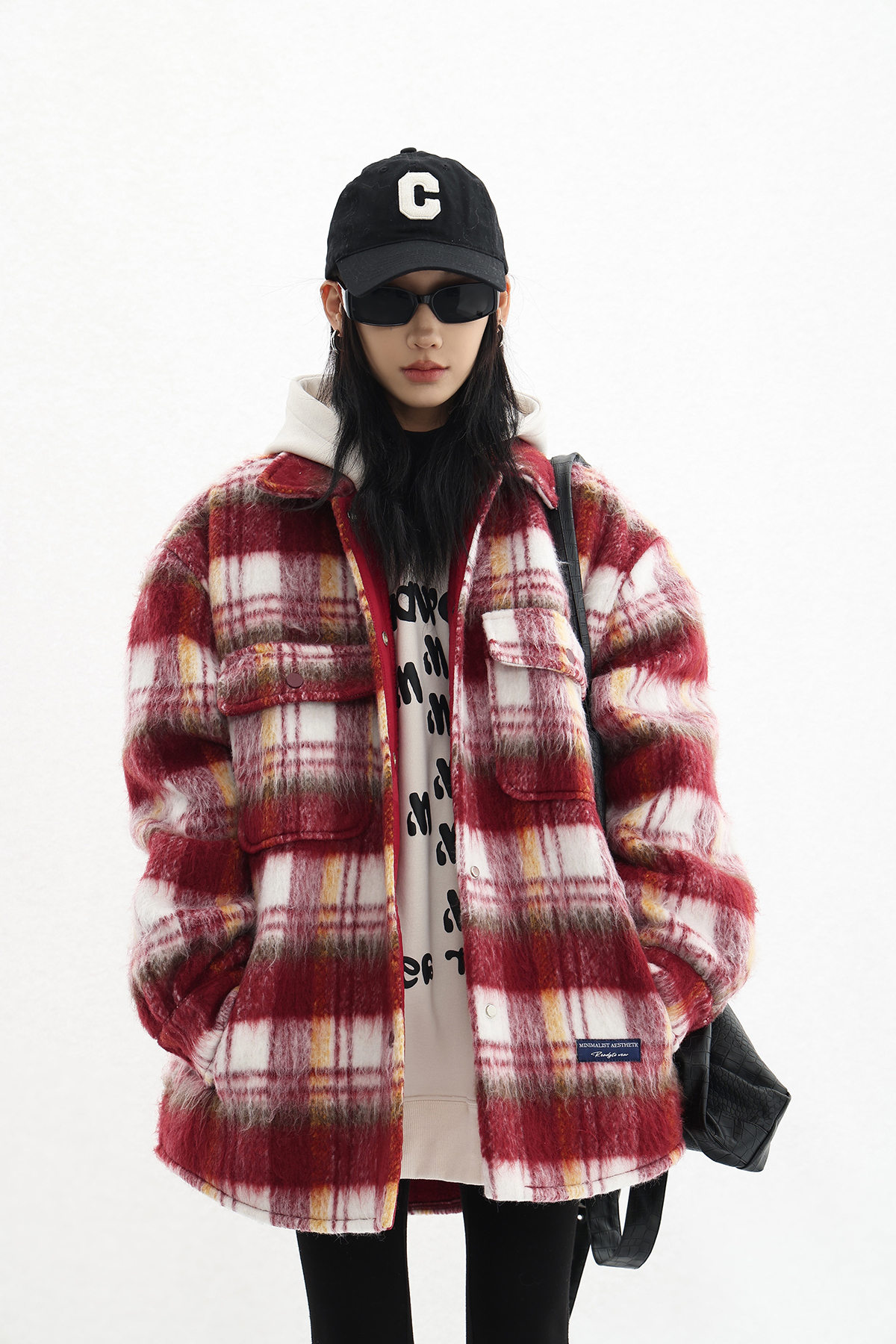 Acestudios 新年粗呢格子外套女2023春秋新款寬鬆紅色搖粒絨夾克