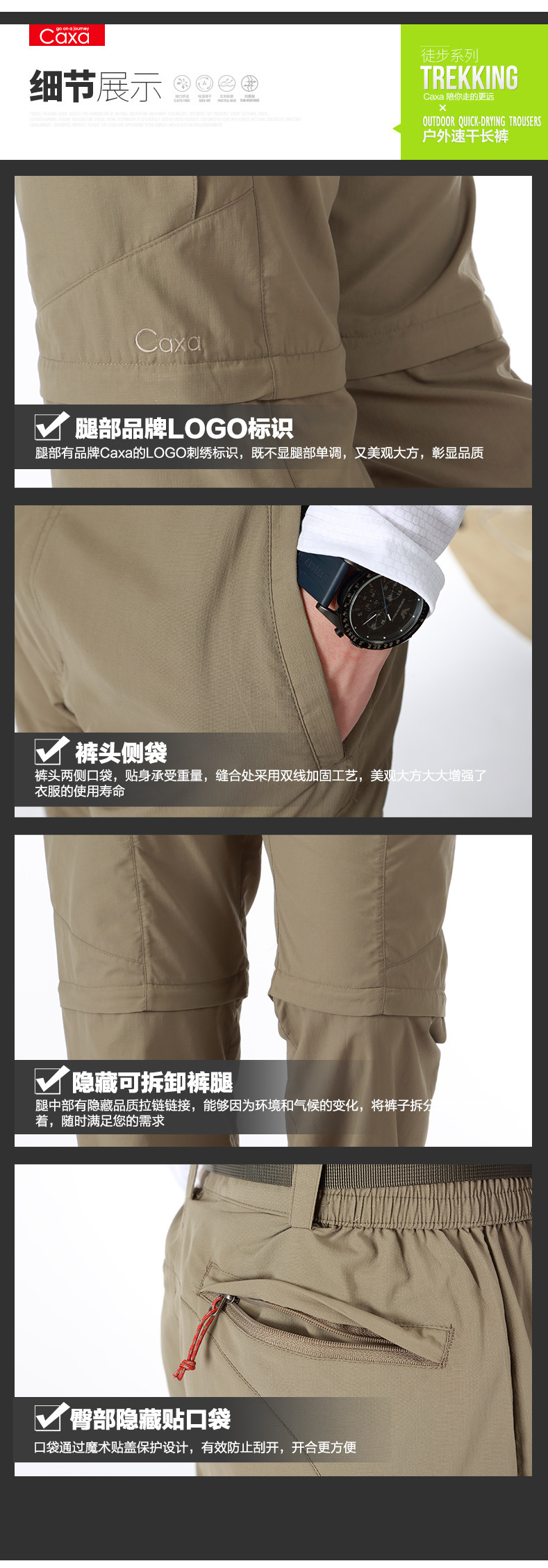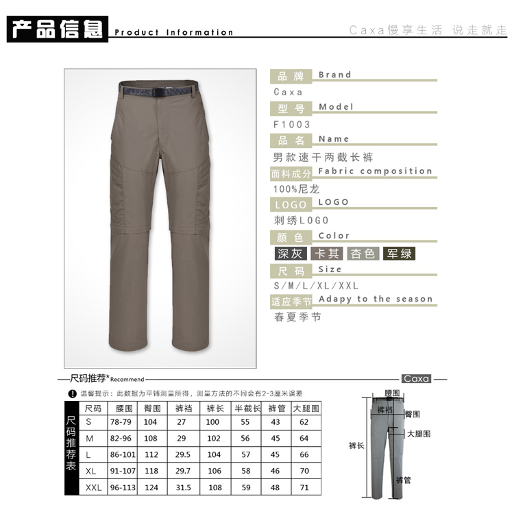 CAXA速乾長褲 兩截五分 多袋拉鍊 橡筋繩收腳 尺碼正常 面料結實