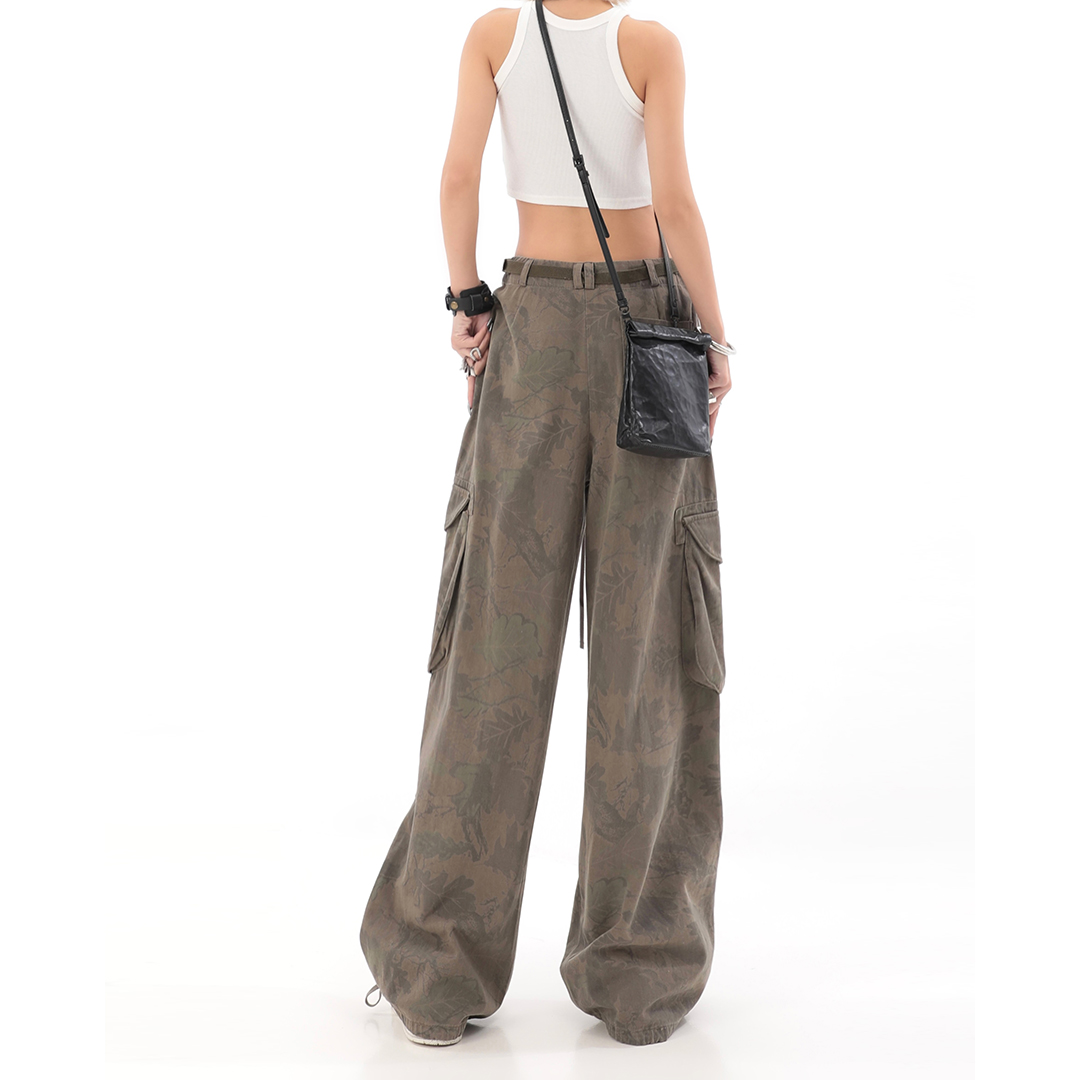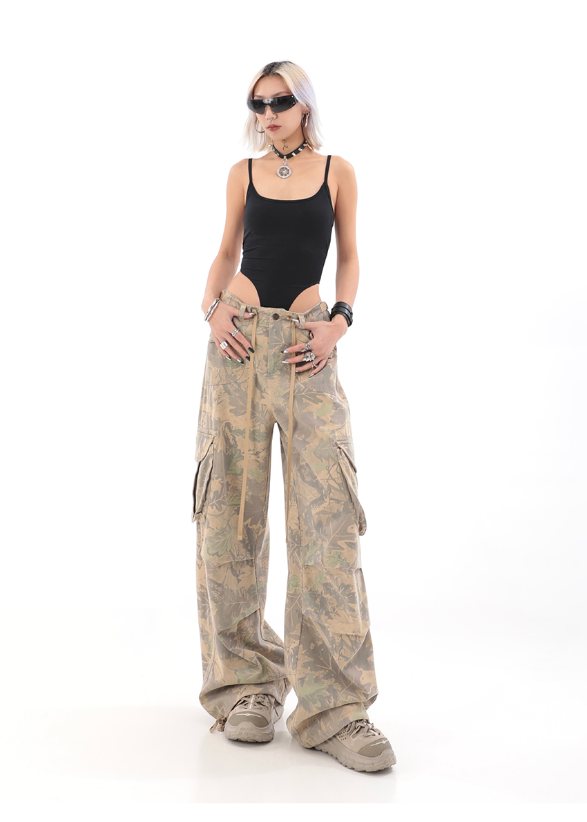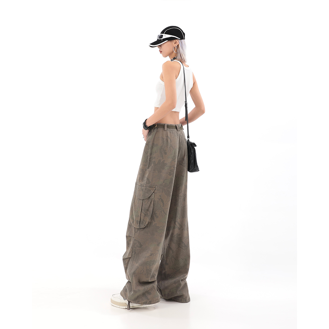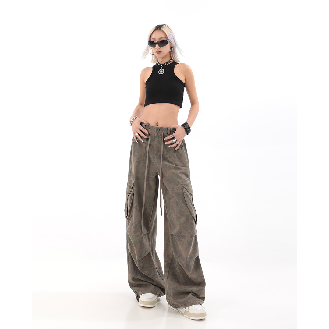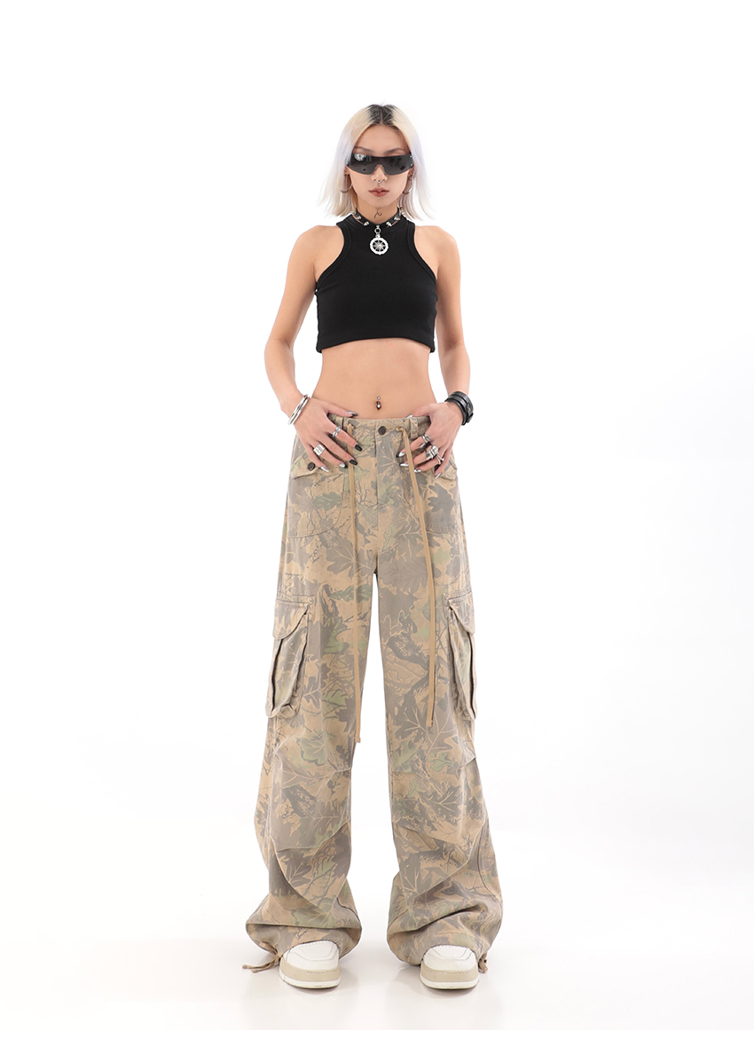 秋季辣妹迷彩工裝褲女美式高街hiphop嘻哈束腳闊腿休閒褲子潮ins