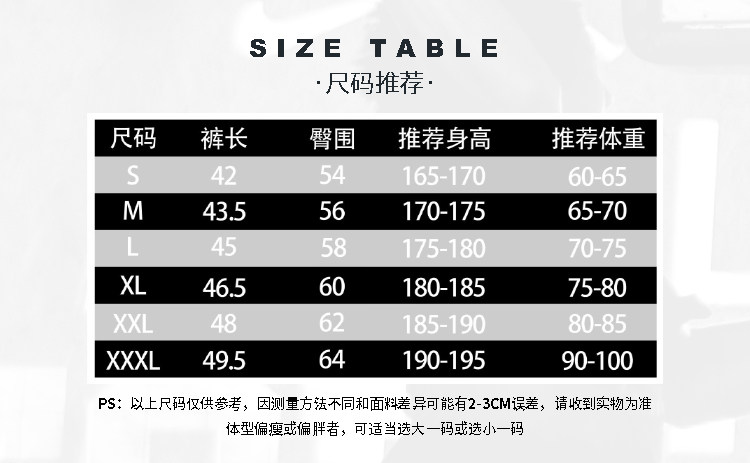 尺碼 S(165-170/60-65),M(170-175/65-70),L(175-180/70-75),XL(180-185/75-80),2XL(185-190/80-85),3XL(190-195/90-100)
