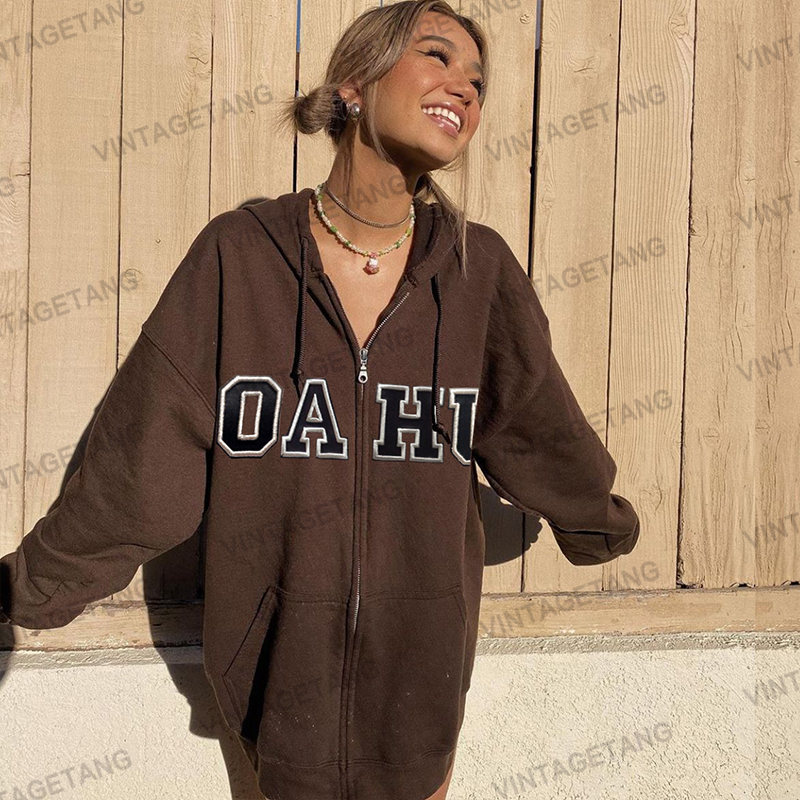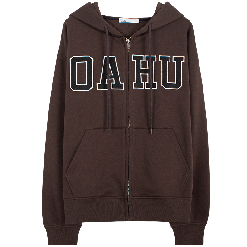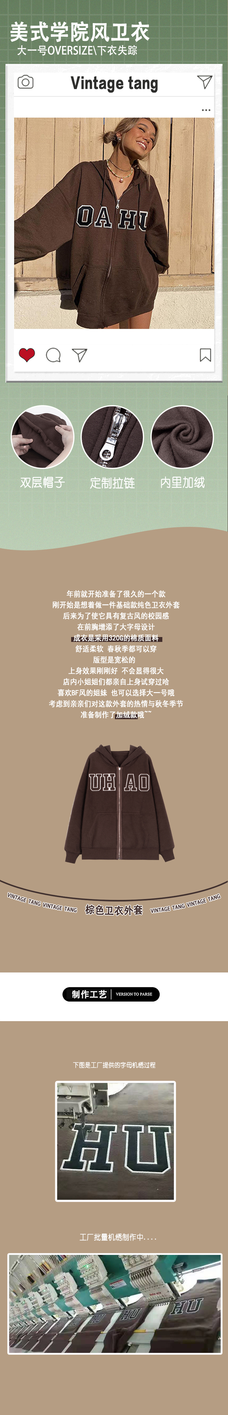 VintageTang美式復古BM深咖啡色拉鍊連帽運動衫外套開衫女秋嘉叄