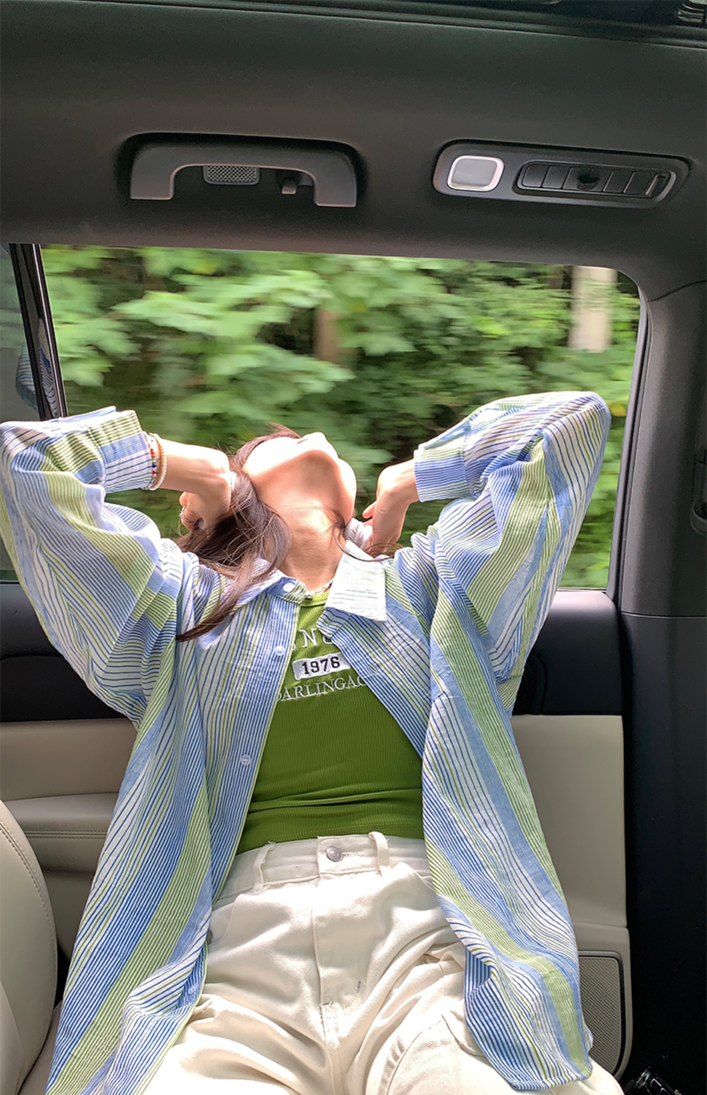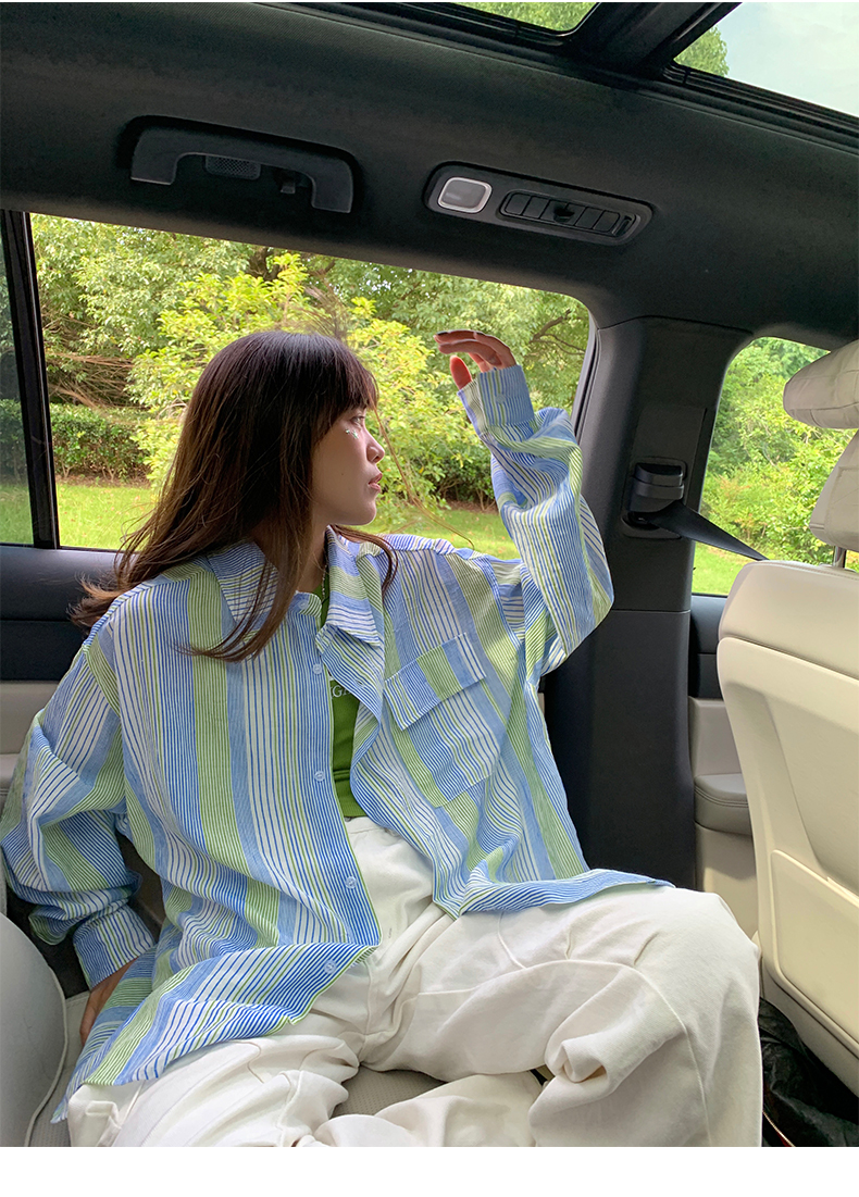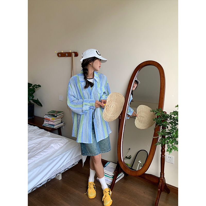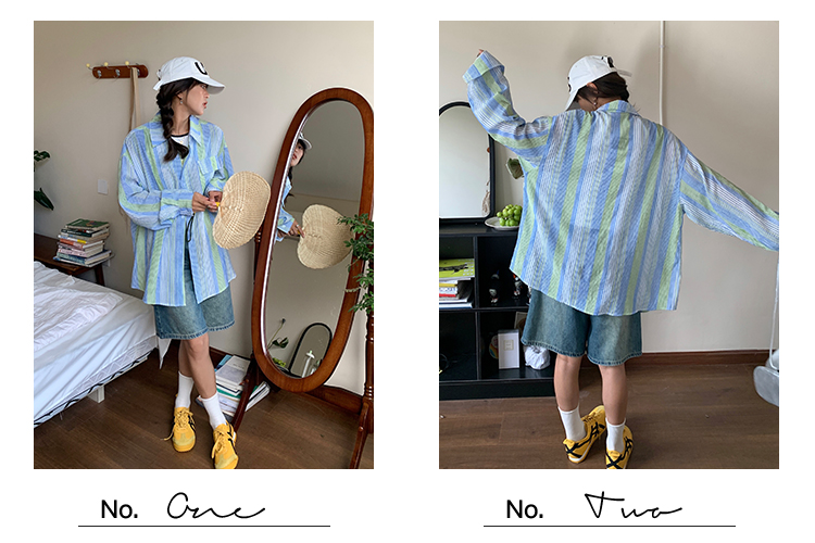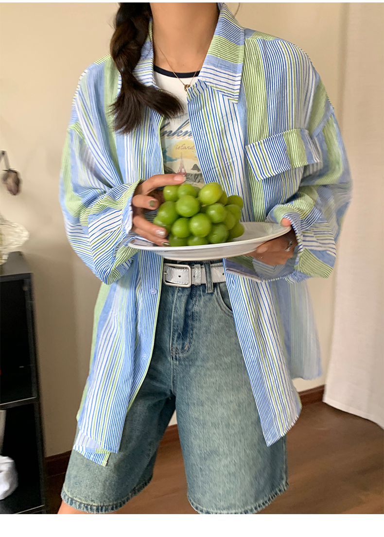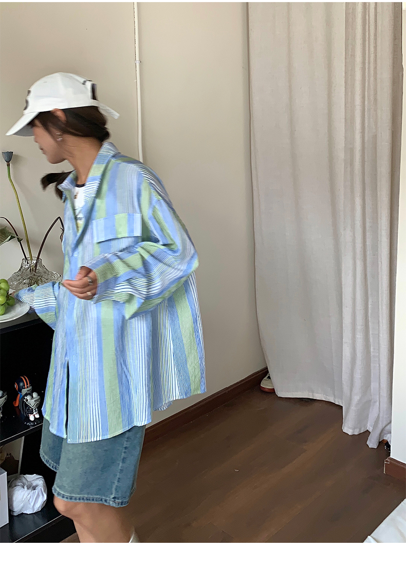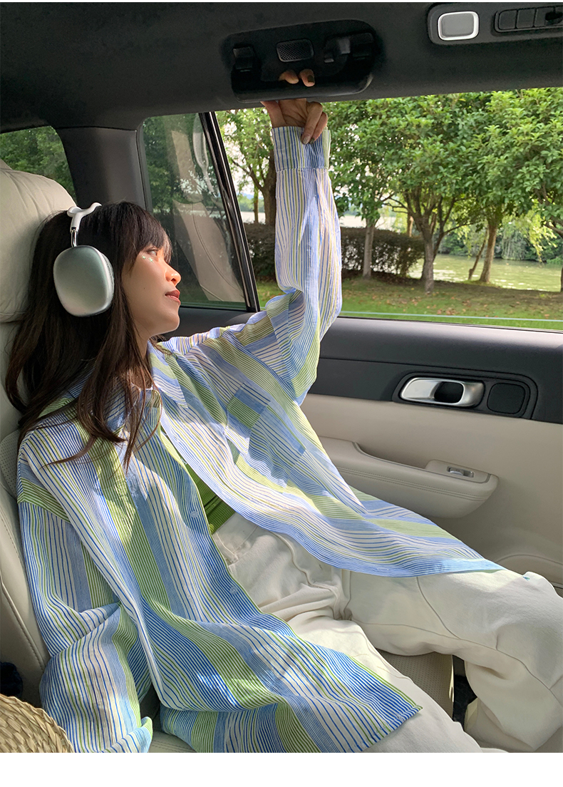 NIDEBLACK豎條紋薄款襯衫外套防曬上衣淺色條紋拼色襯衫23新款女