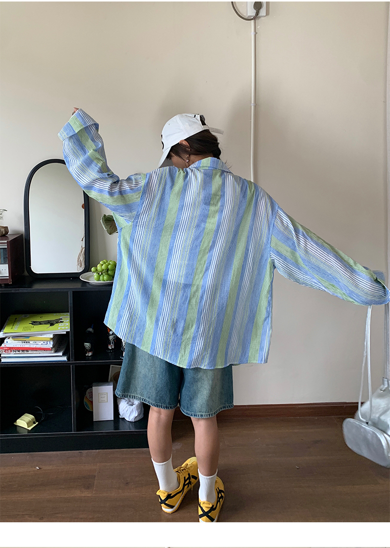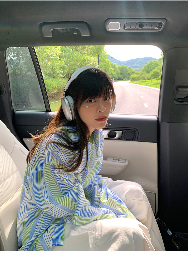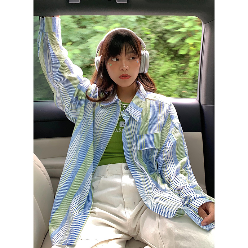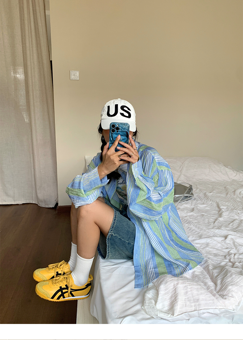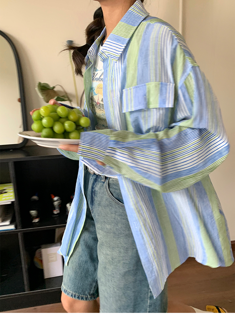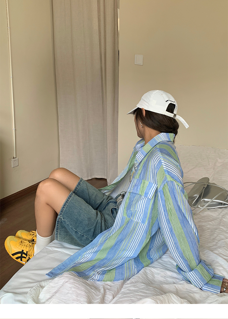NIDEBLACK豎條紋薄款襯衫外套防曬上衣淺色條紋拼色襯衫23新款女