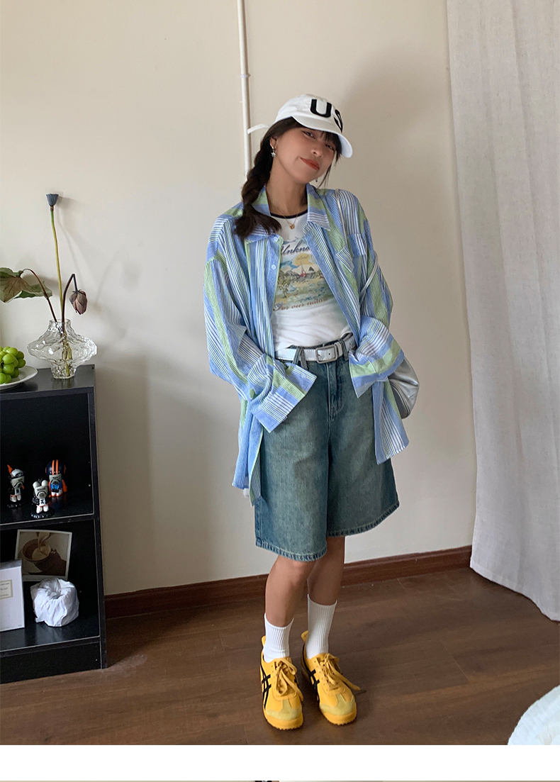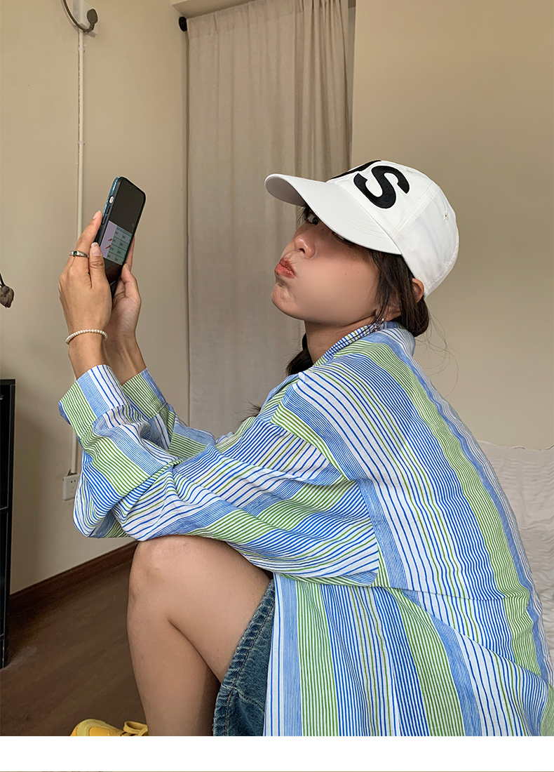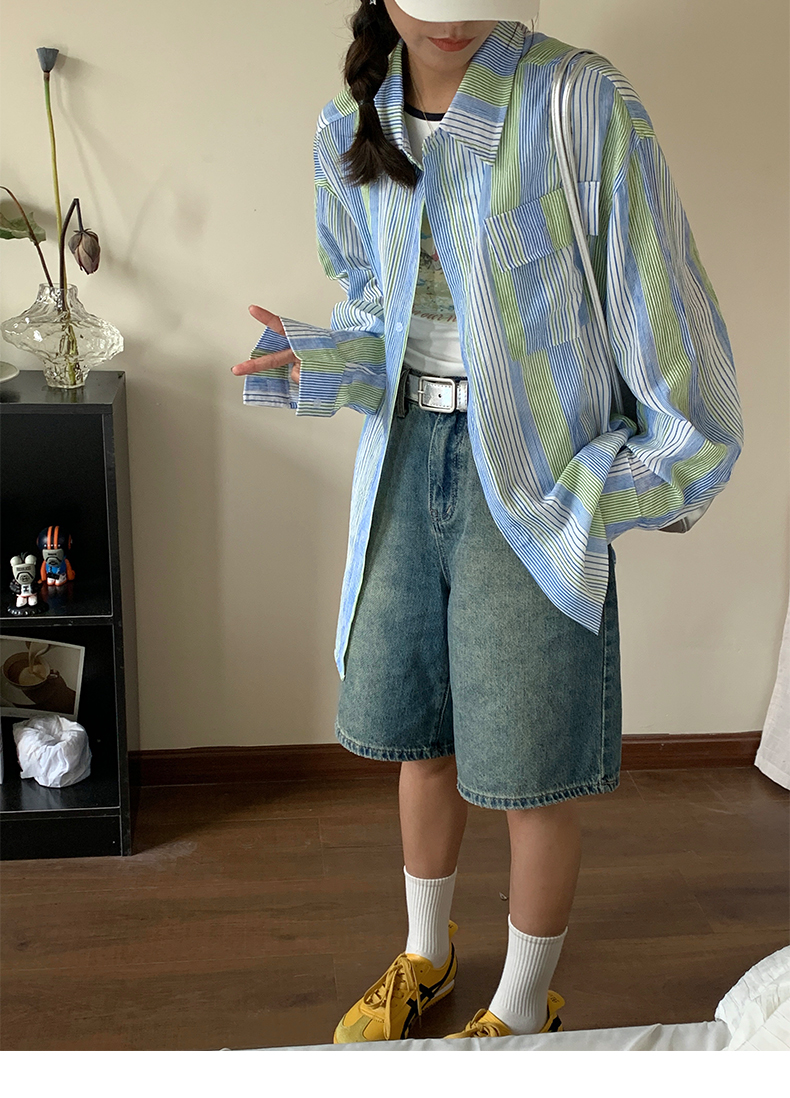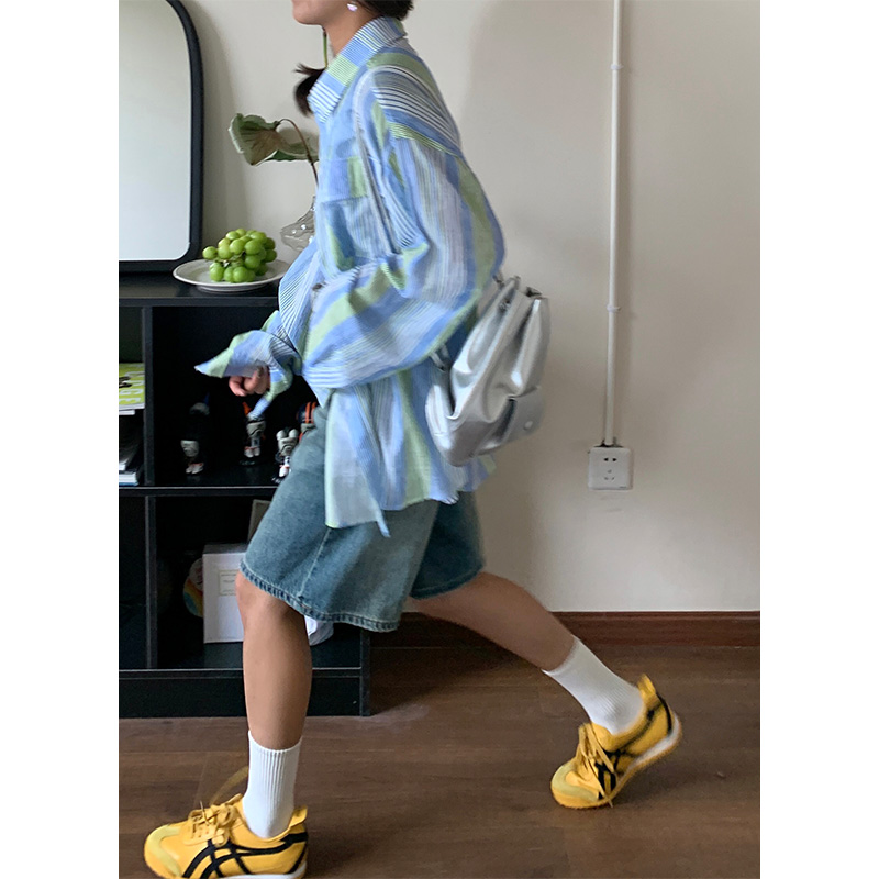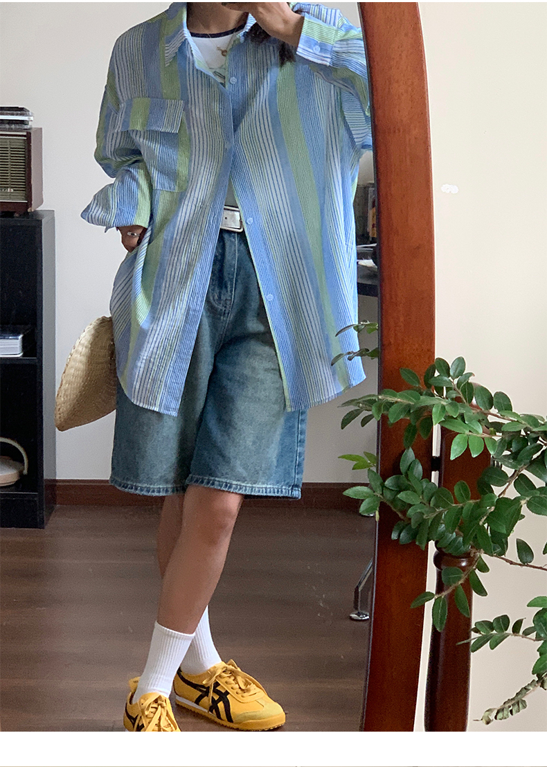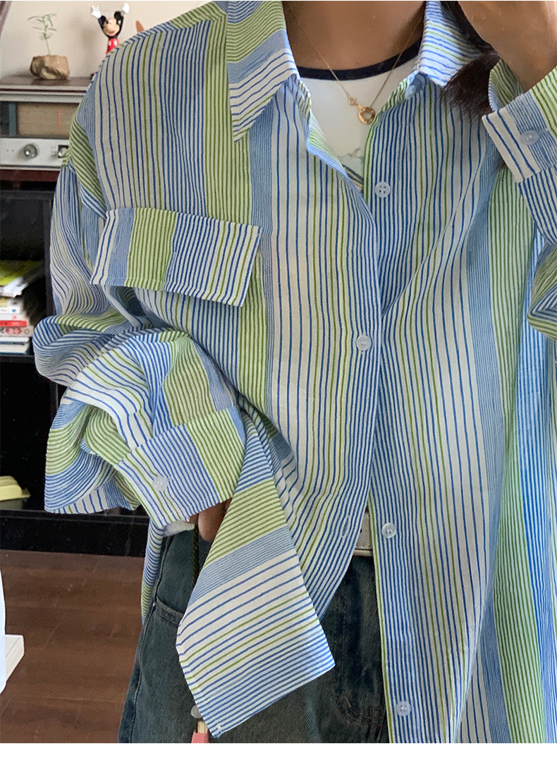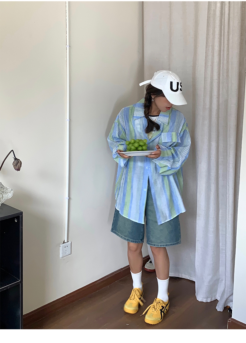 NIDEBLACK豎條紋薄款襯衫外套防曬上衣淺色條紋拼色襯衫23新款女