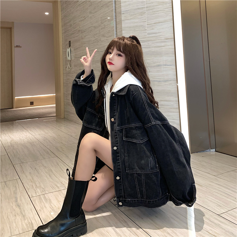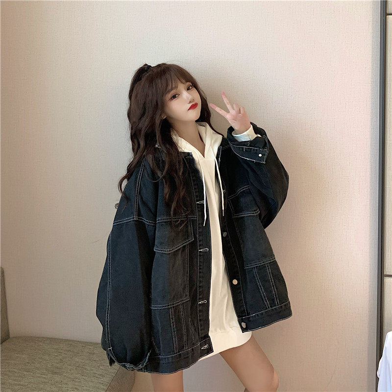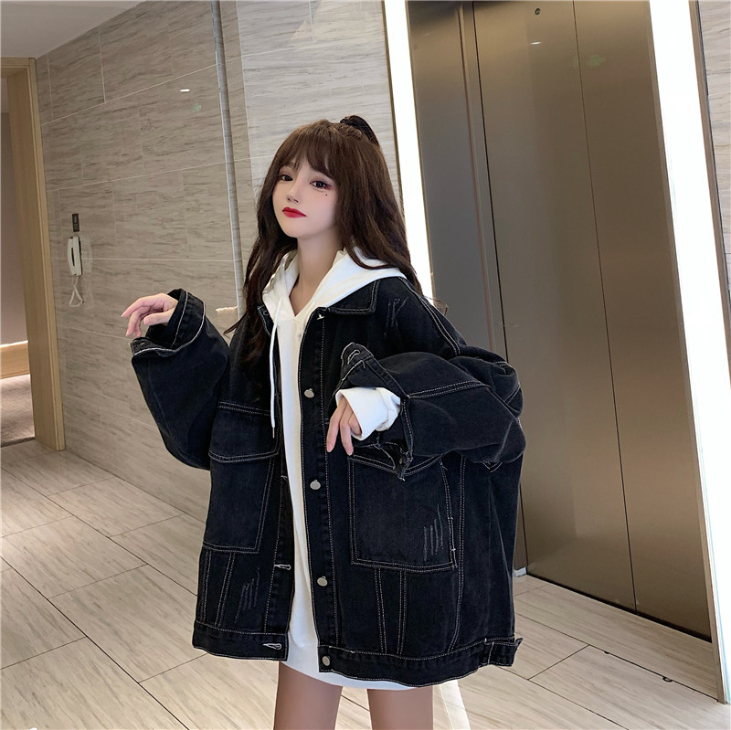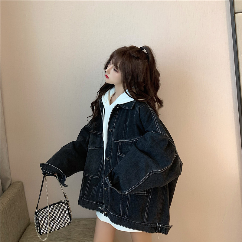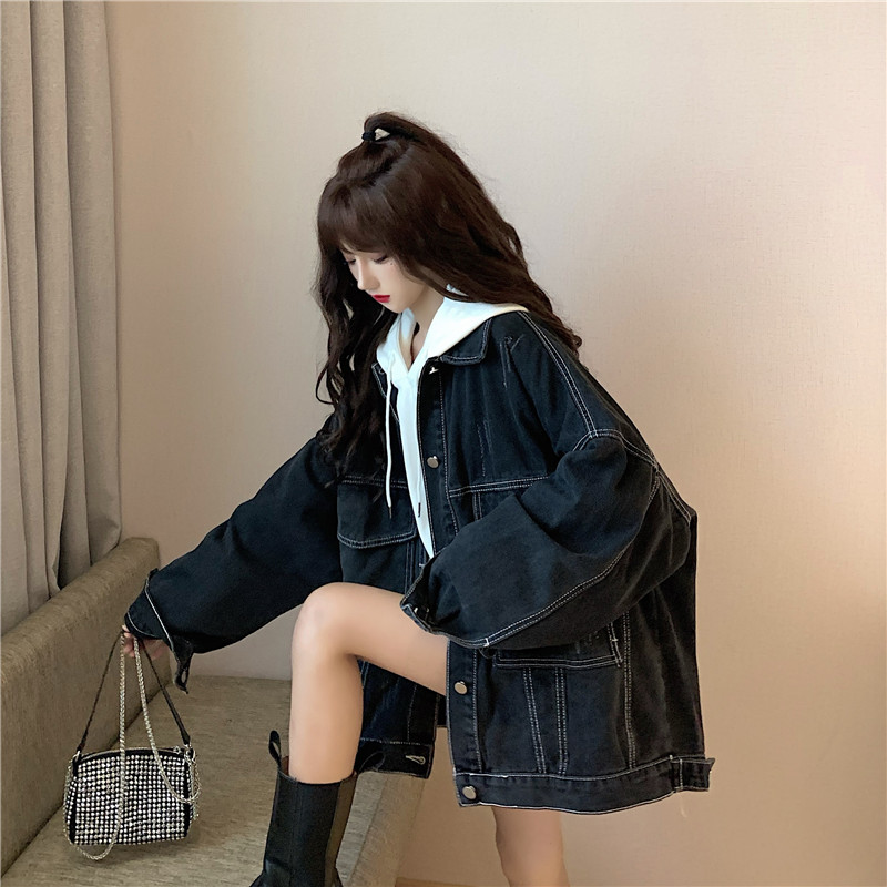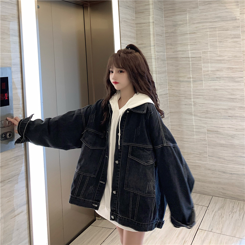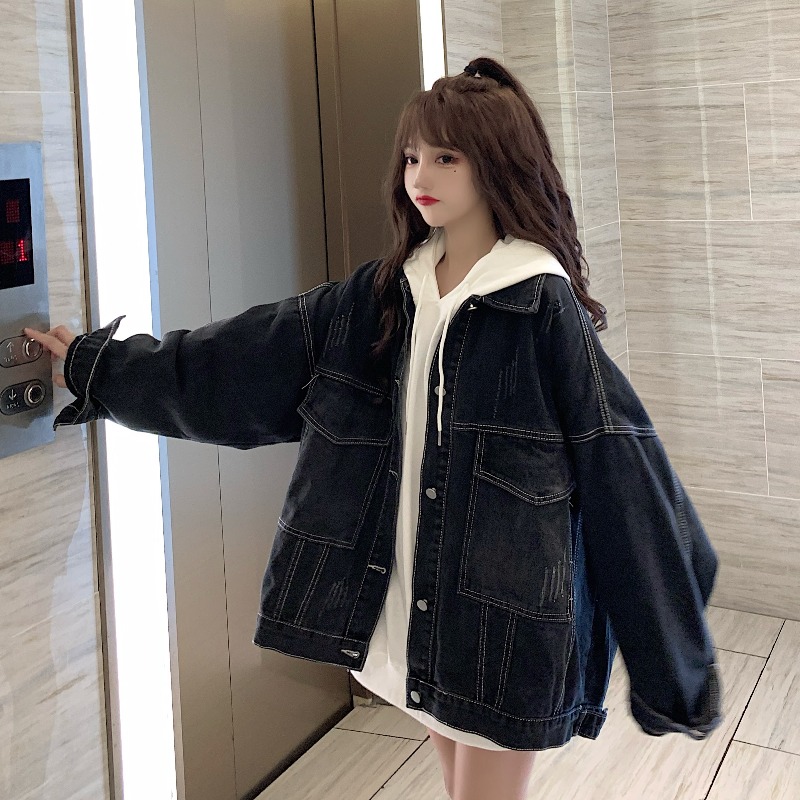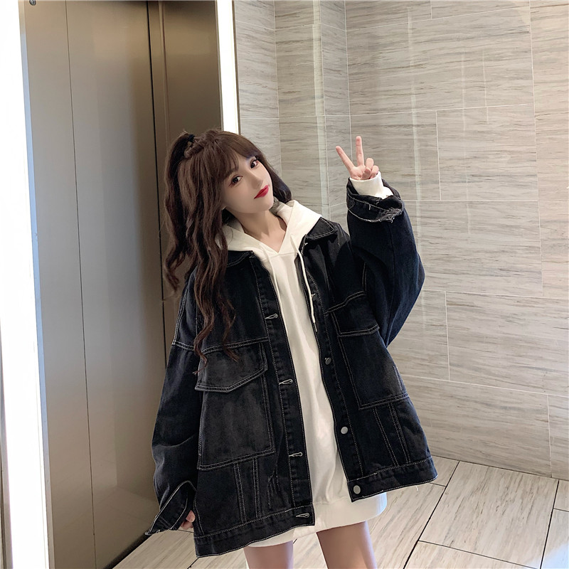 大口袋黑色牛仔外套女ins潮寬鬆韓版bf慵懶風春秋季夾克oversize