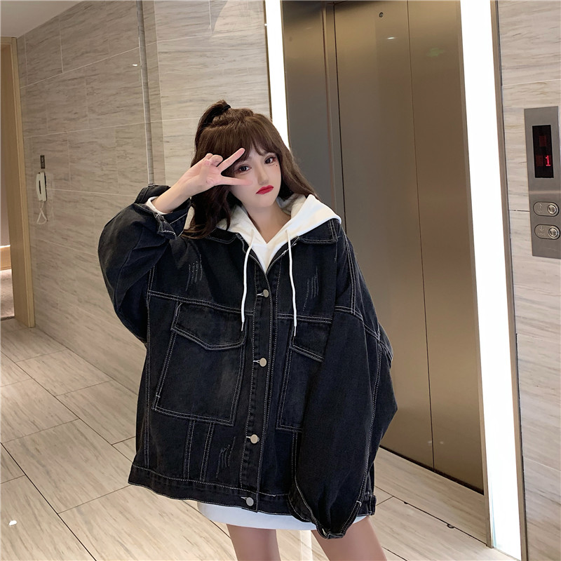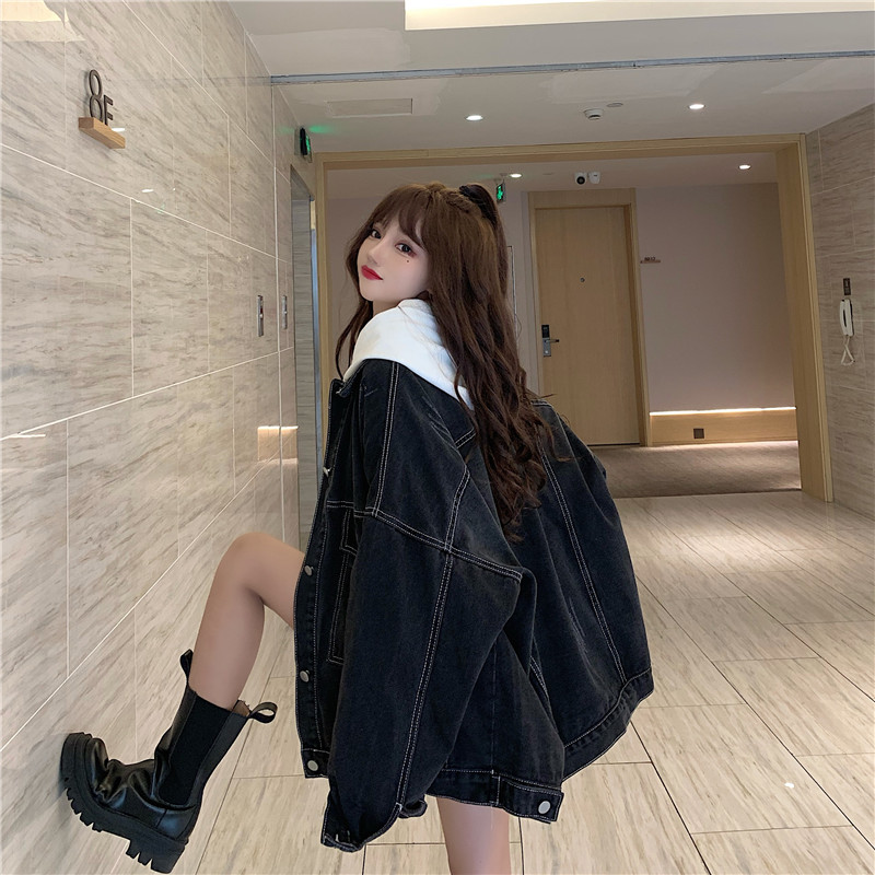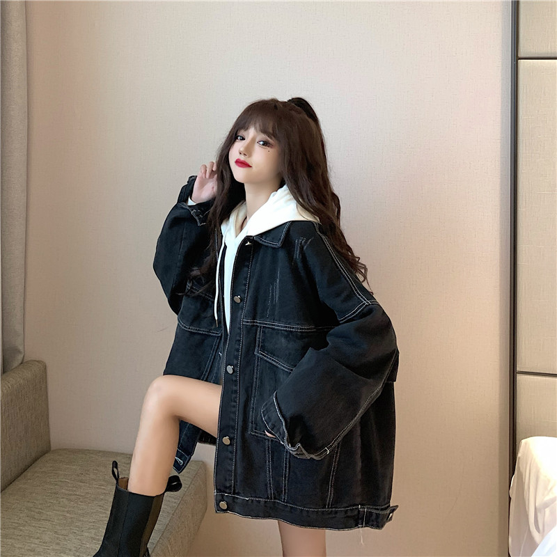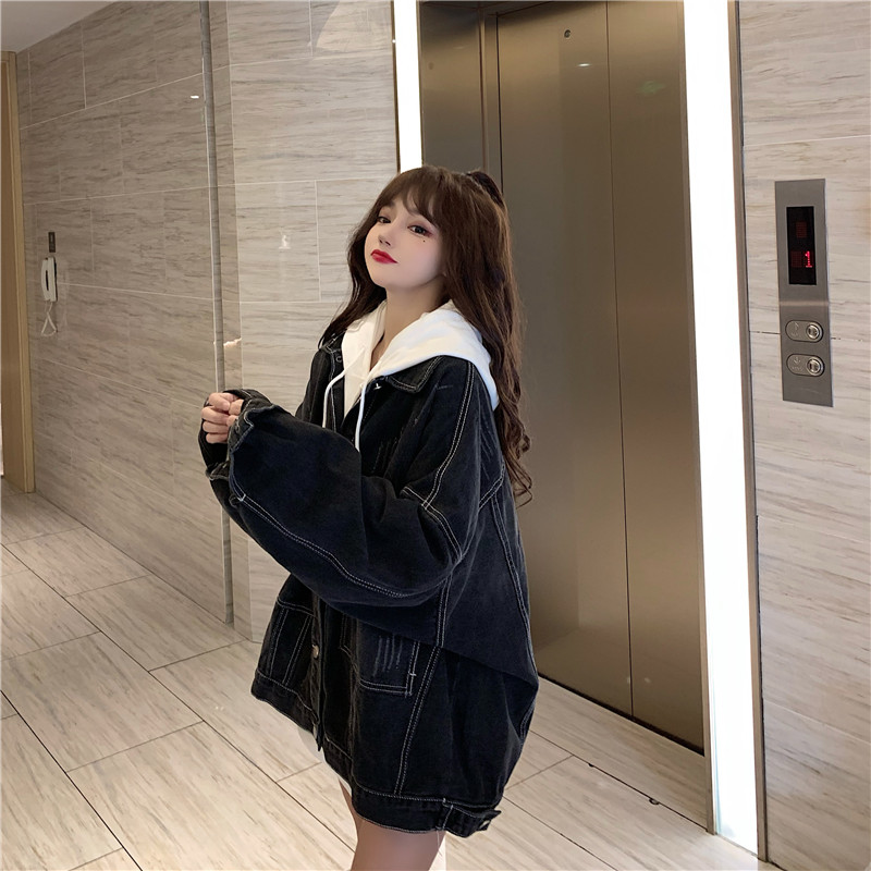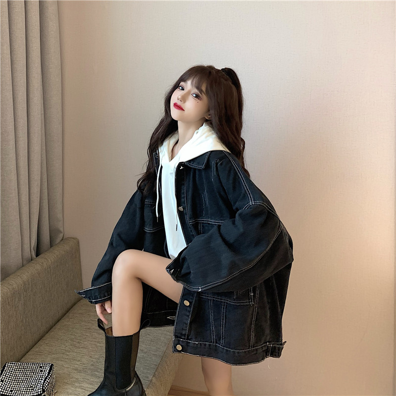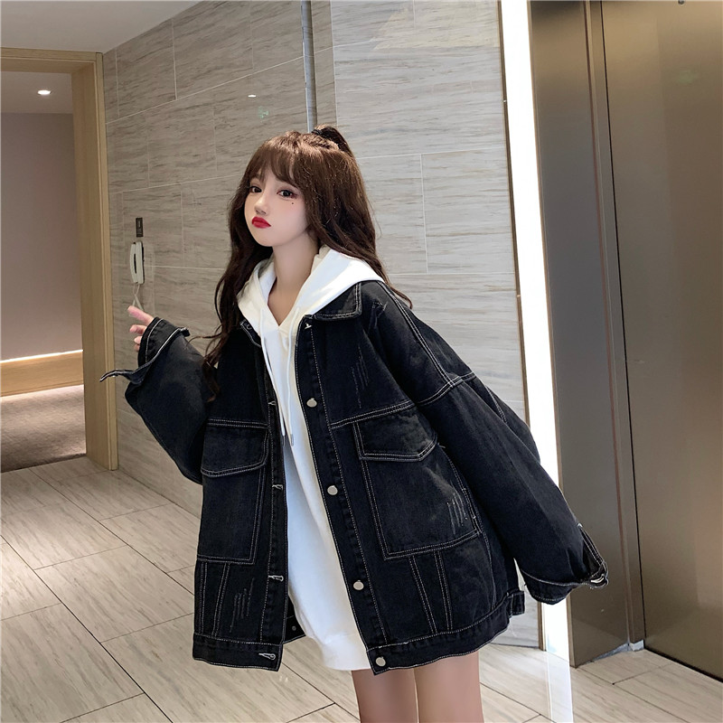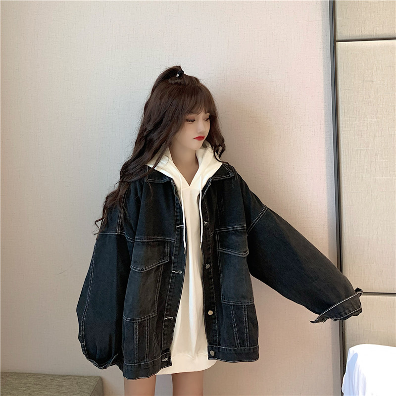 大口袋黑色牛仔外套女ins潮寬鬆韓版bf慵懶風春秋季夾克oversize