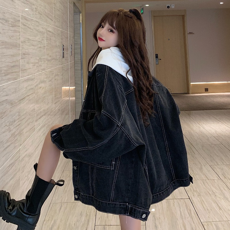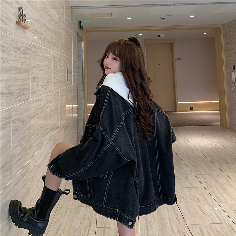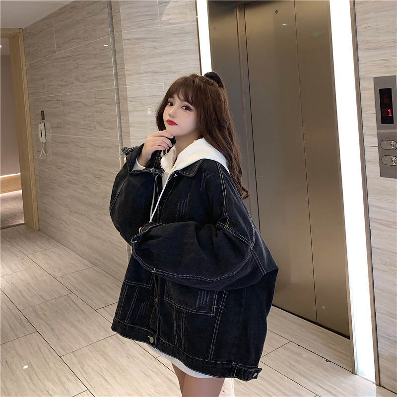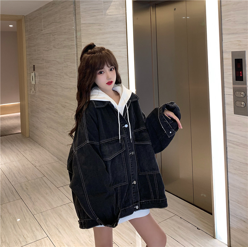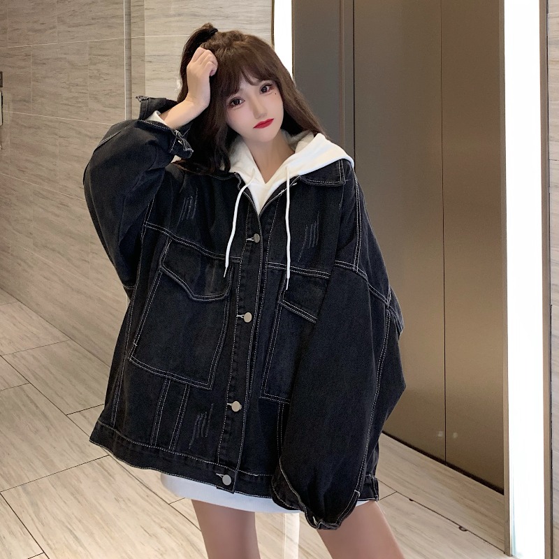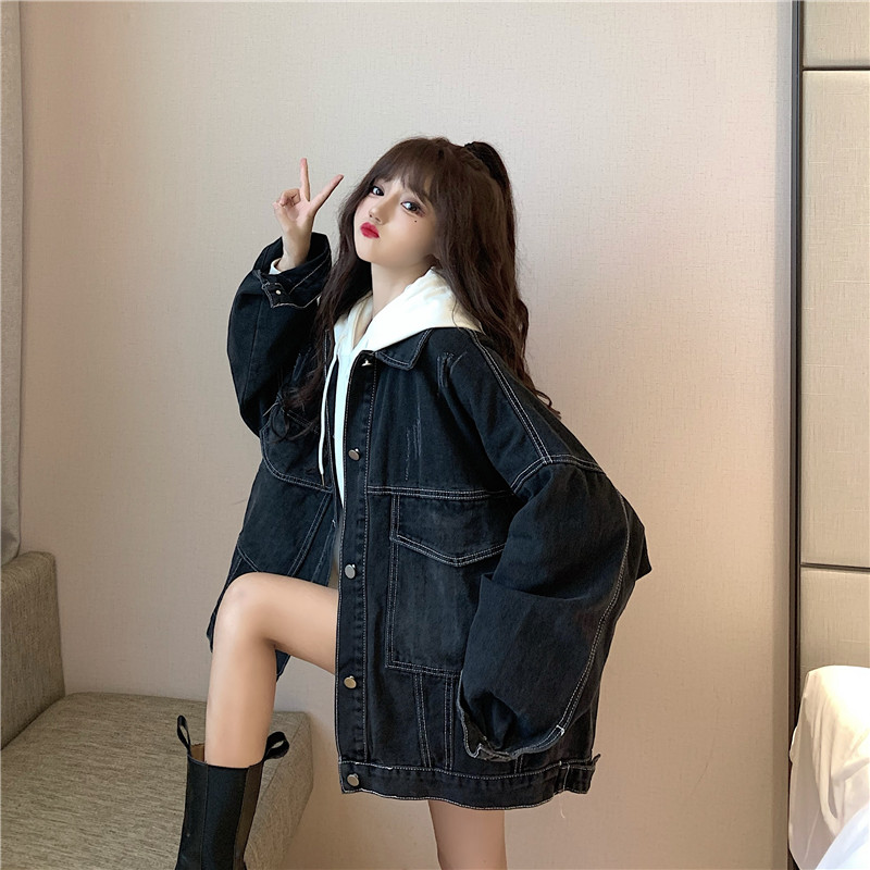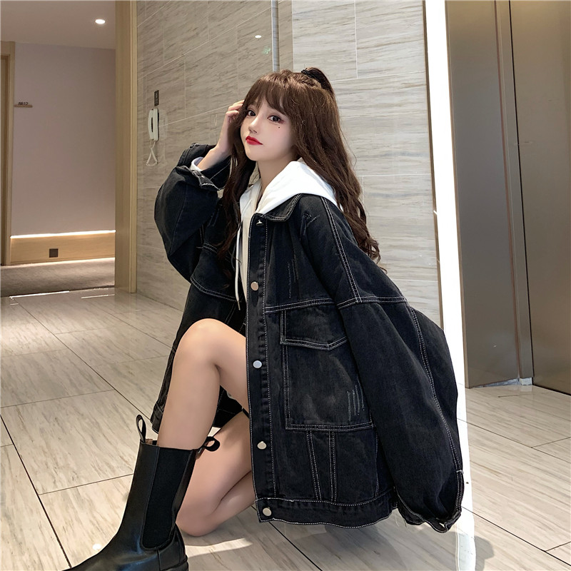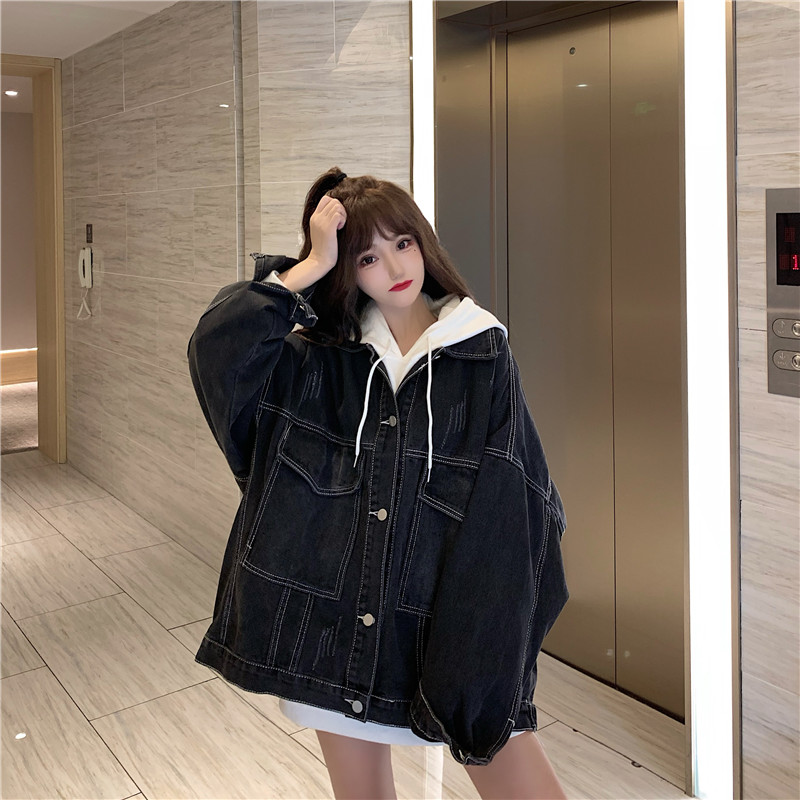 大口袋黑色牛仔外套女ins潮寬鬆韓版bf慵懶風春秋季夾克oversize