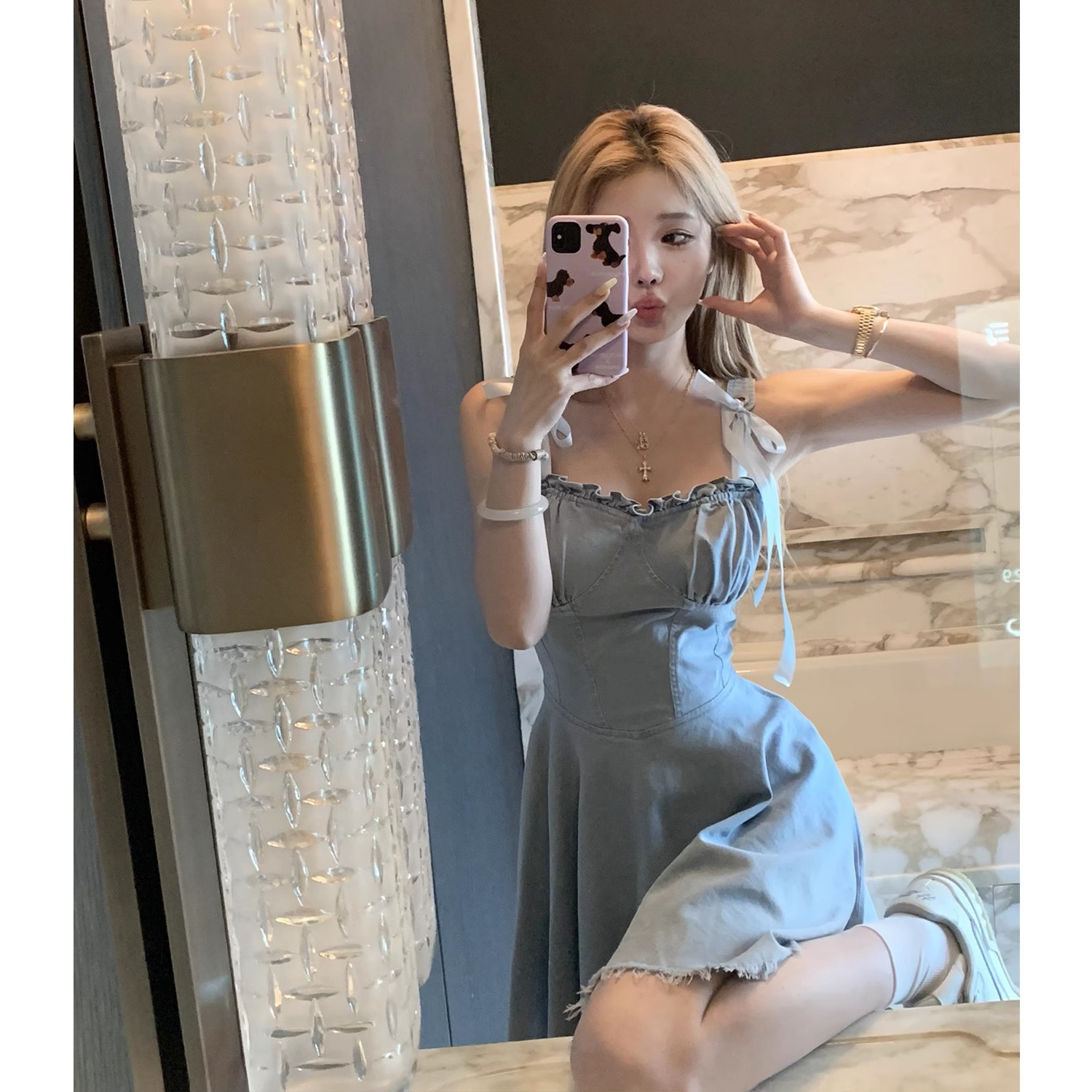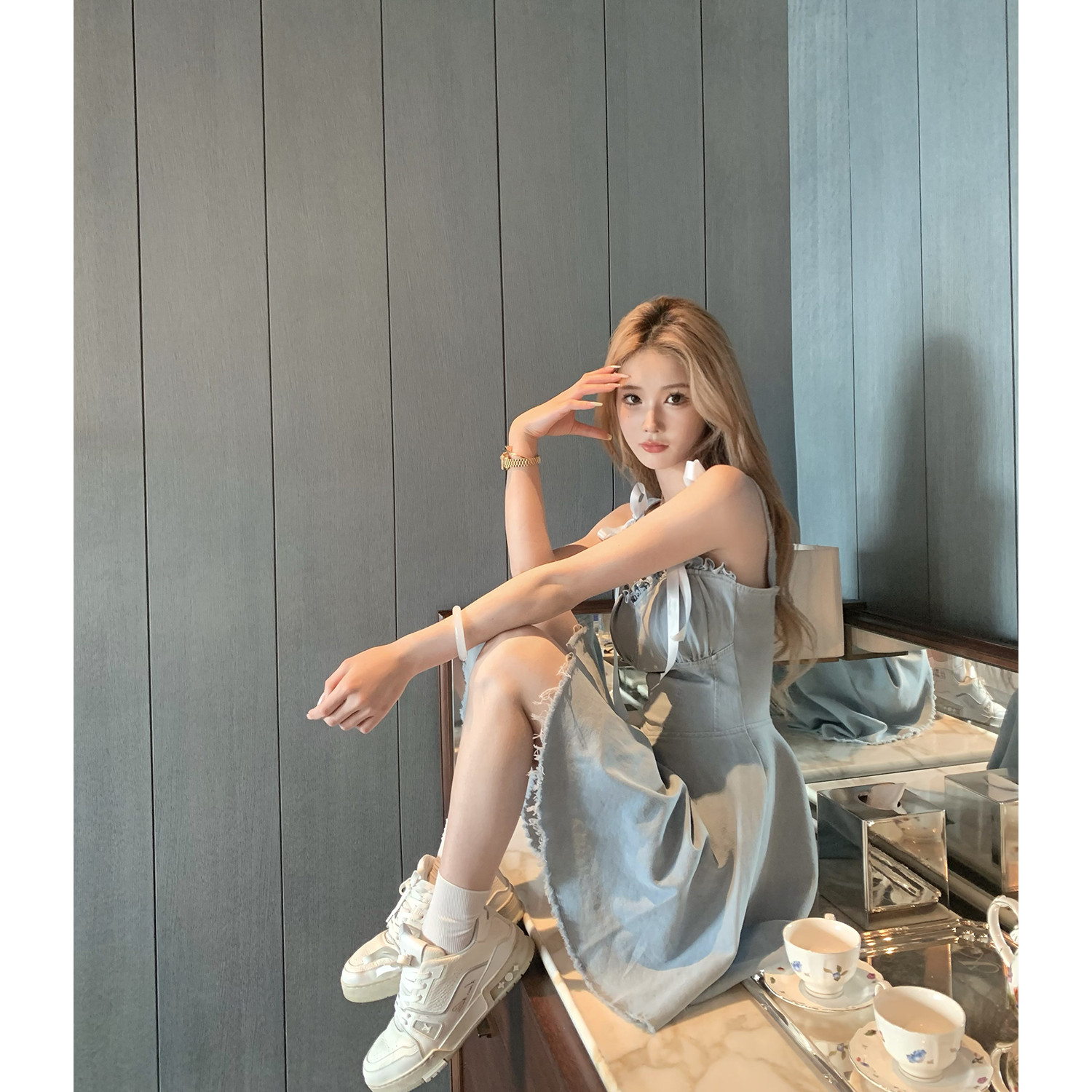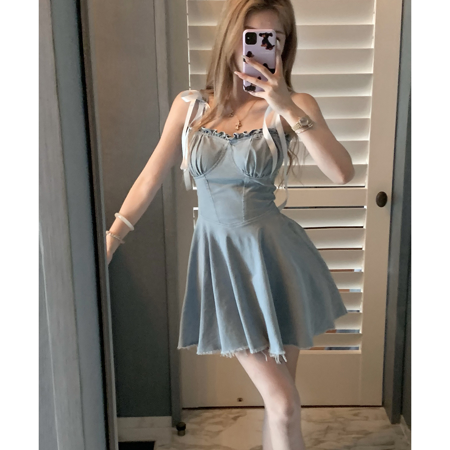 JMS 上東區辣妹 收腰洋裝女設計感小眾顯瘦短款吊帶牛仔裙HOP