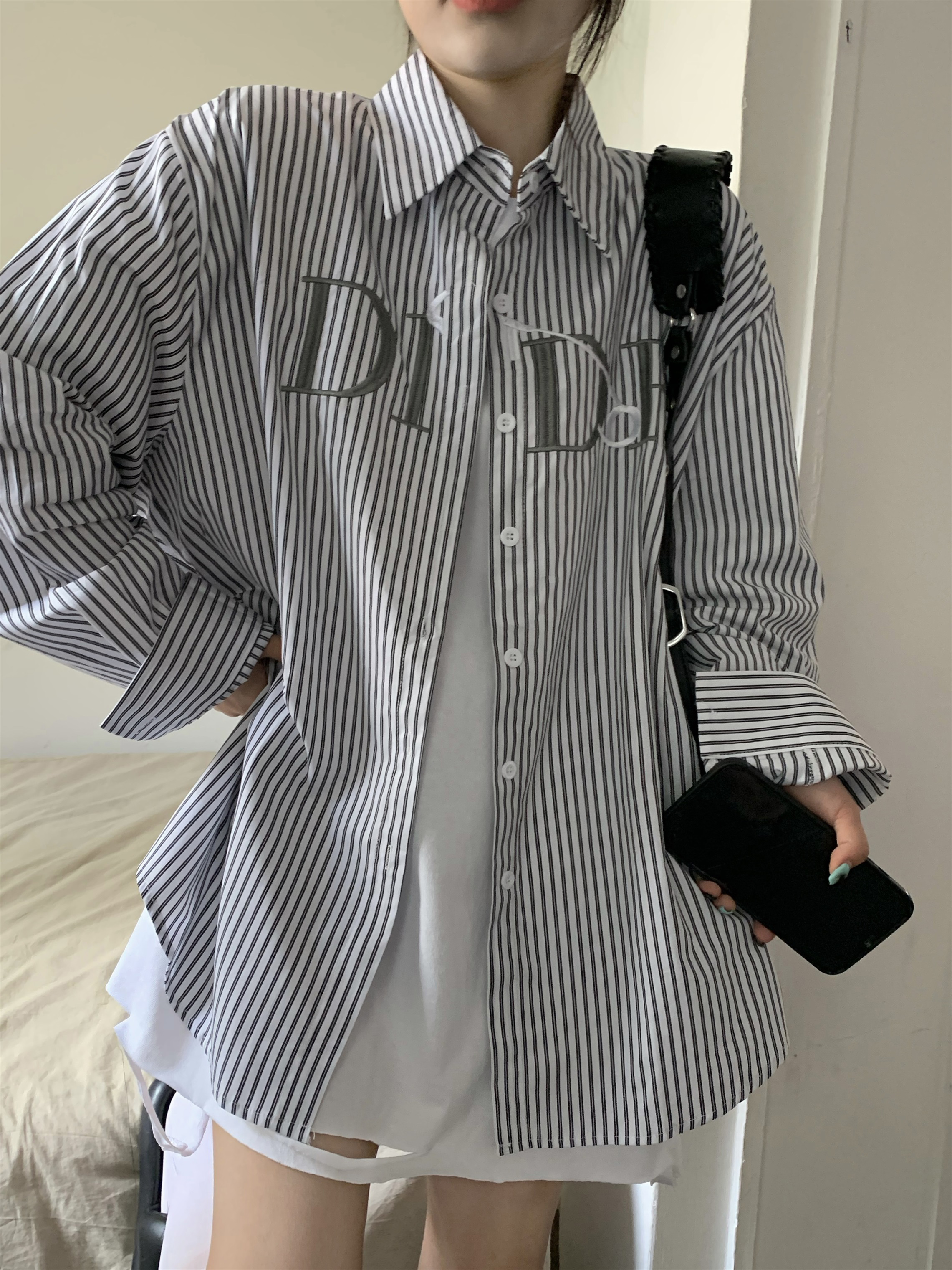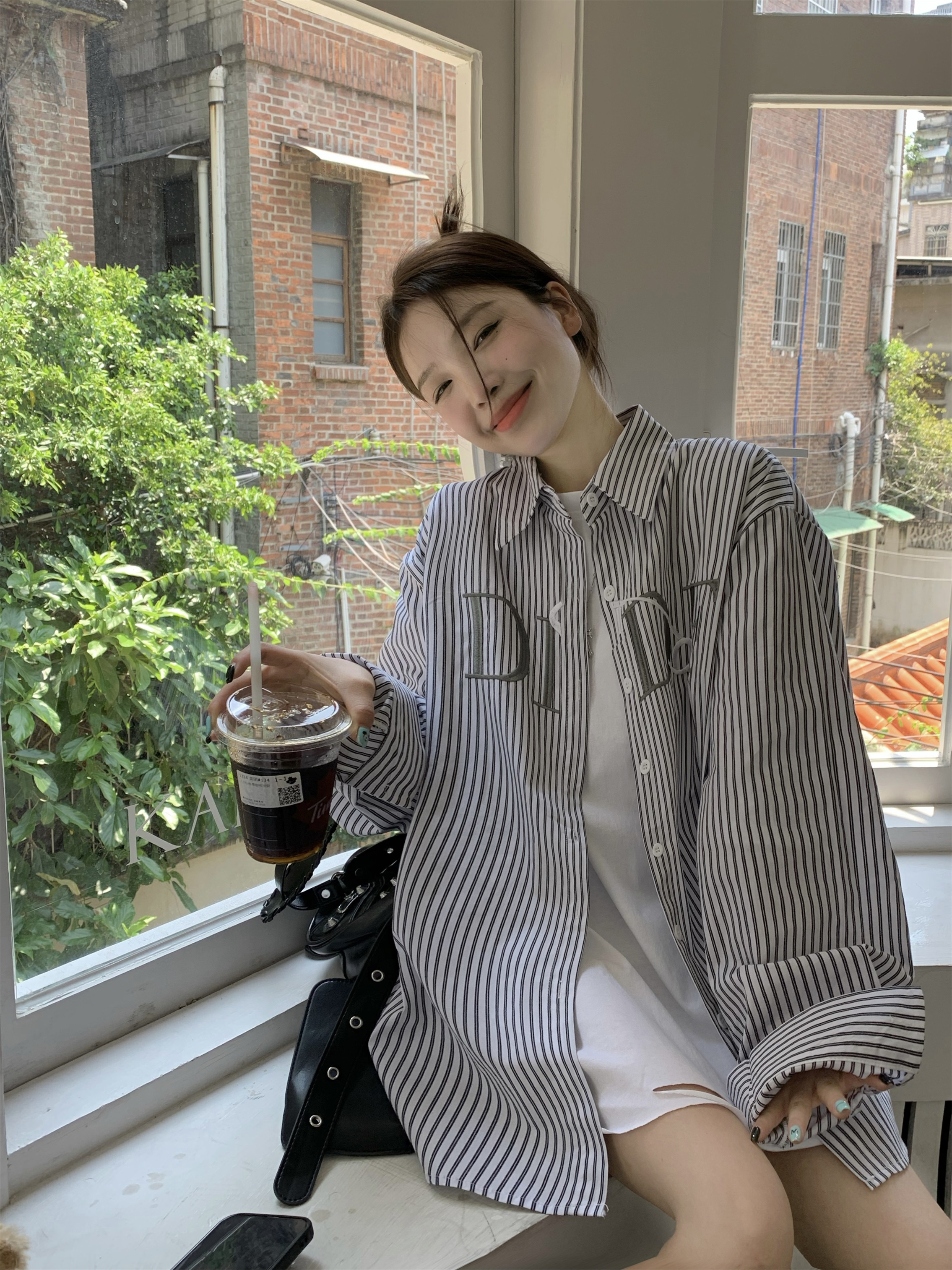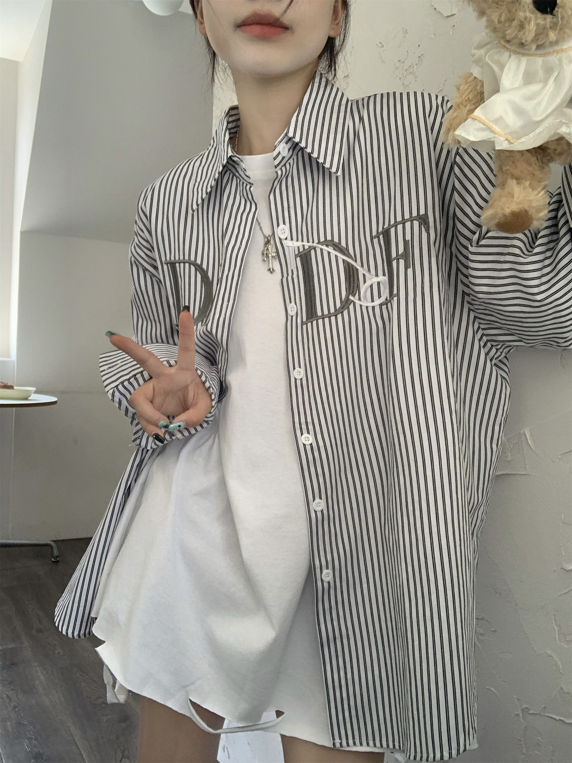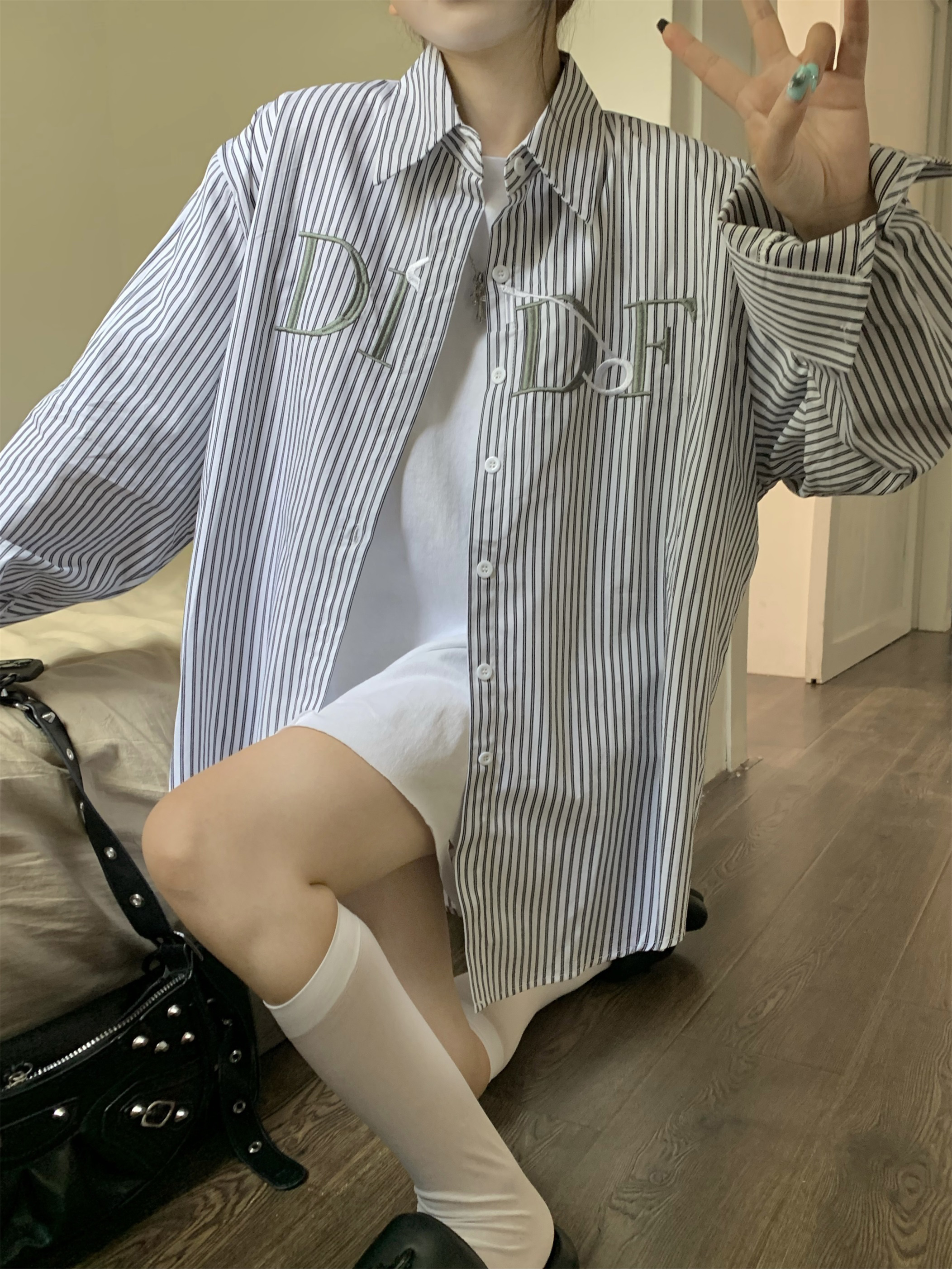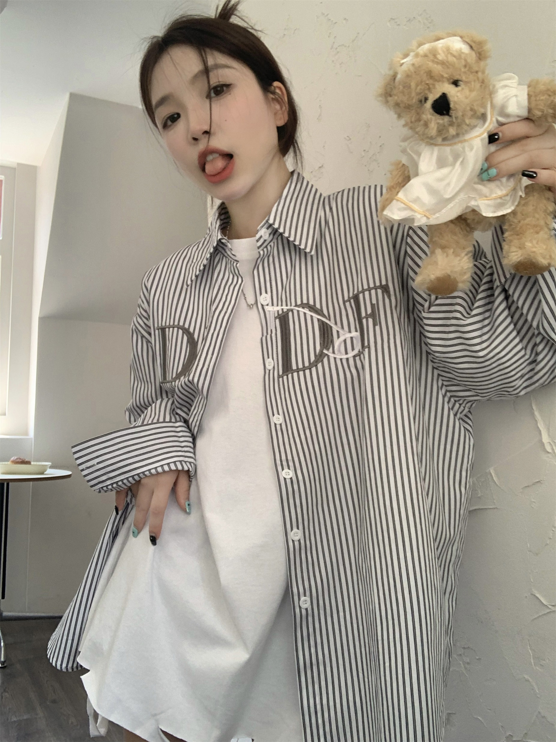 polo領條紋長袖襯衫女裝秋季薄款韓版設計感小眾外搭寬鬆襯衫上衣