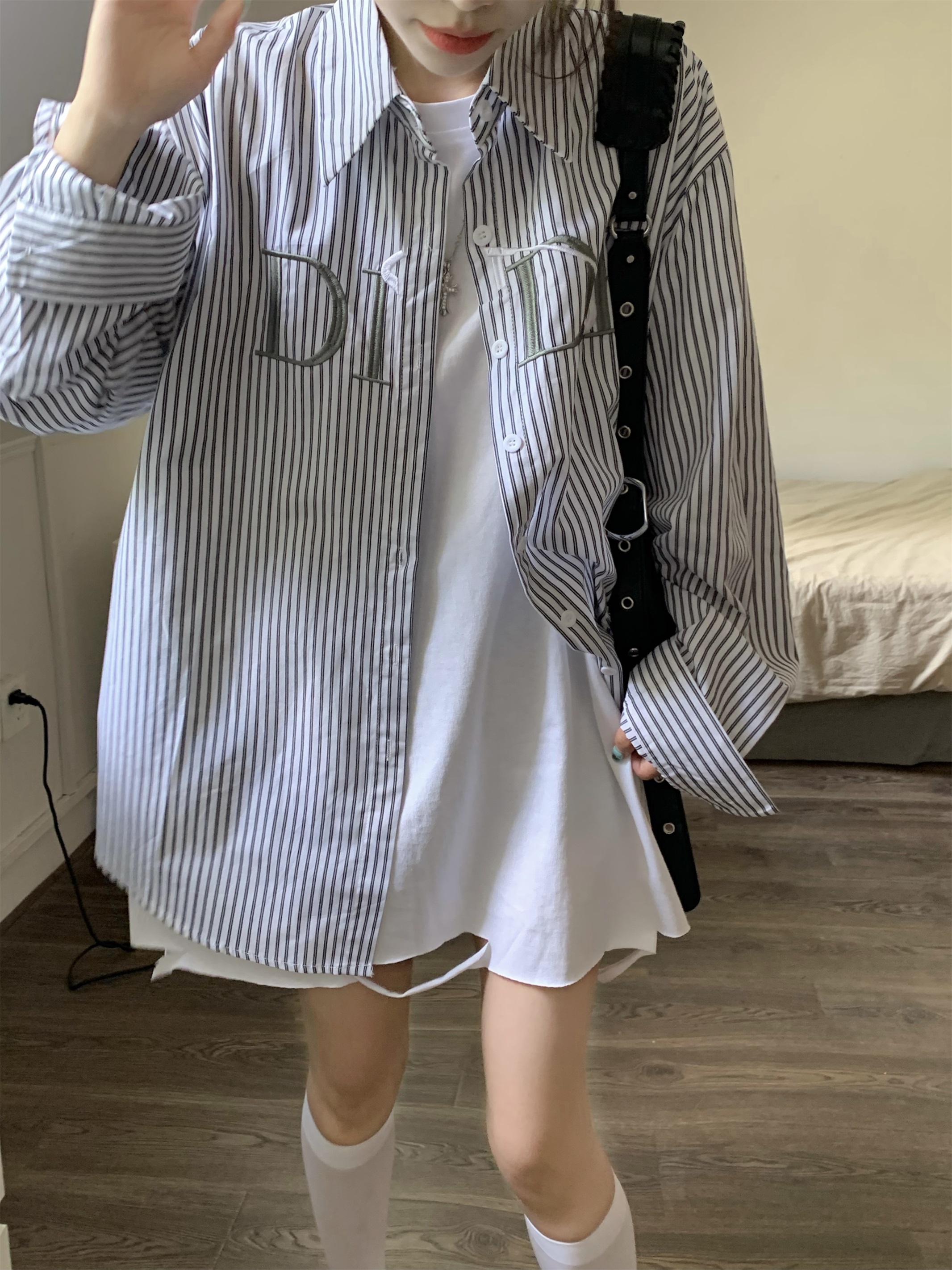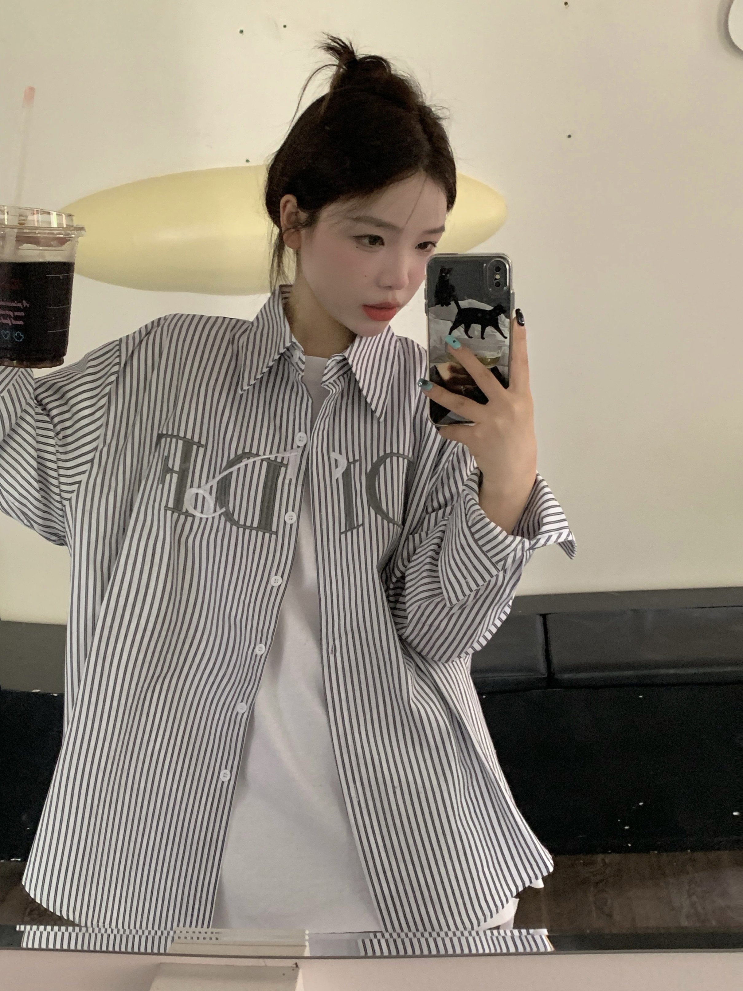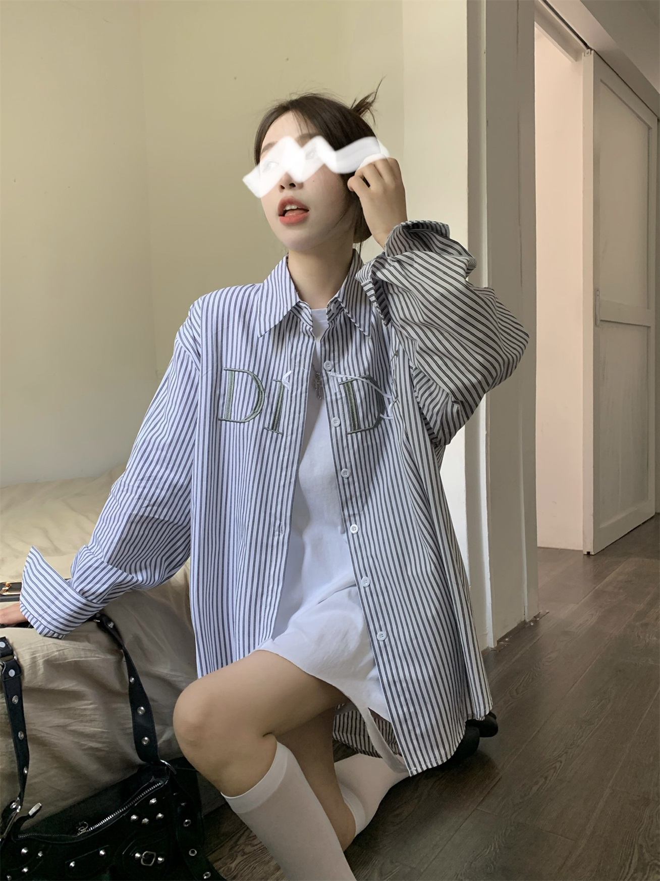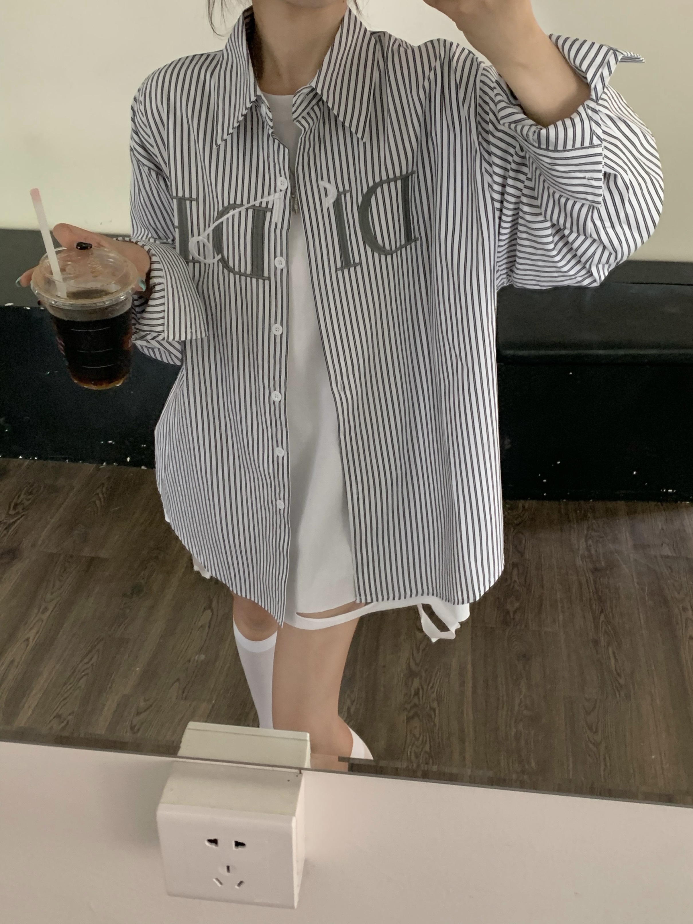 polo領條紋長袖襯衫女裝秋季薄款韓版設計感小眾外搭寬鬆襯衫上衣