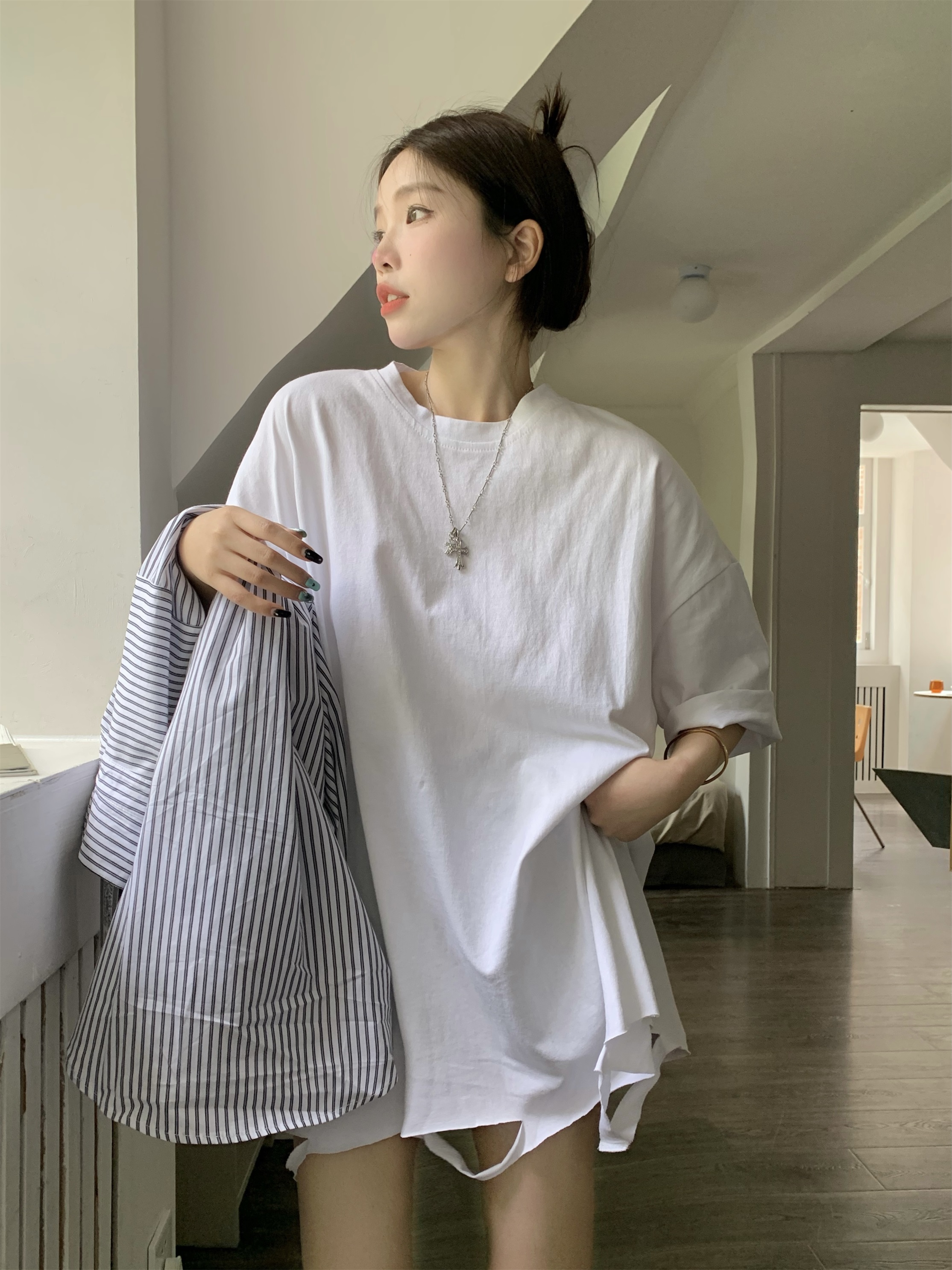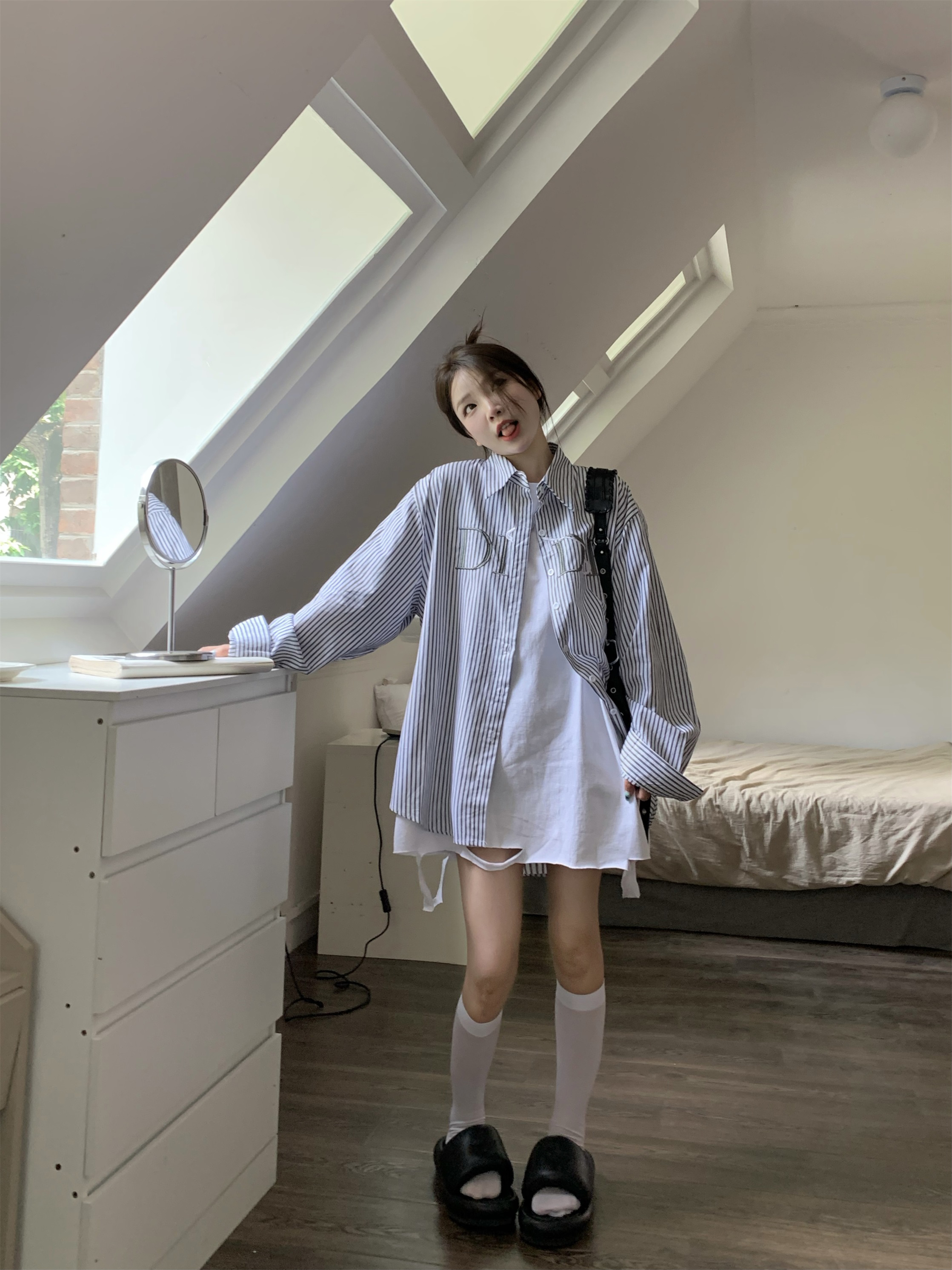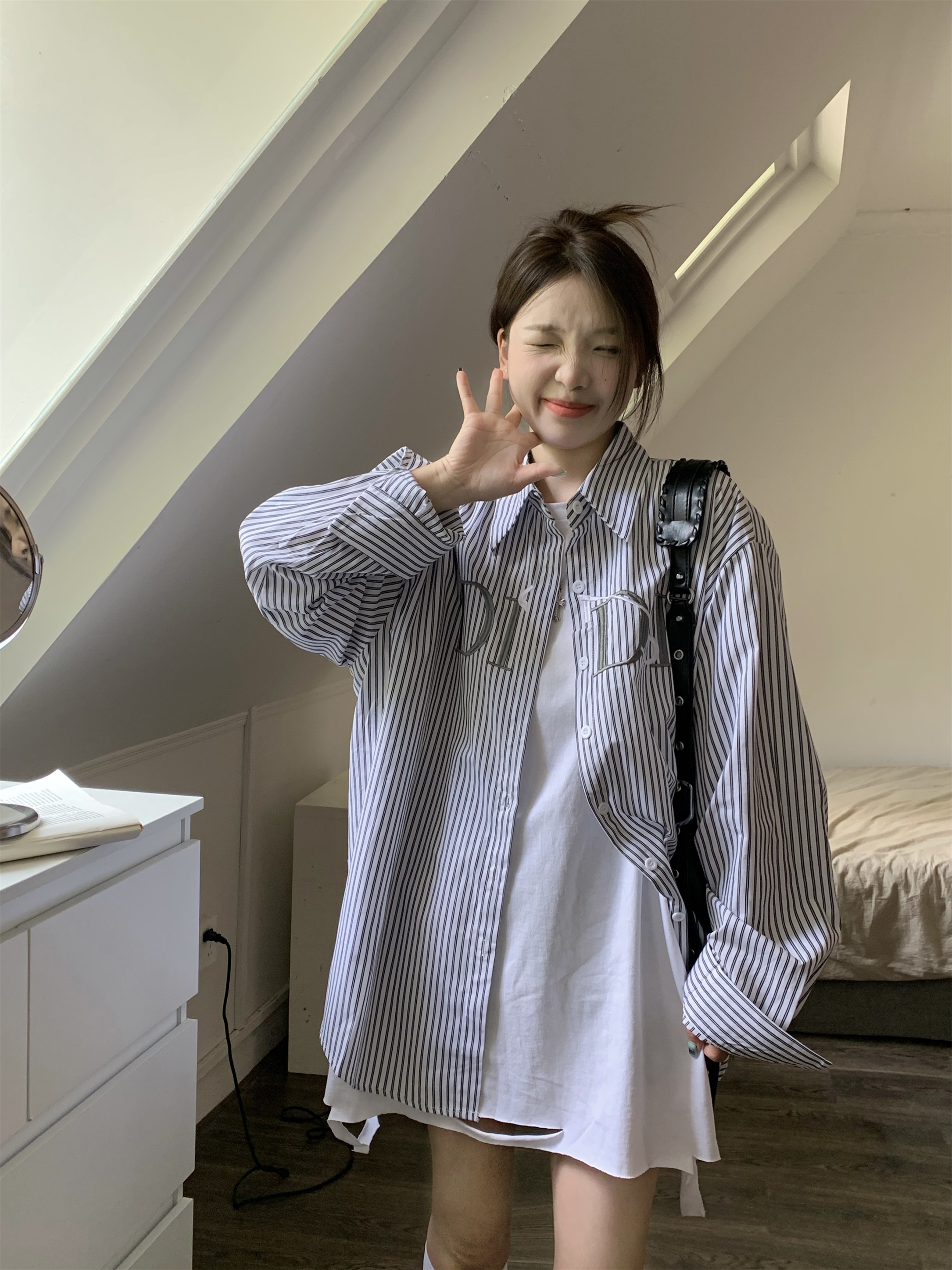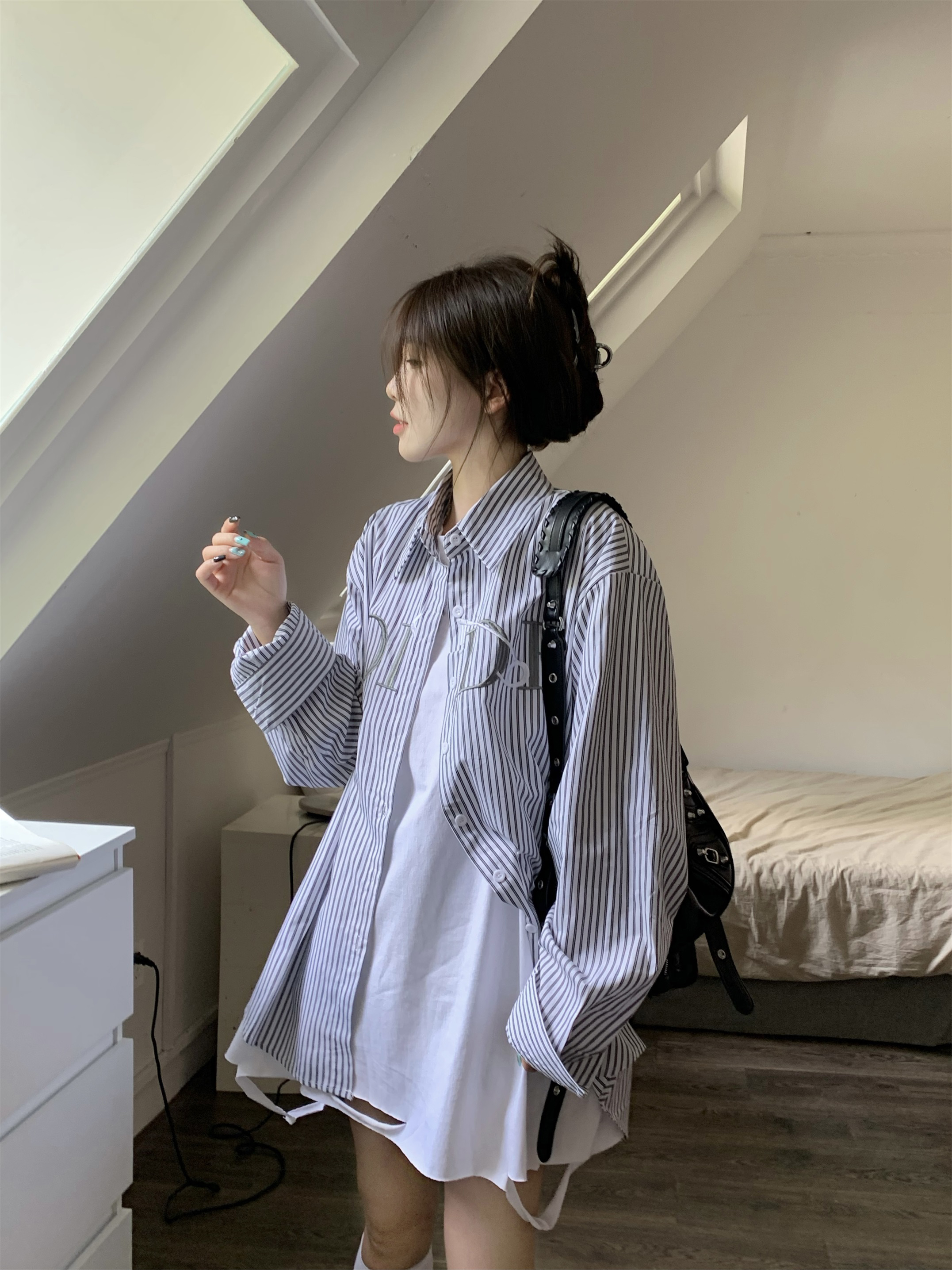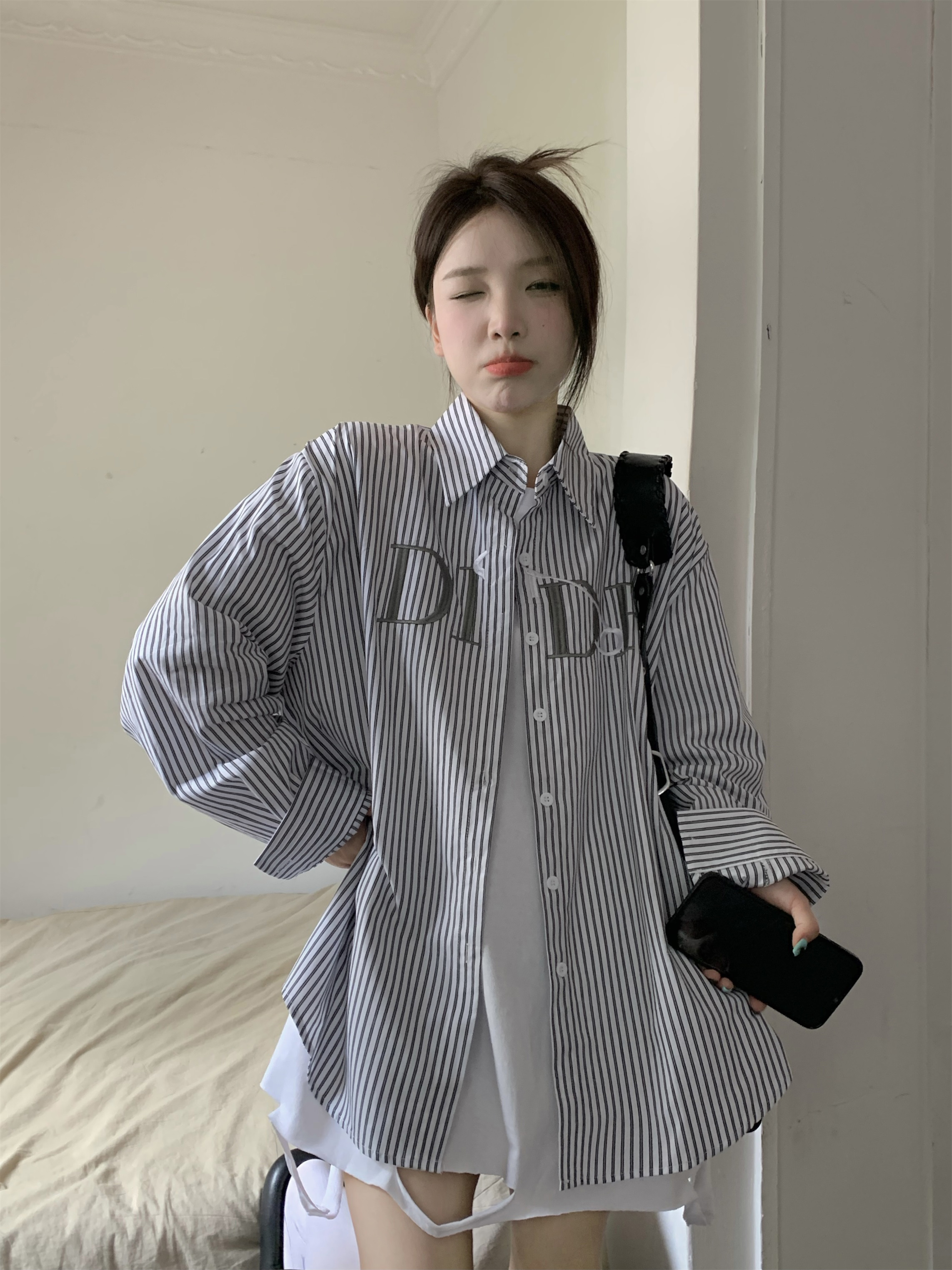 polo領條紋長袖襯衫女裝秋季薄款韓版設計感小眾外搭寬鬆襯衫上衣