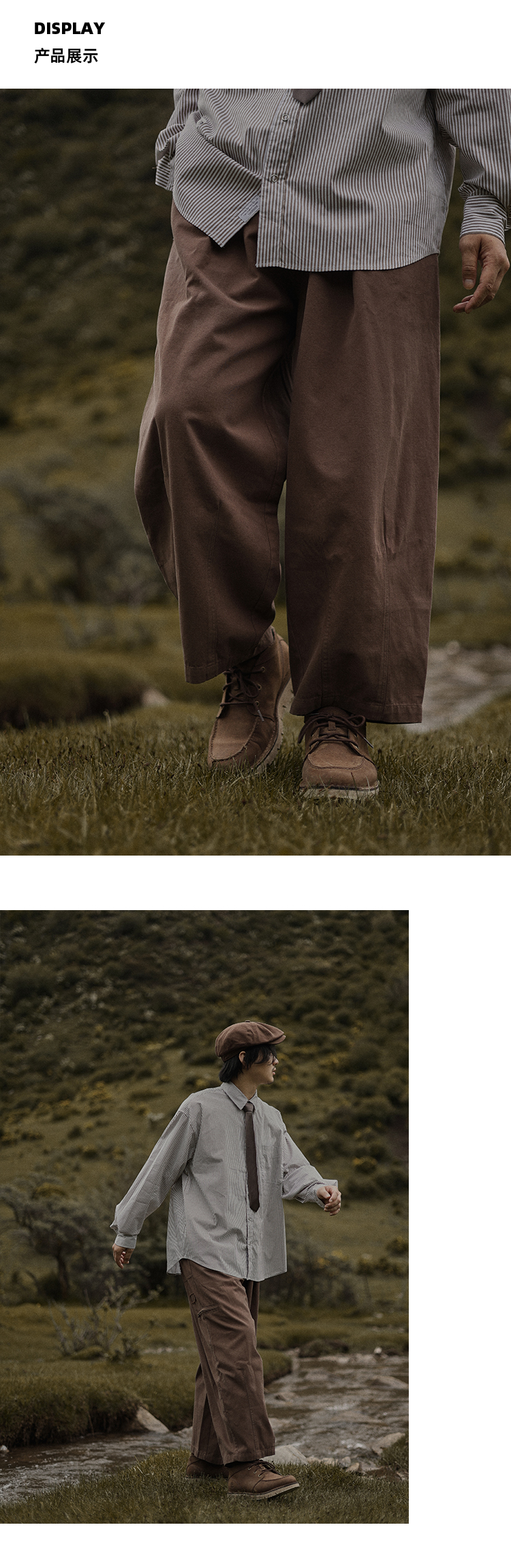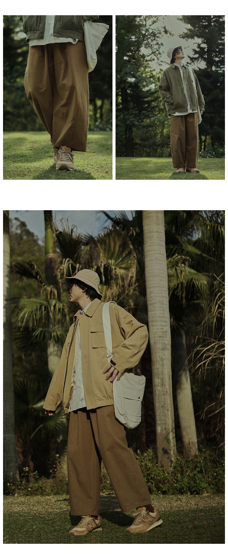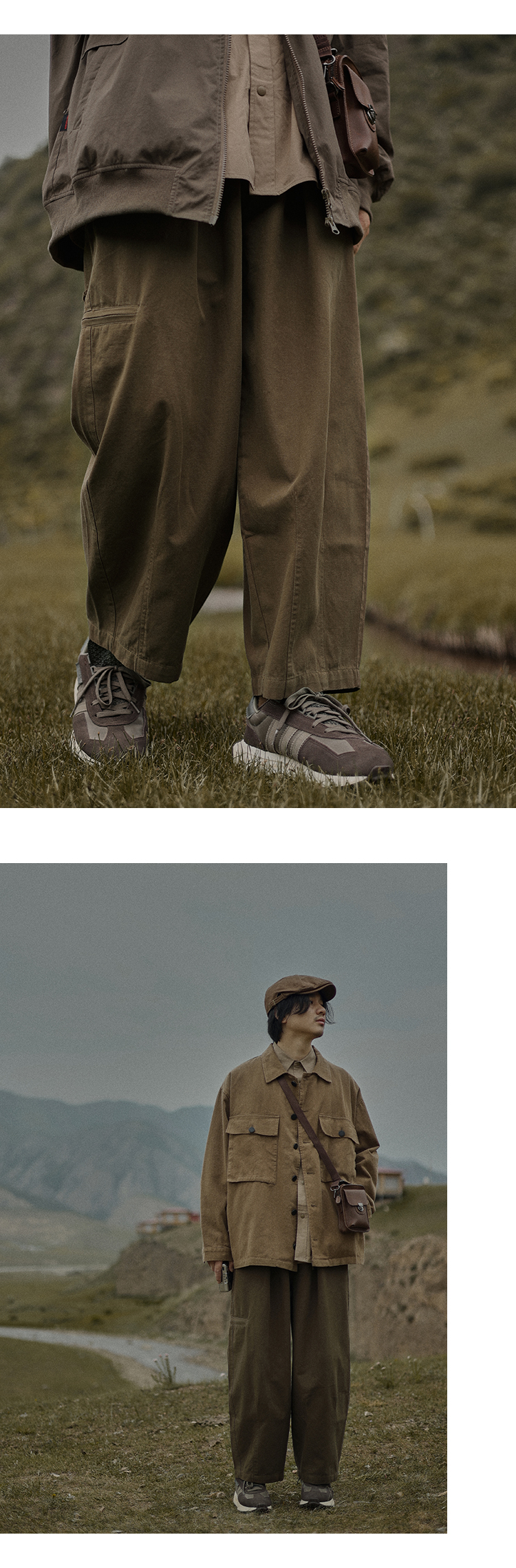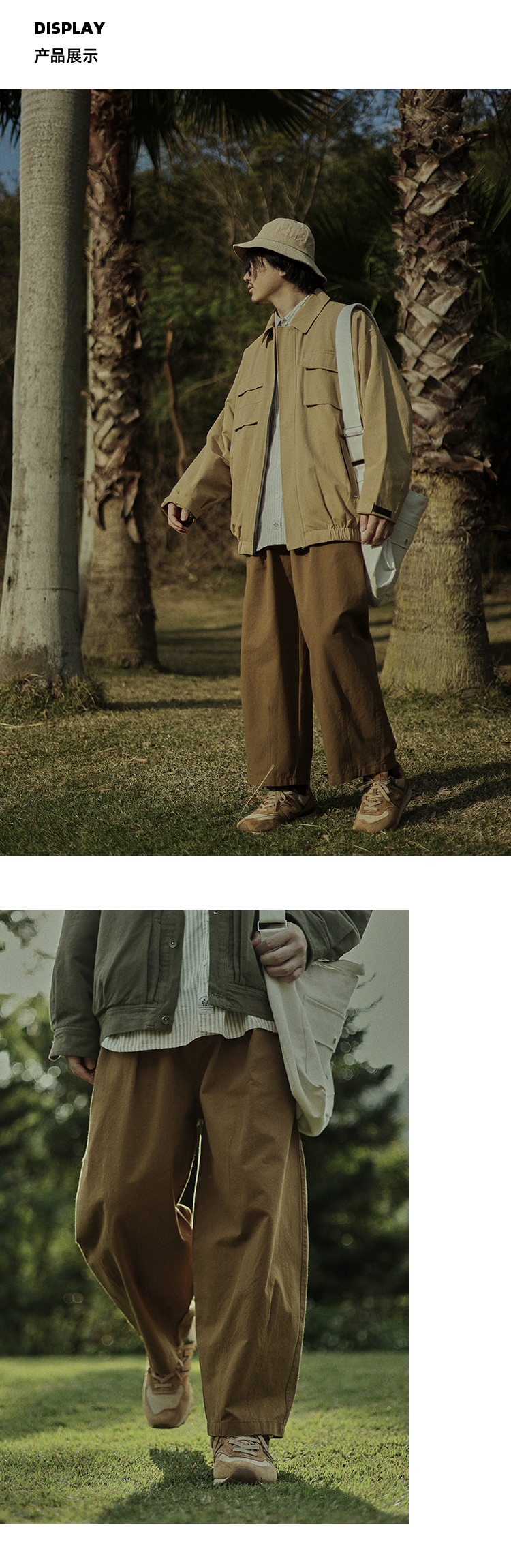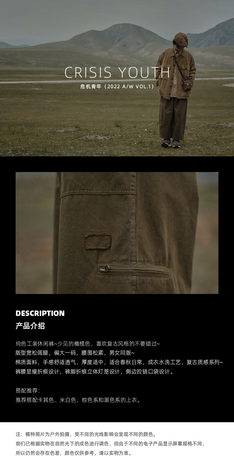 危機青年復古闊腿工裝褲男水洗橄欖色春秋日系寬鬆直筒休閒長褲子