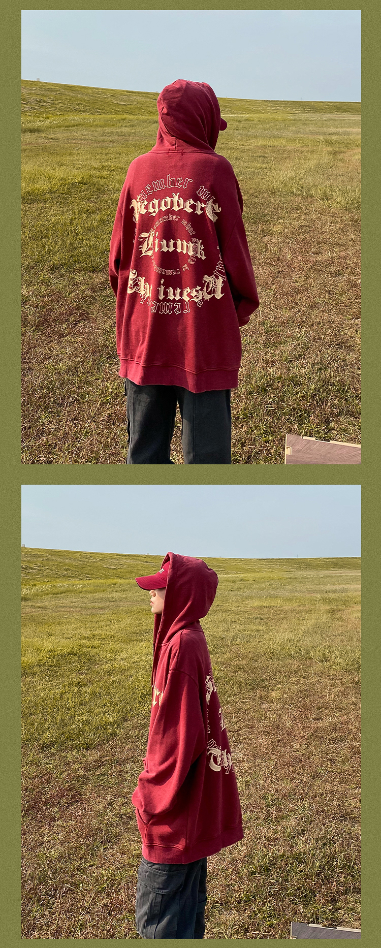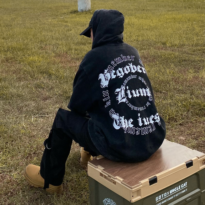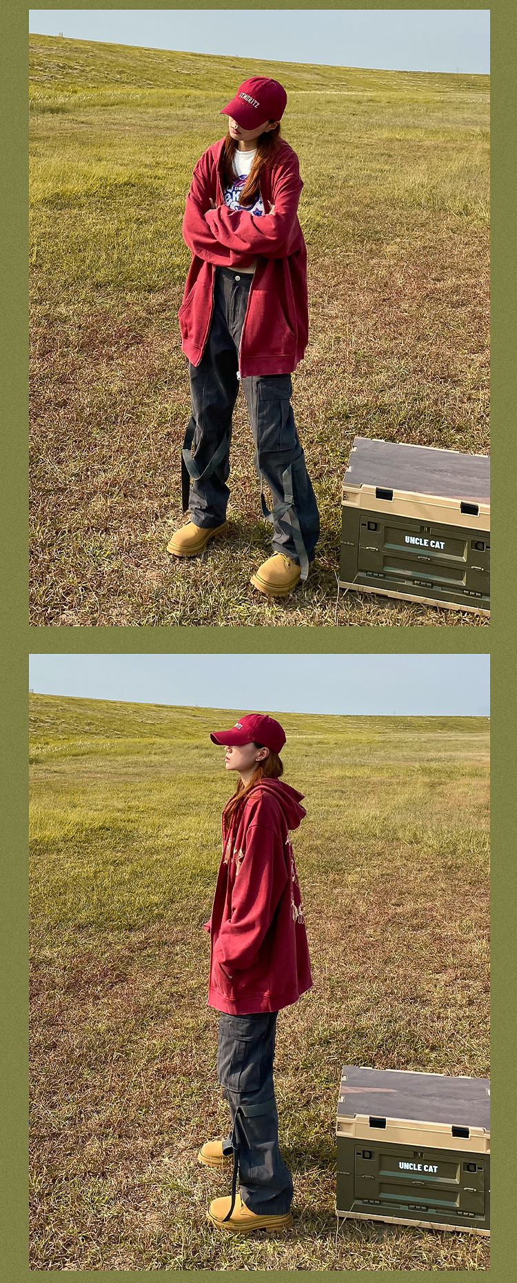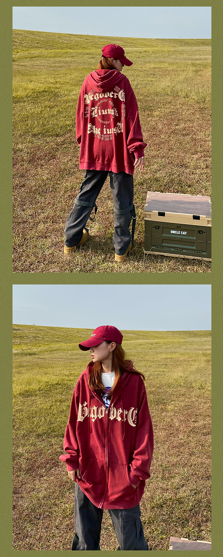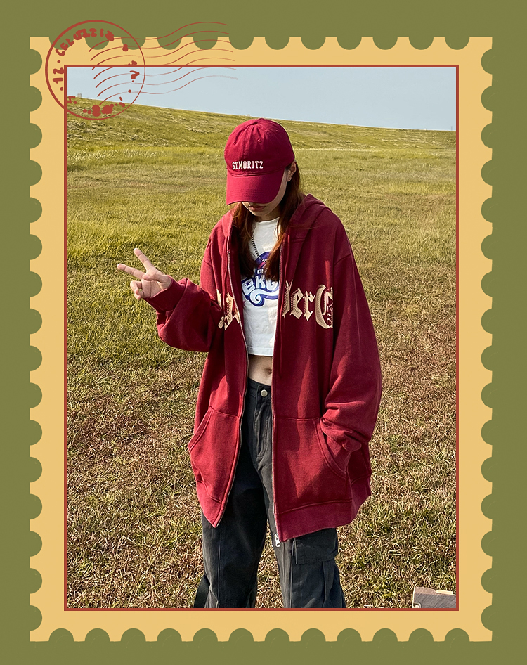 apocket美式街頭復古水洗做舊紅色連帽運動衫開衫oversize拉鍊外套