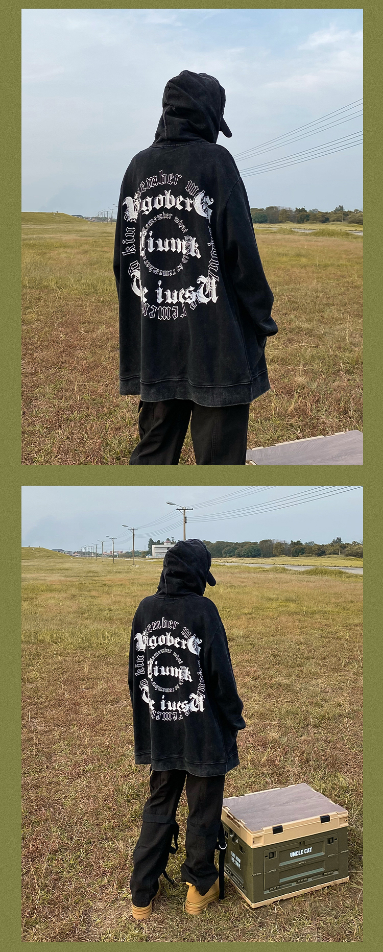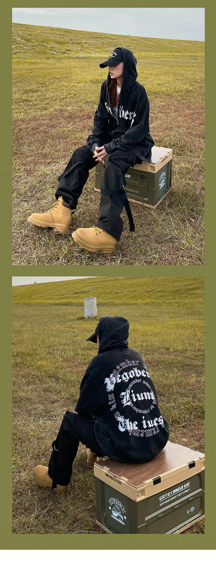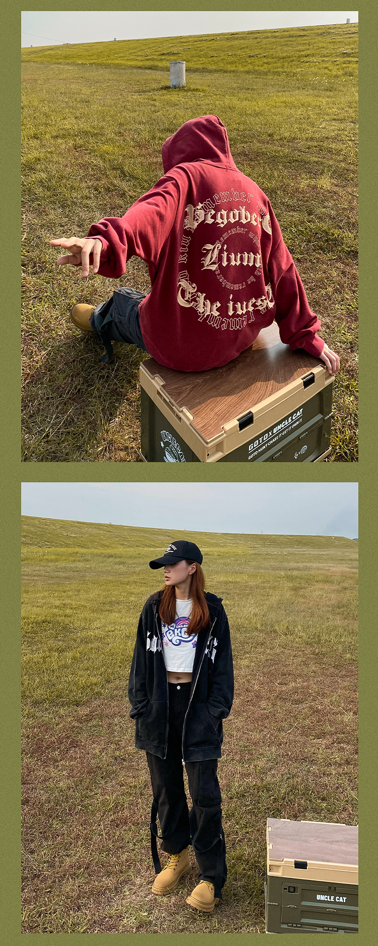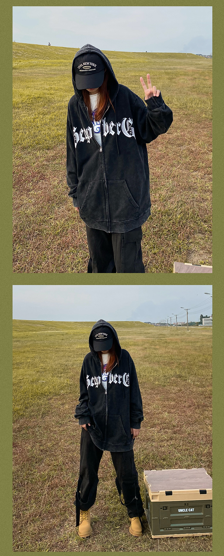 apocket美式街頭復古水洗做舊紅色連帽運動衫開衫oversize拉鍊外套