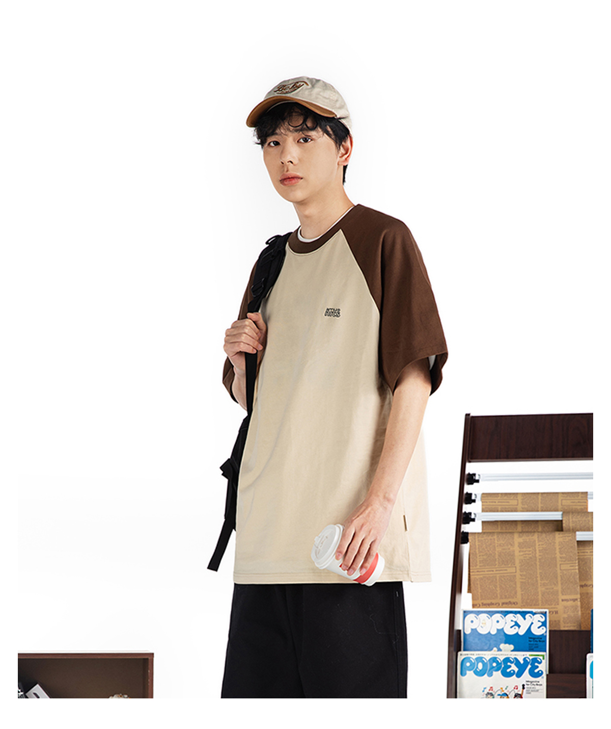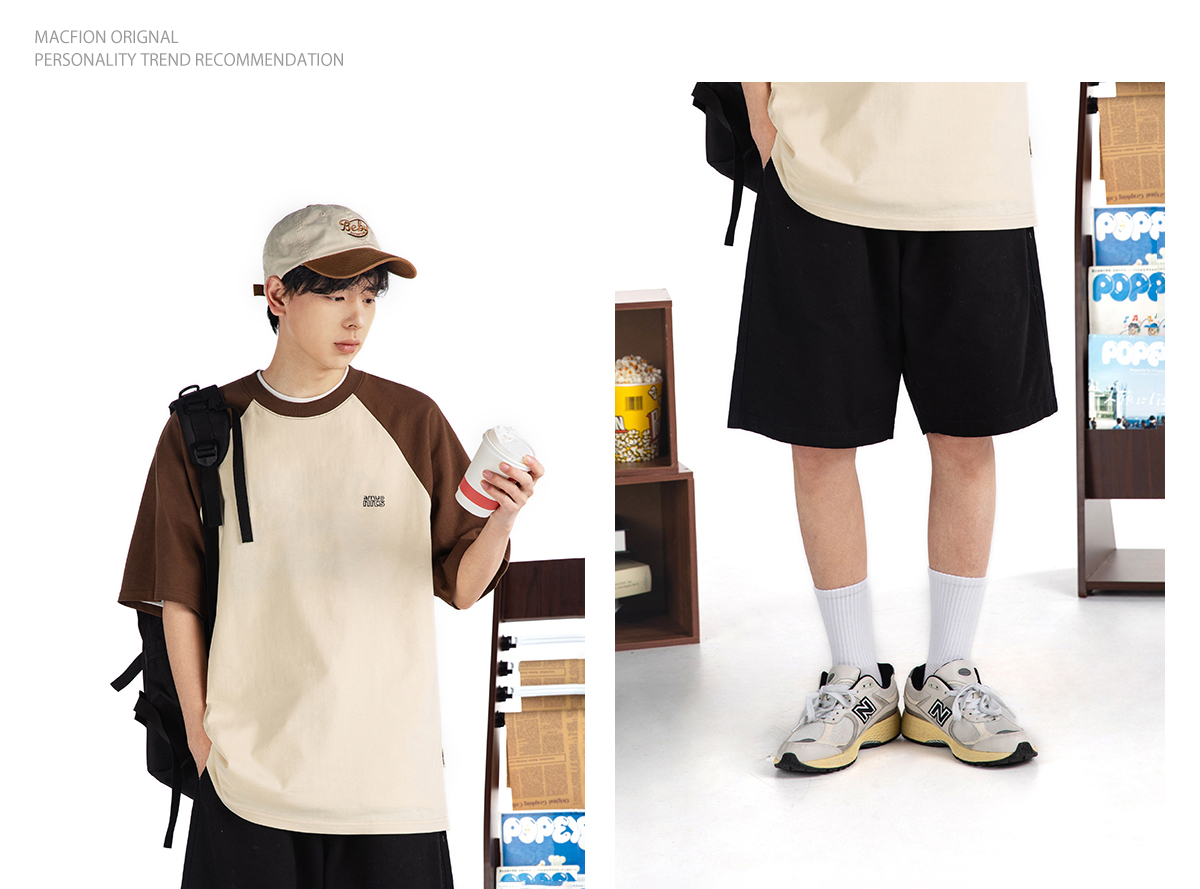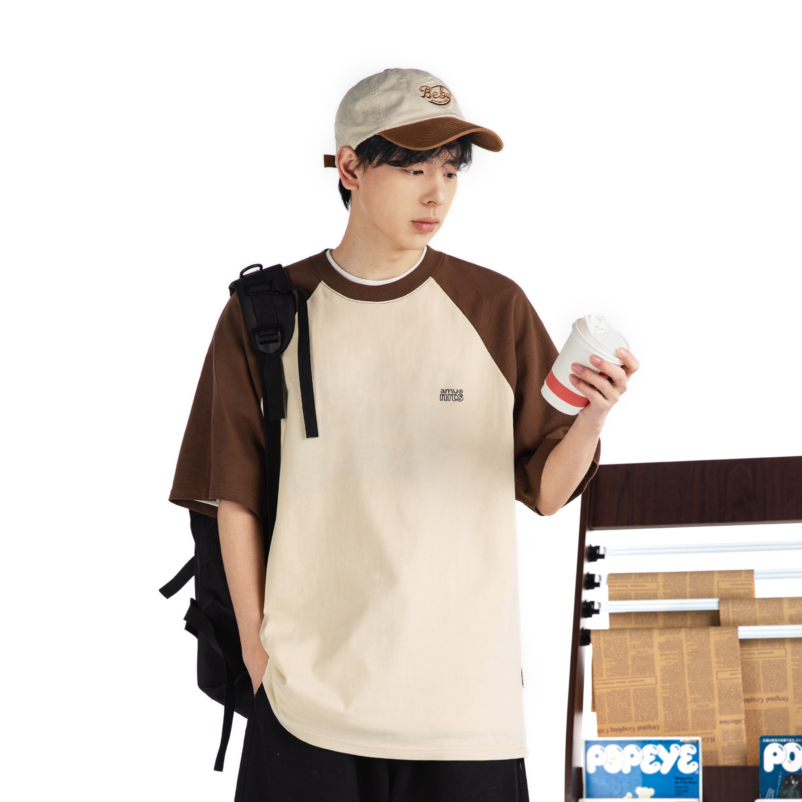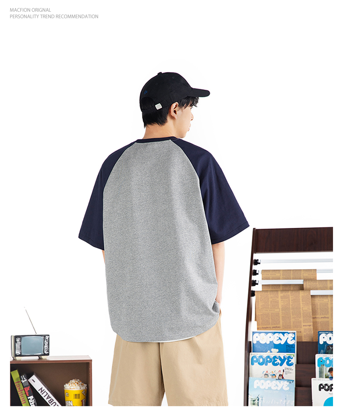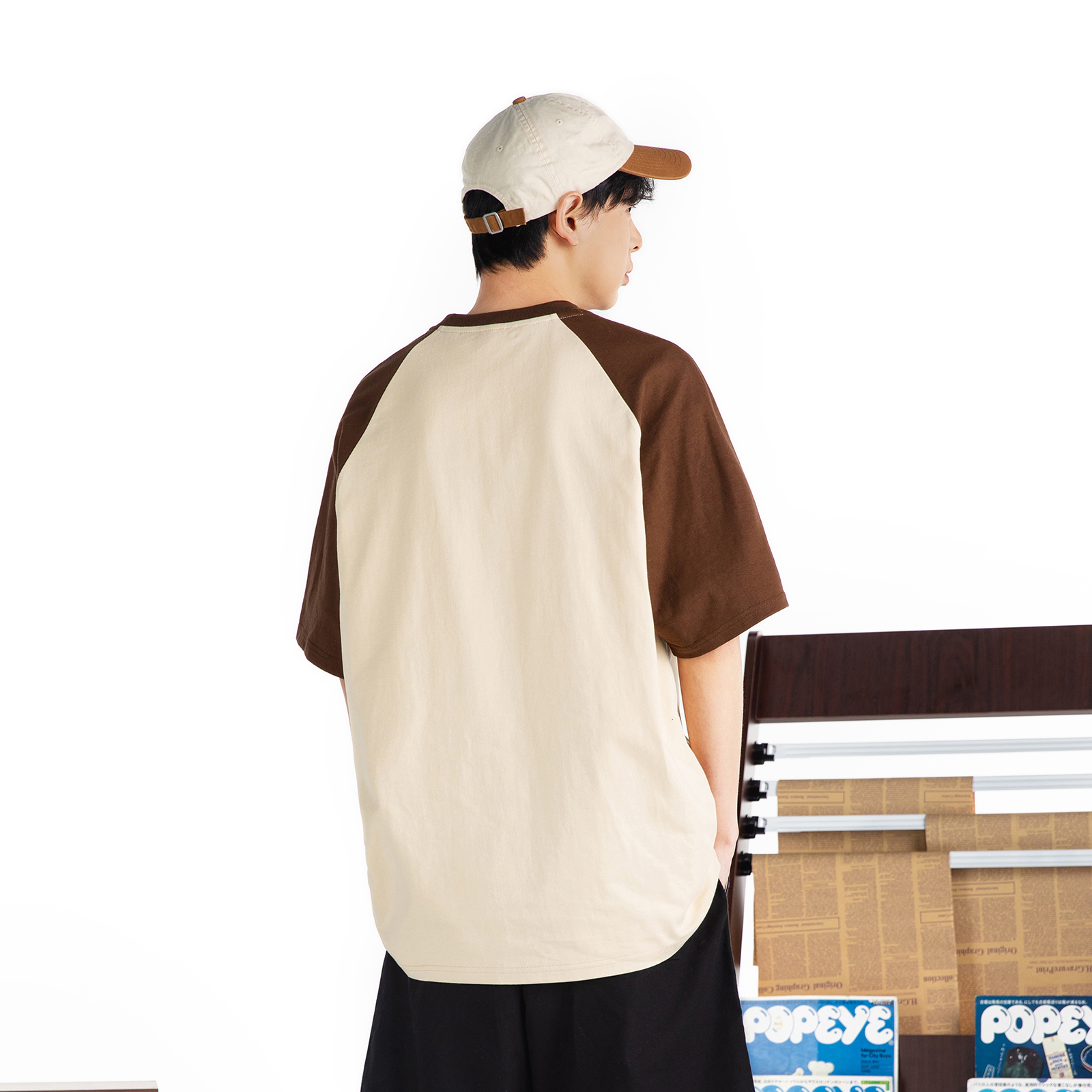 MF工作室 日系230g寬鬆插肩袖半袖T恤男女撞色復古上衣情侶潮流