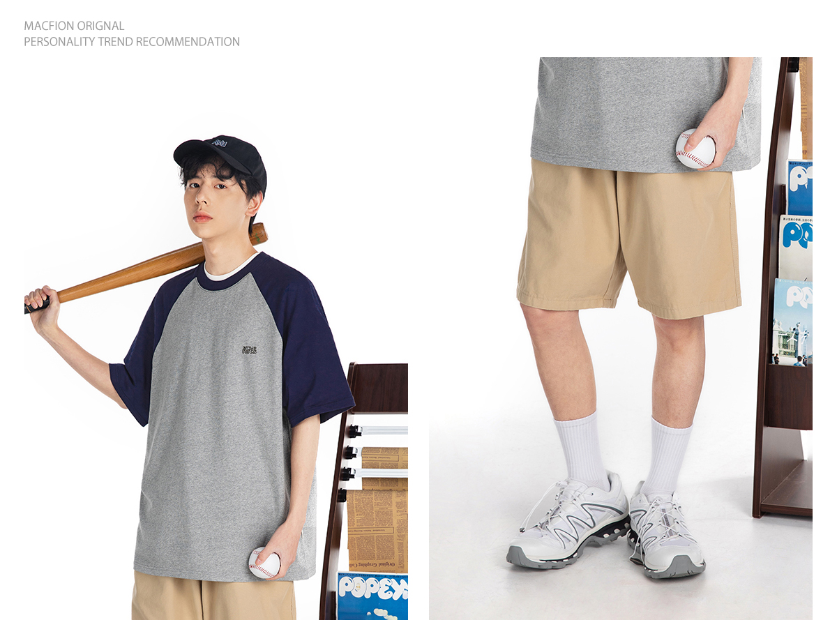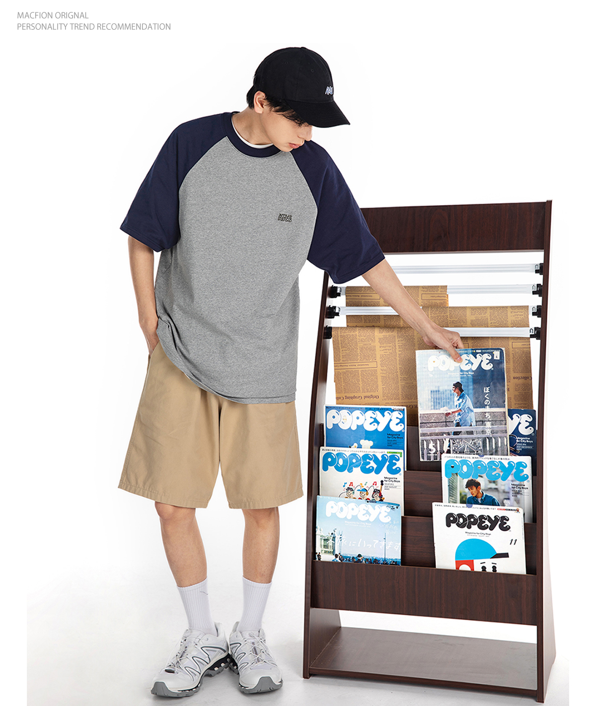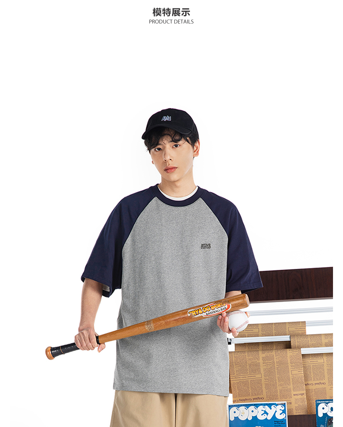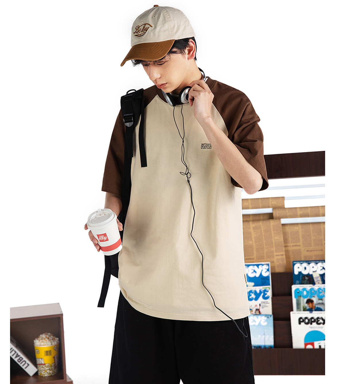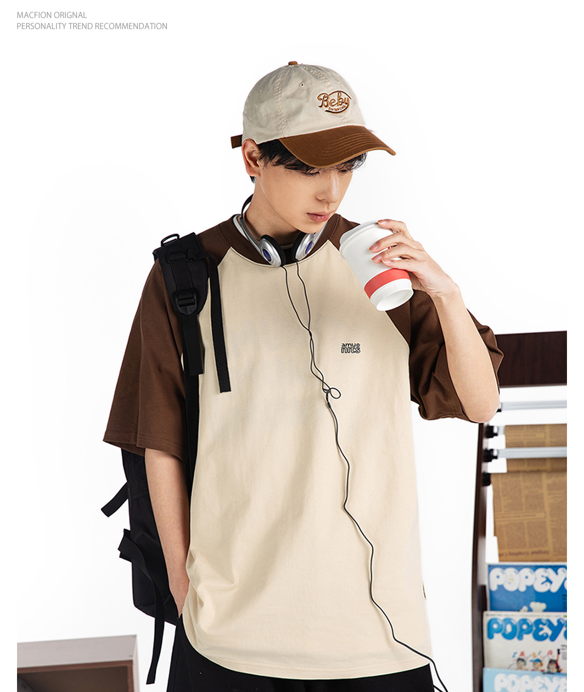 MF工作室 日系230g寬鬆插肩袖半袖T恤男女撞色復古上衣情侶潮流
