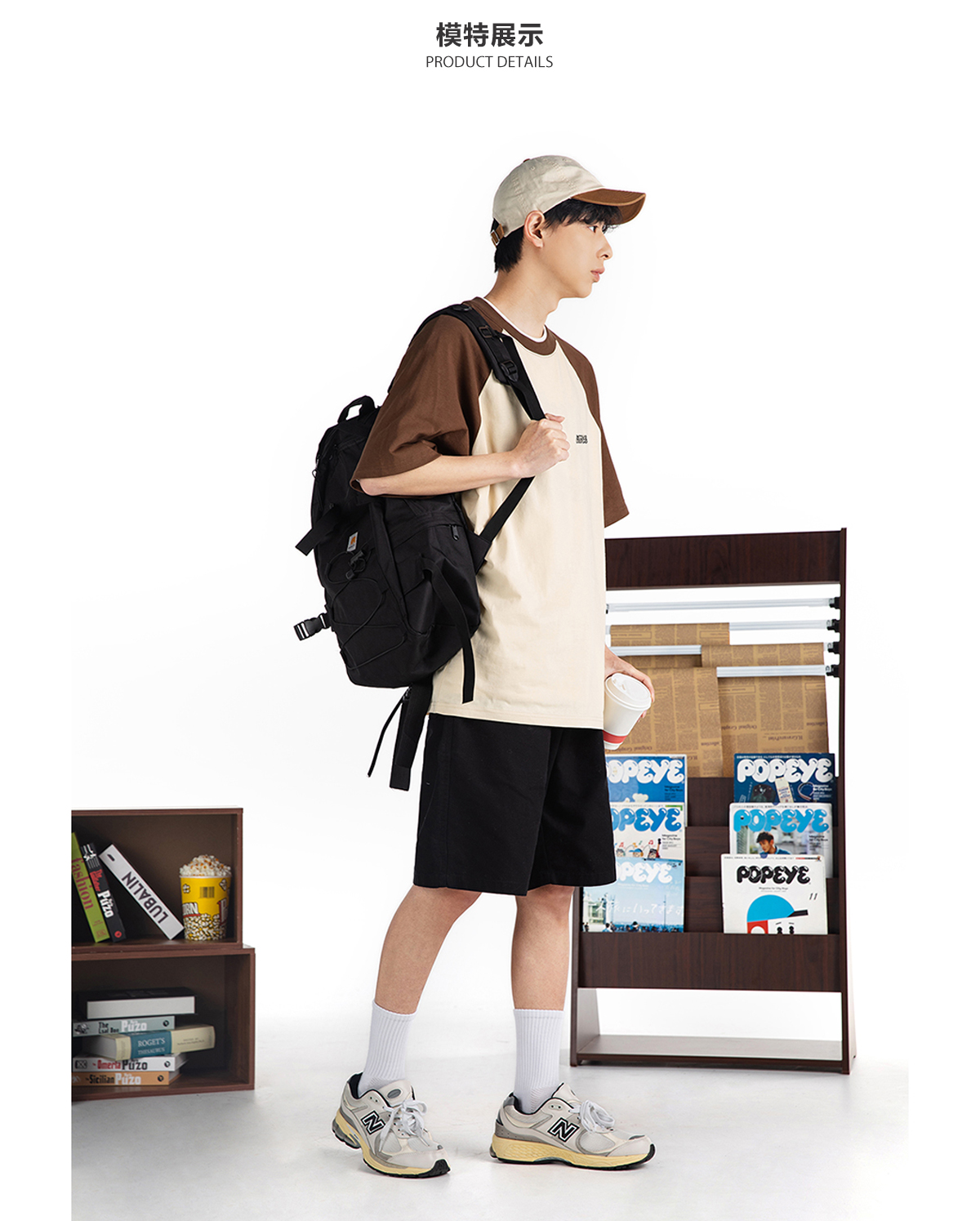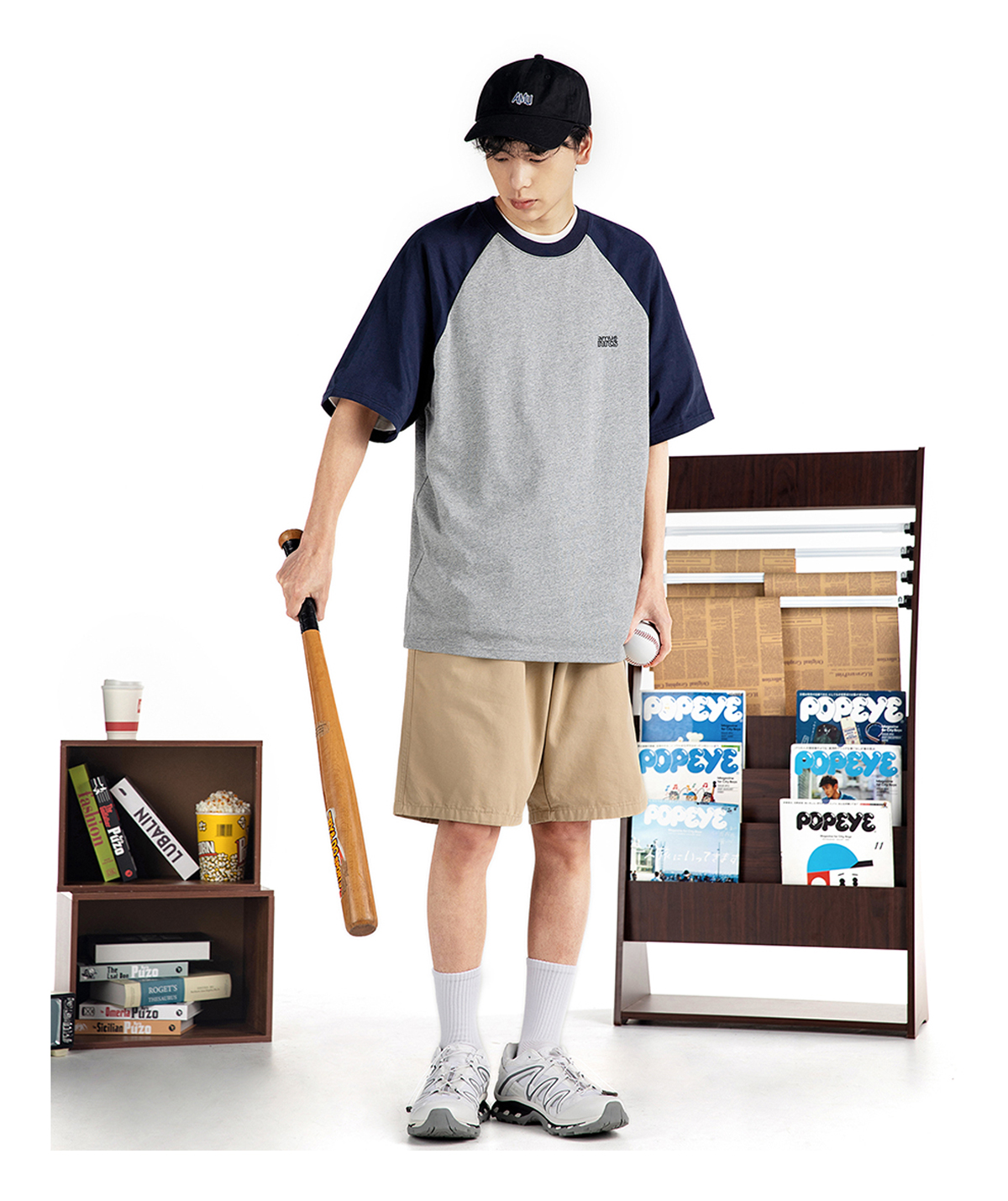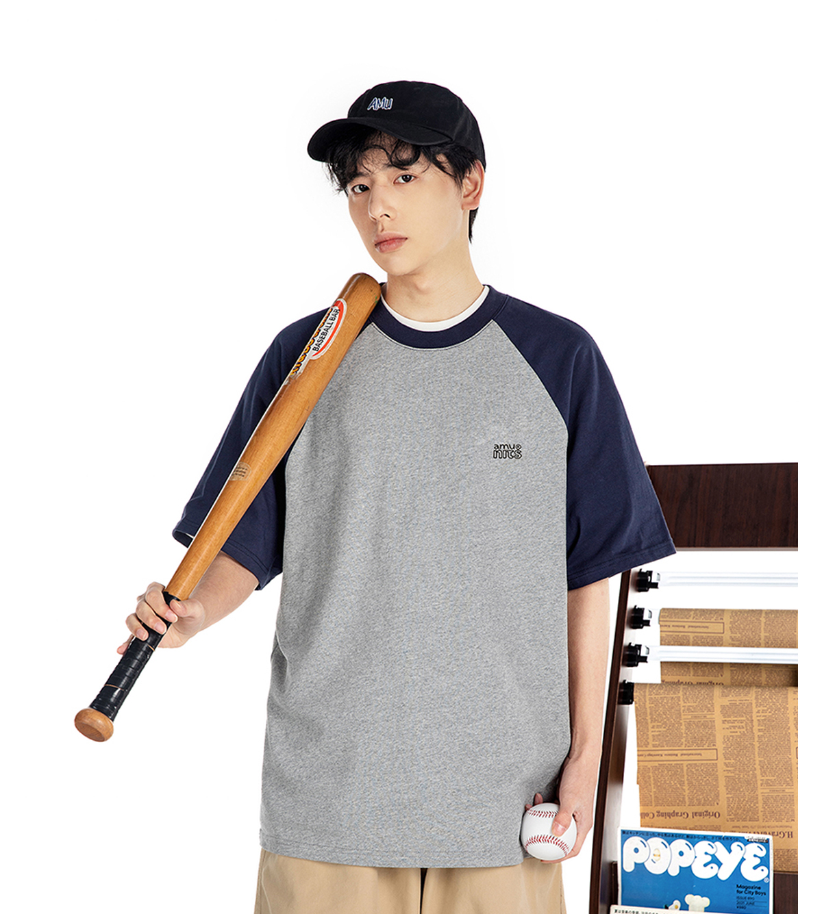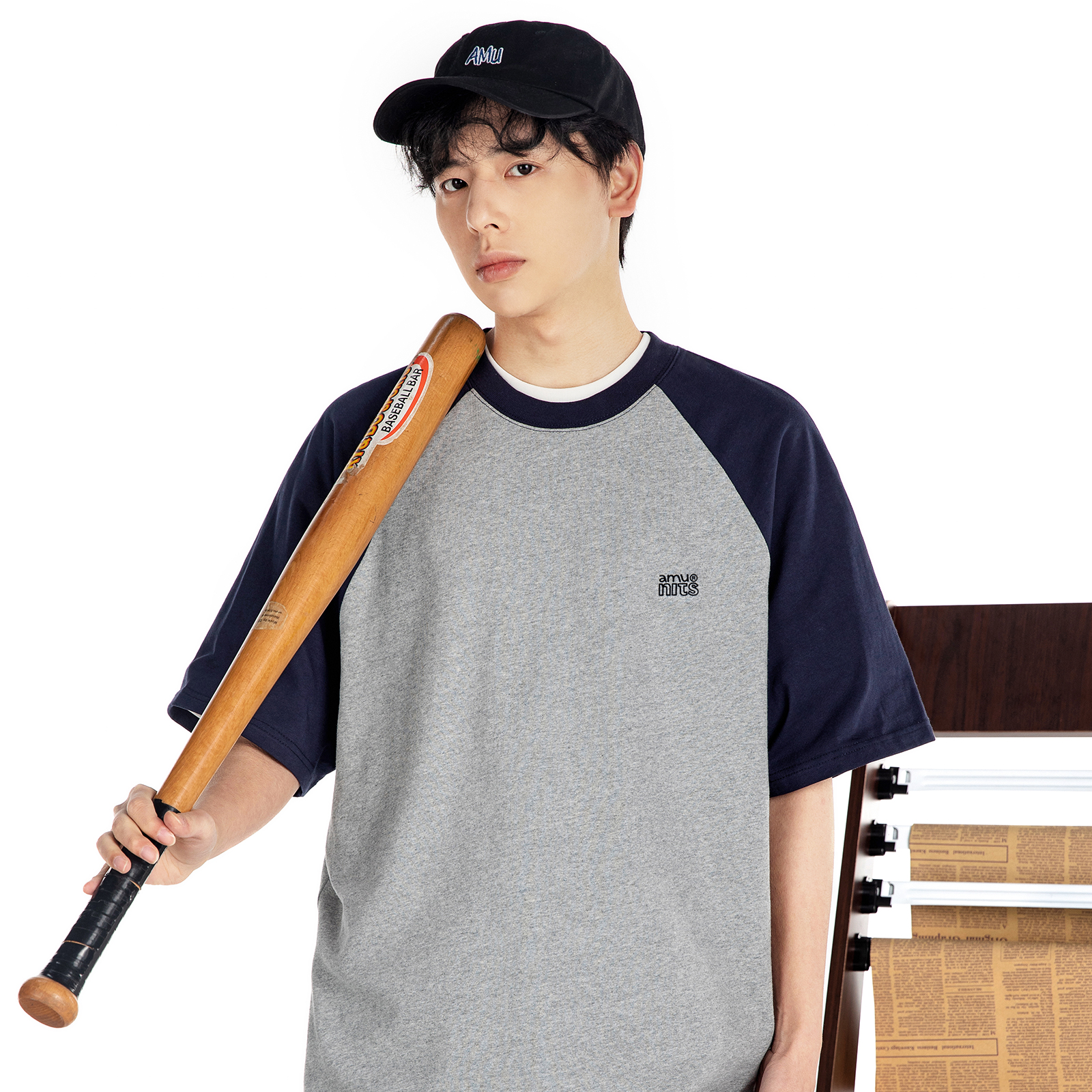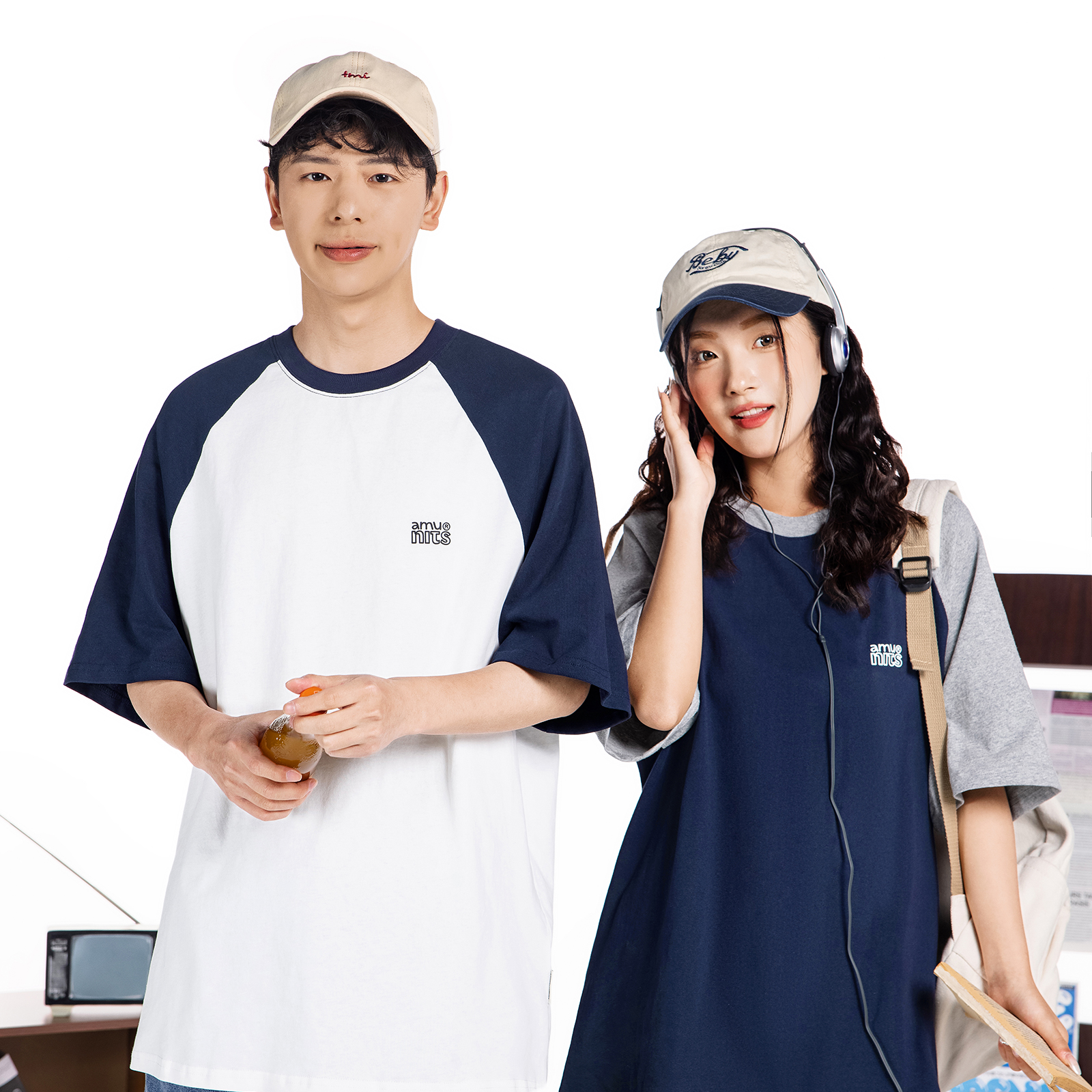 MF工作室 日系230g寬鬆插肩袖半袖T恤男女撞色復古上衣情侶潮流