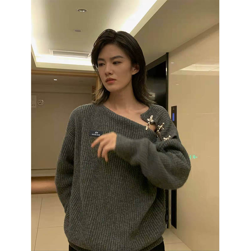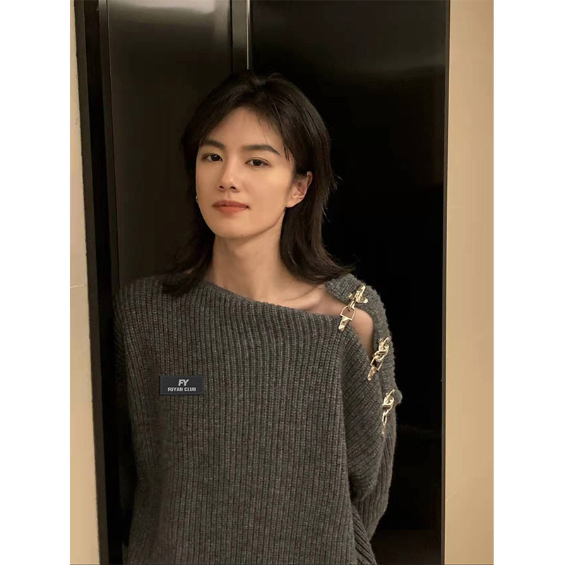 露肩毛衣女士春秋季新款寬鬆慵懶風別致設計感小眾炸街針織衫上衣