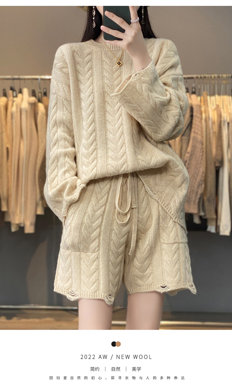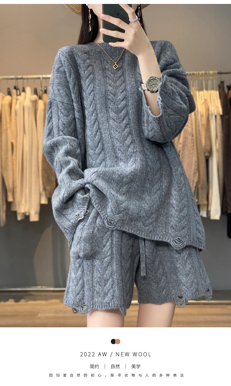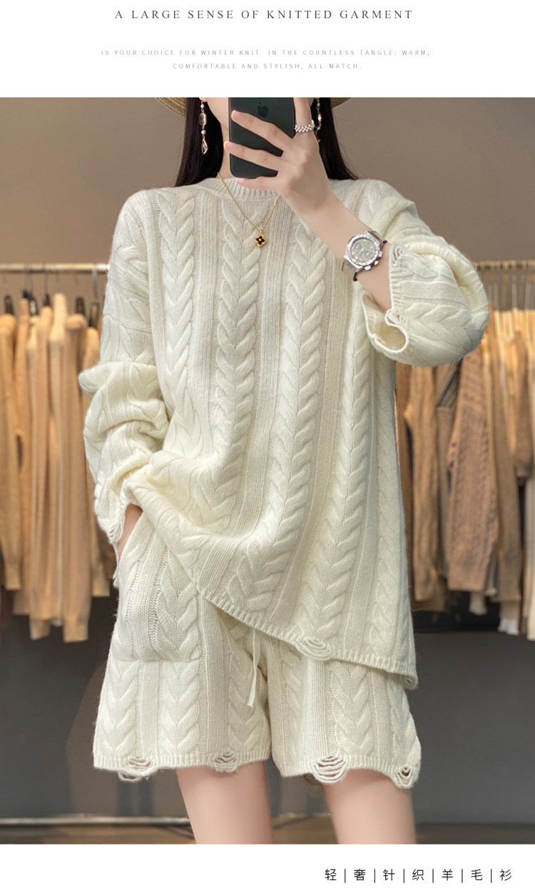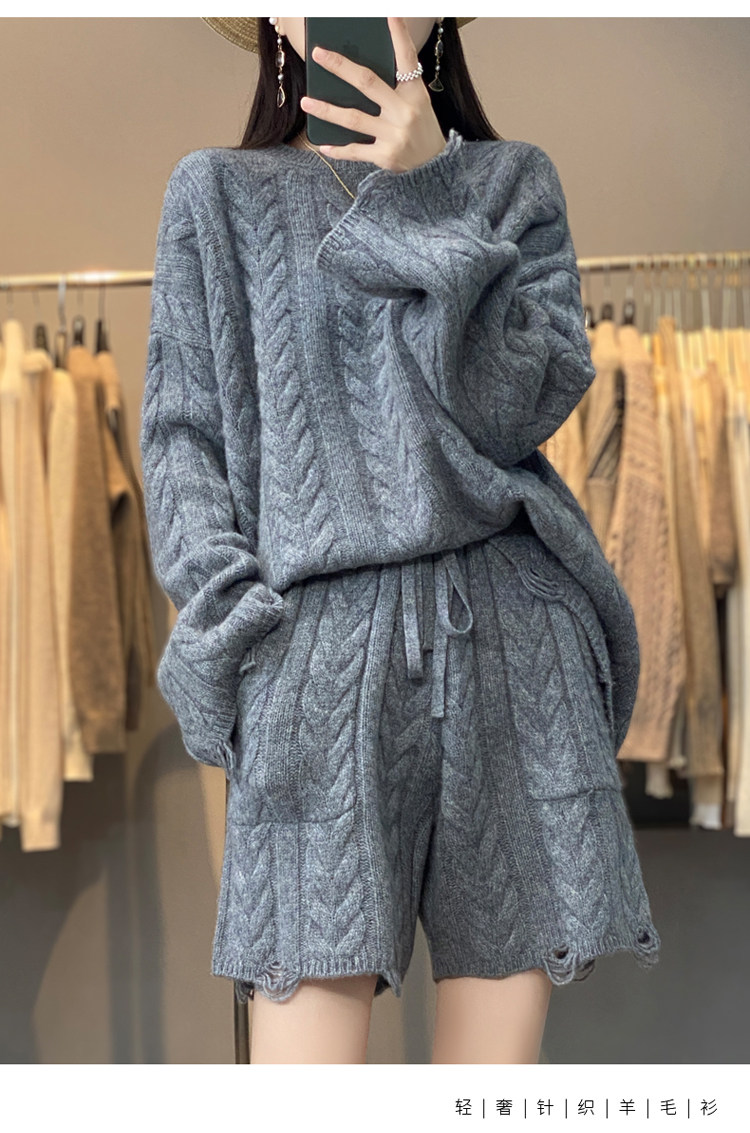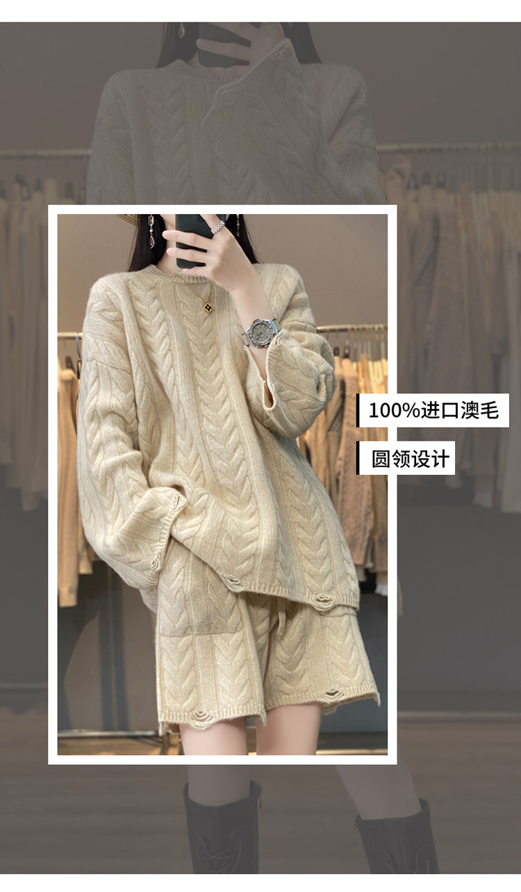 加厚麻花羊毛衫套裝女純色圓領套頭羊絨衫短褲兩件套寬鬆長袖針織