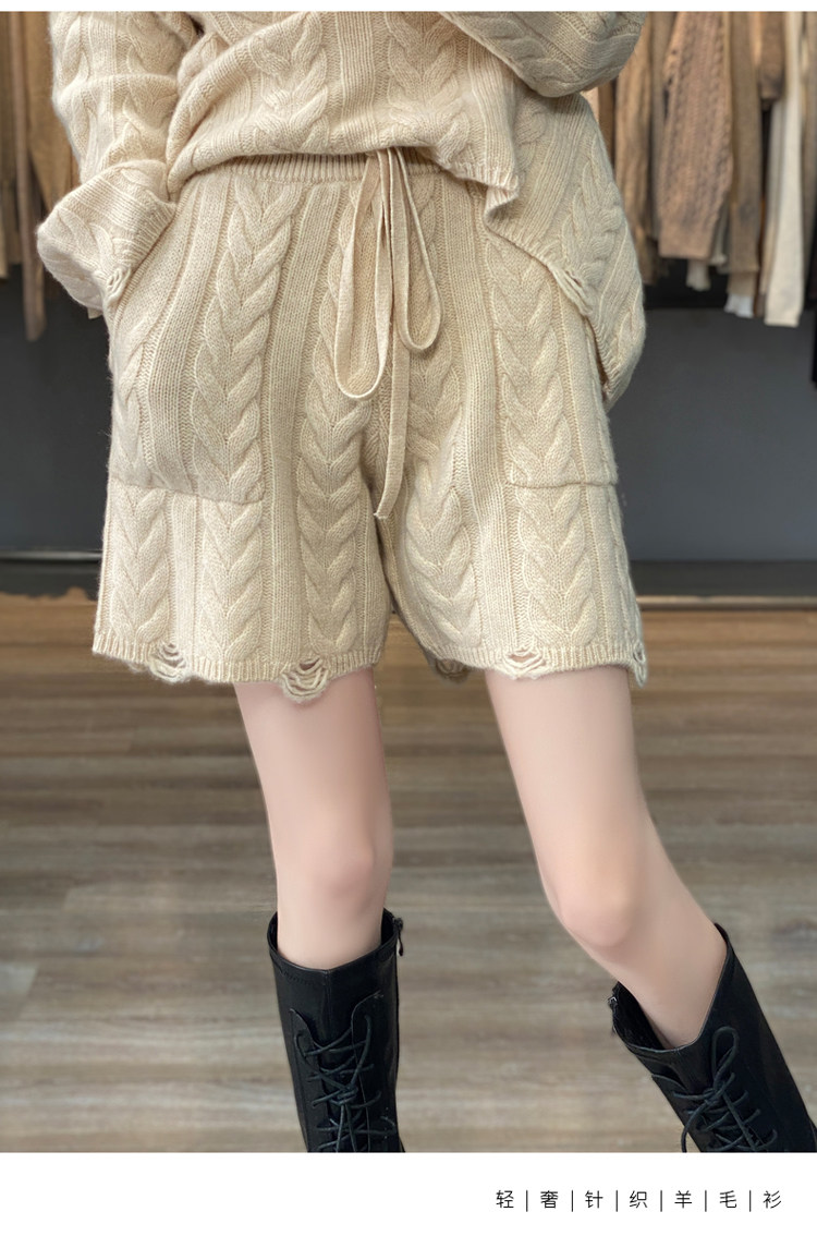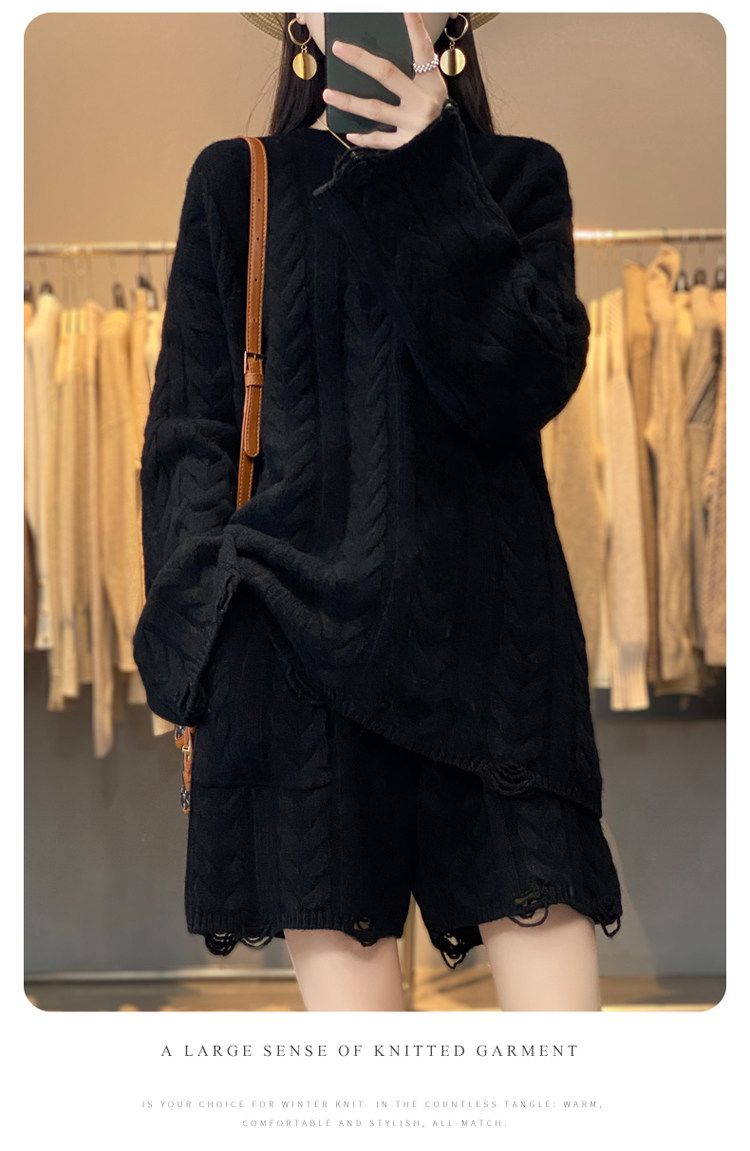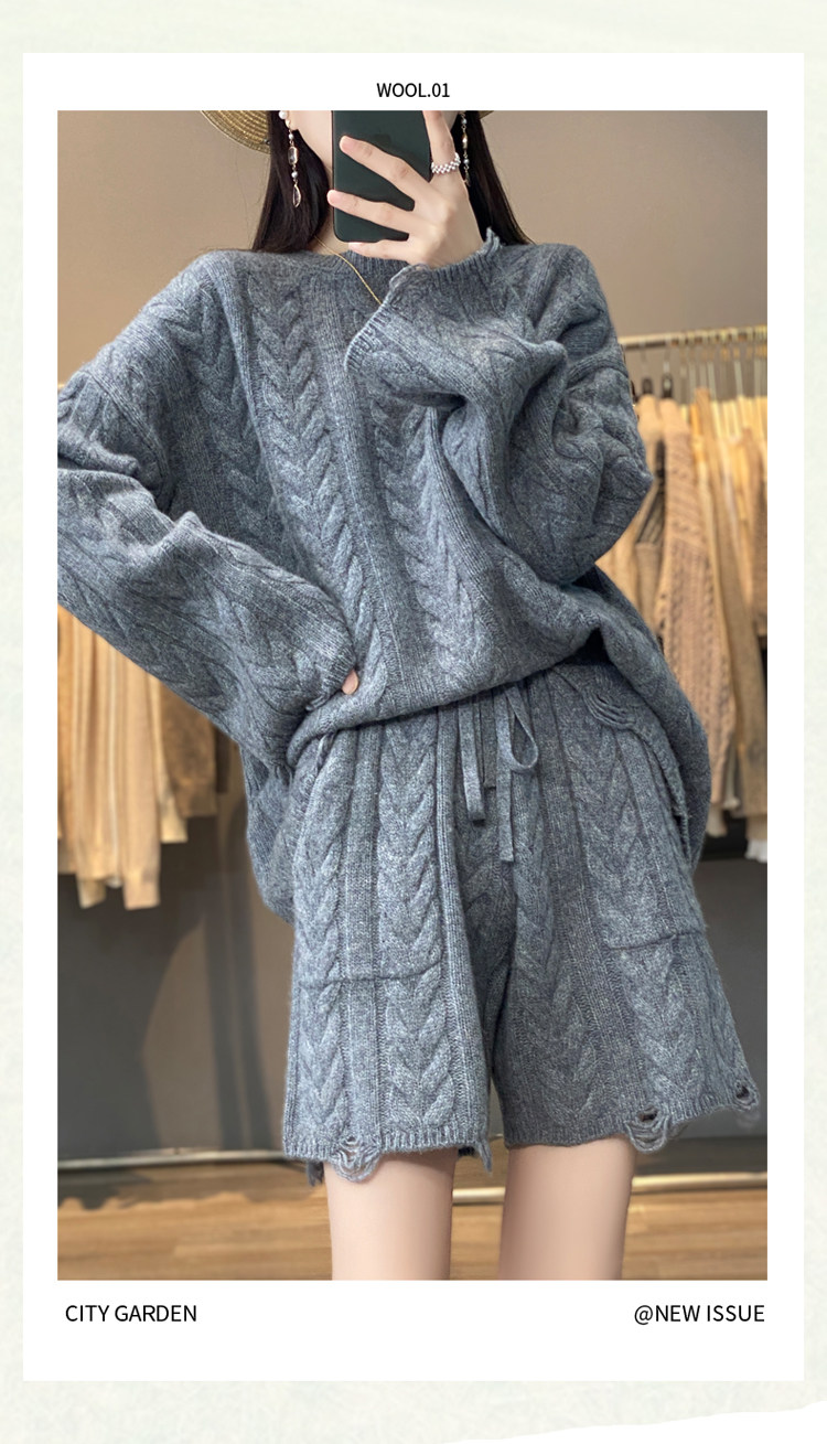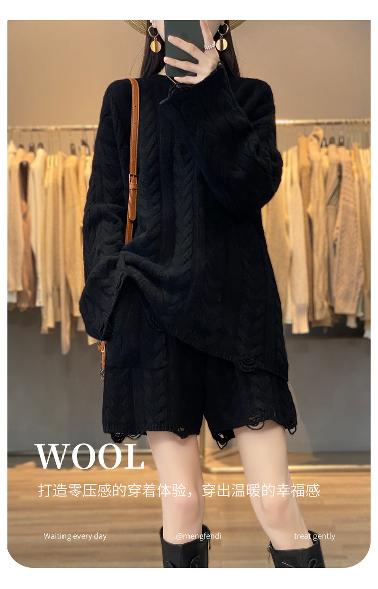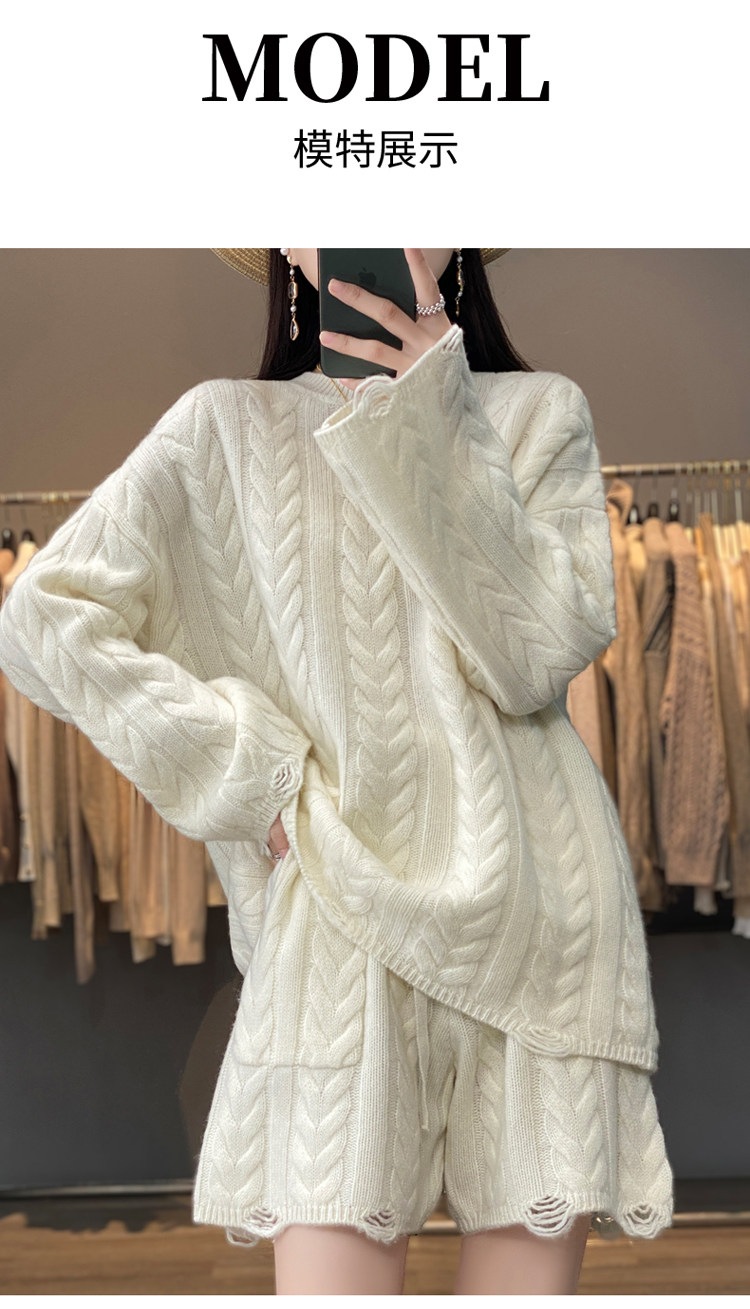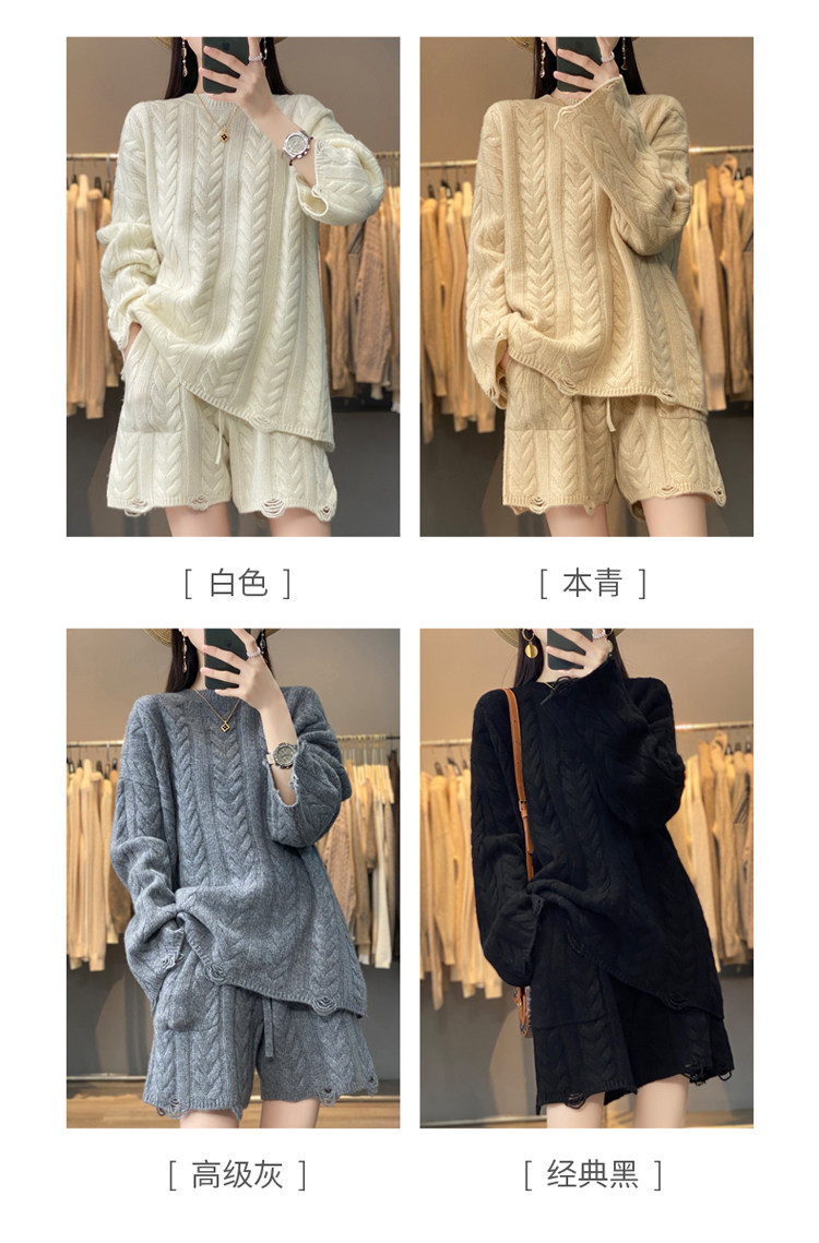 加厚麻花羊毛衫套裝女純色圓領套頭羊絨衫短褲兩件套寬鬆長袖針織