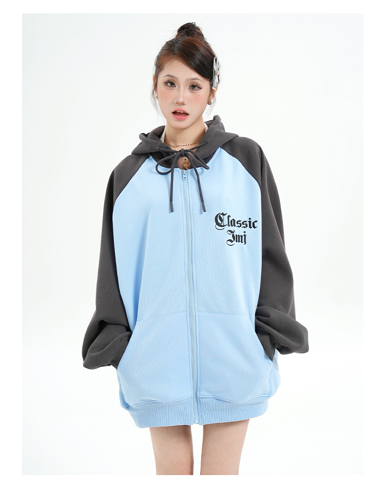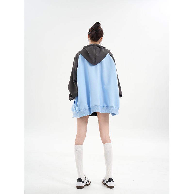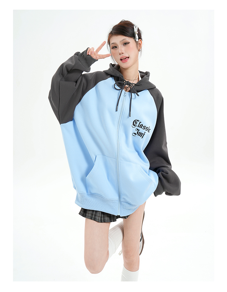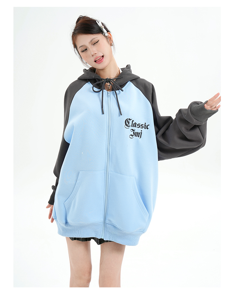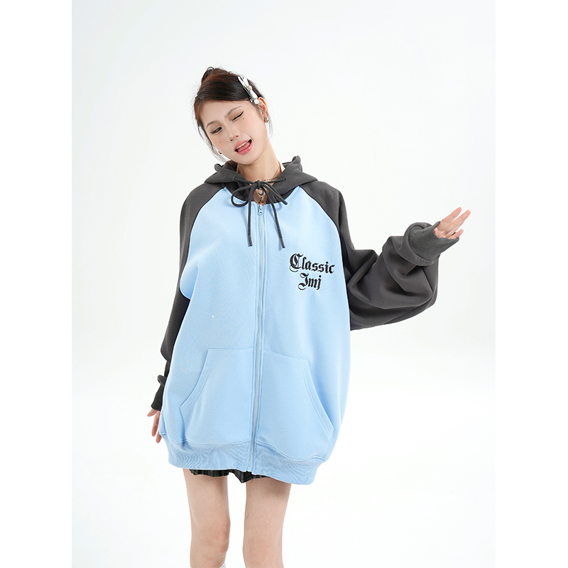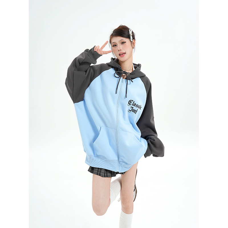 JMJ2023原創自制美式連帽撞色插肩袖衛衣開衫男女寬鬆休閒外套