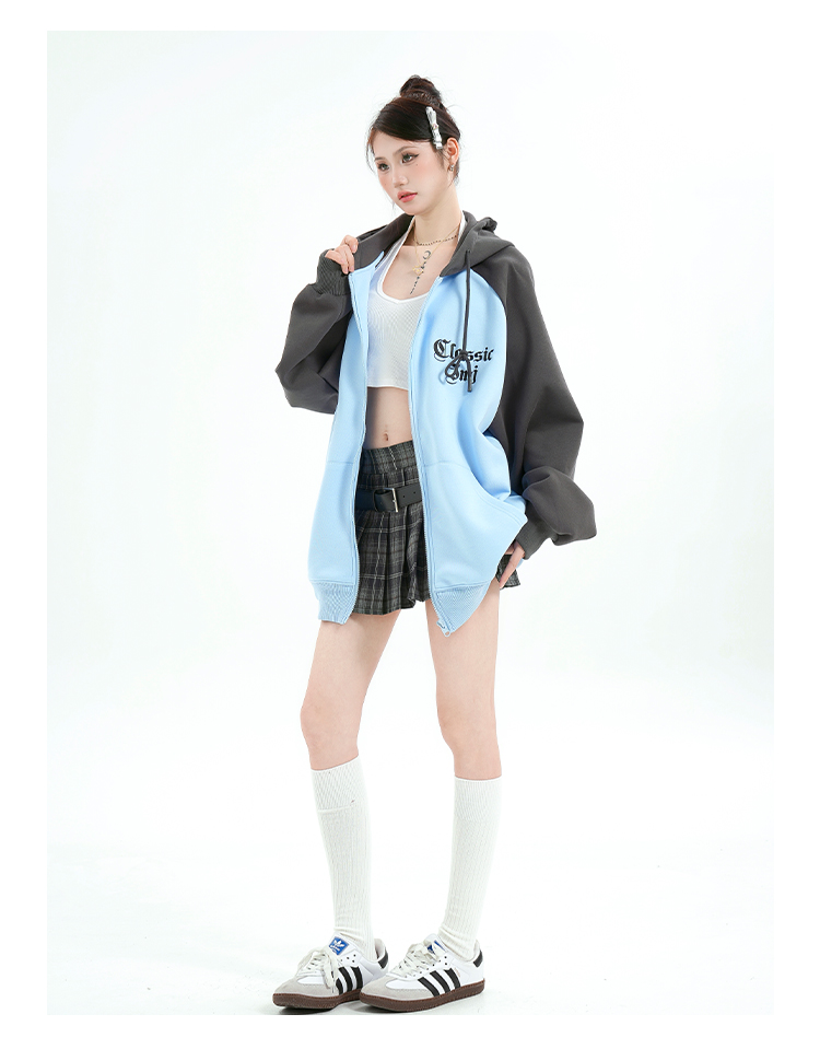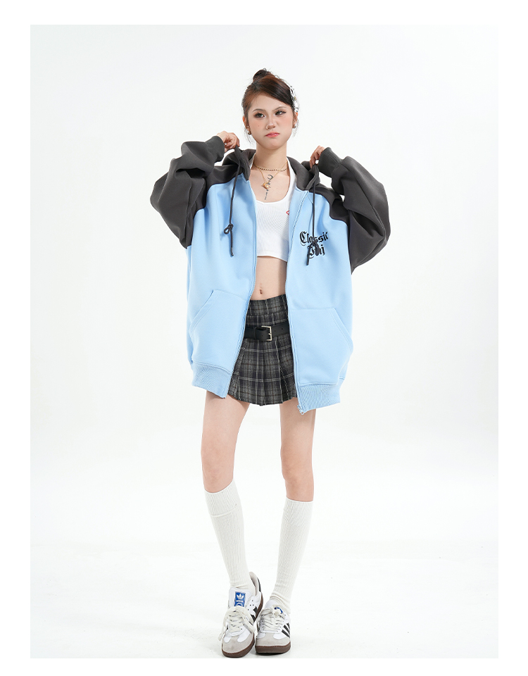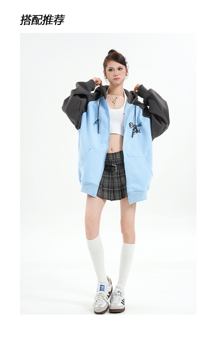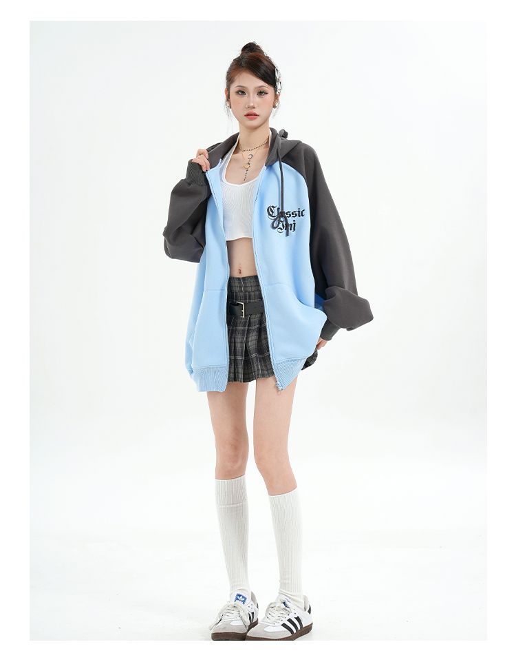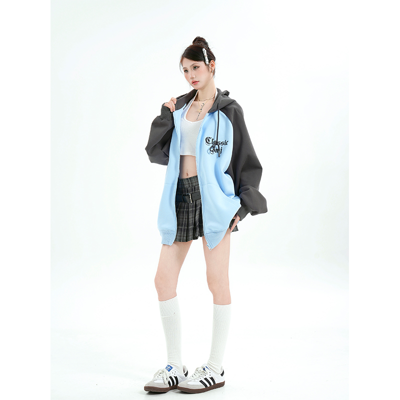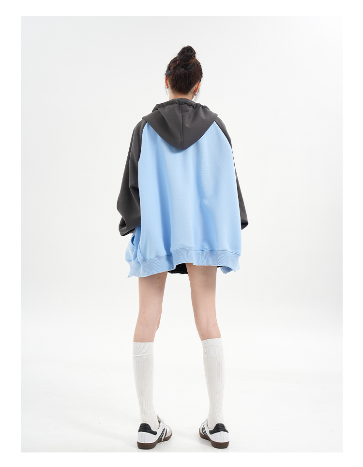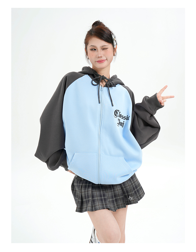 JMJ2023原創自制美式連帽撞色插肩袖衛衣開衫男女寬鬆休閒外套
