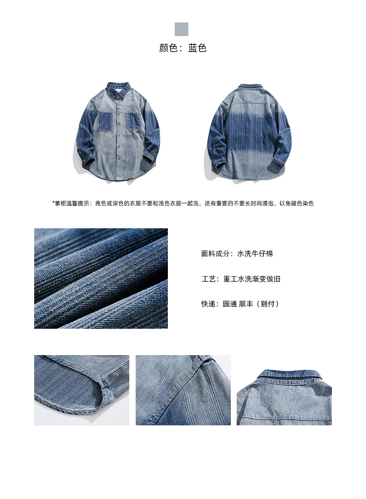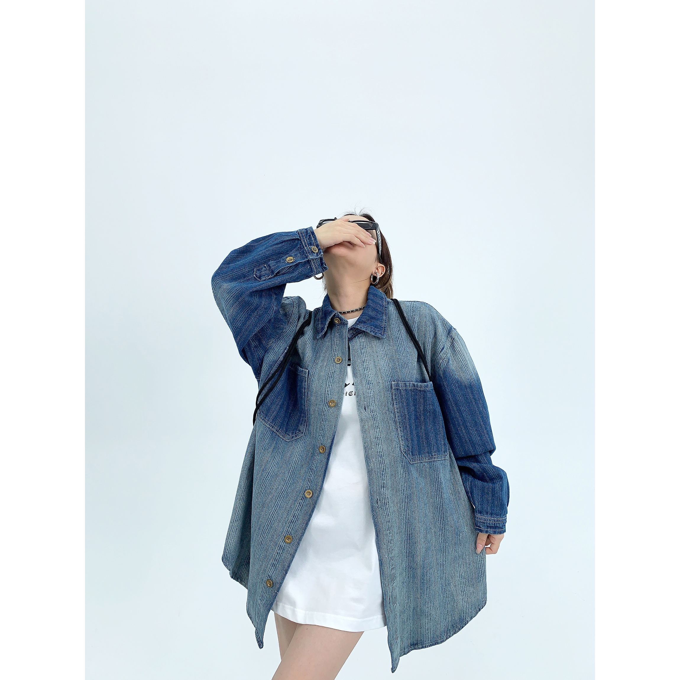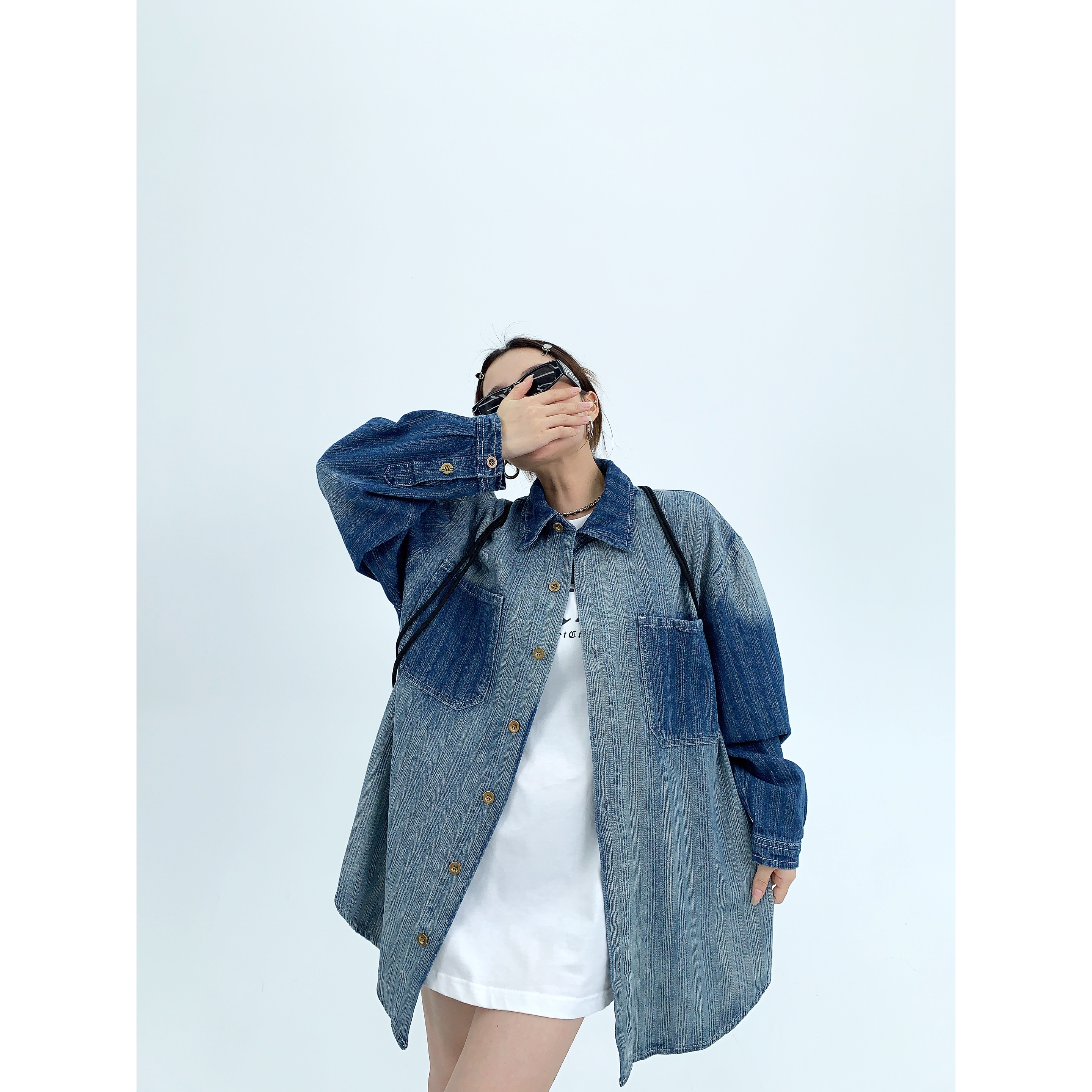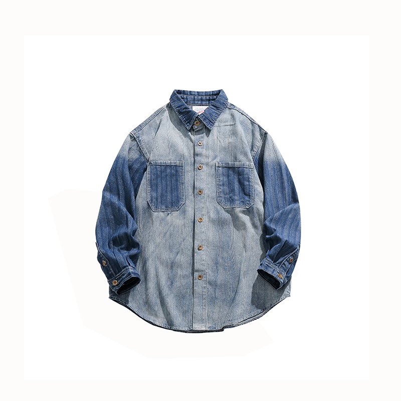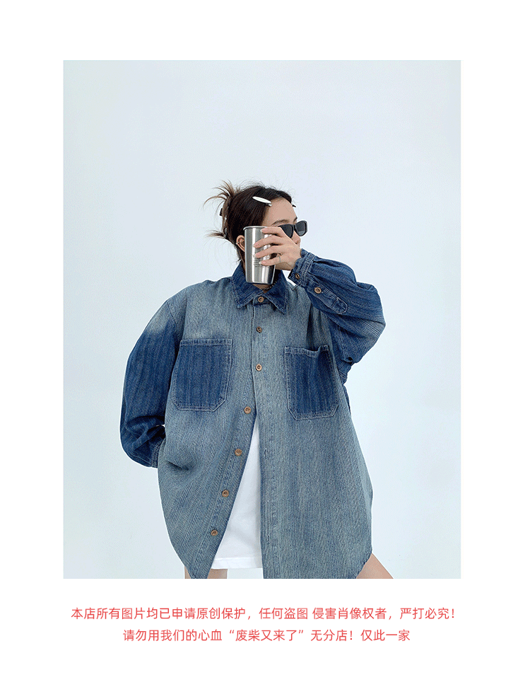 廢柴秋季chic美式重磅小眾做舊襯衫開衫寬鬆復古漸層牛仔襯衫女潮