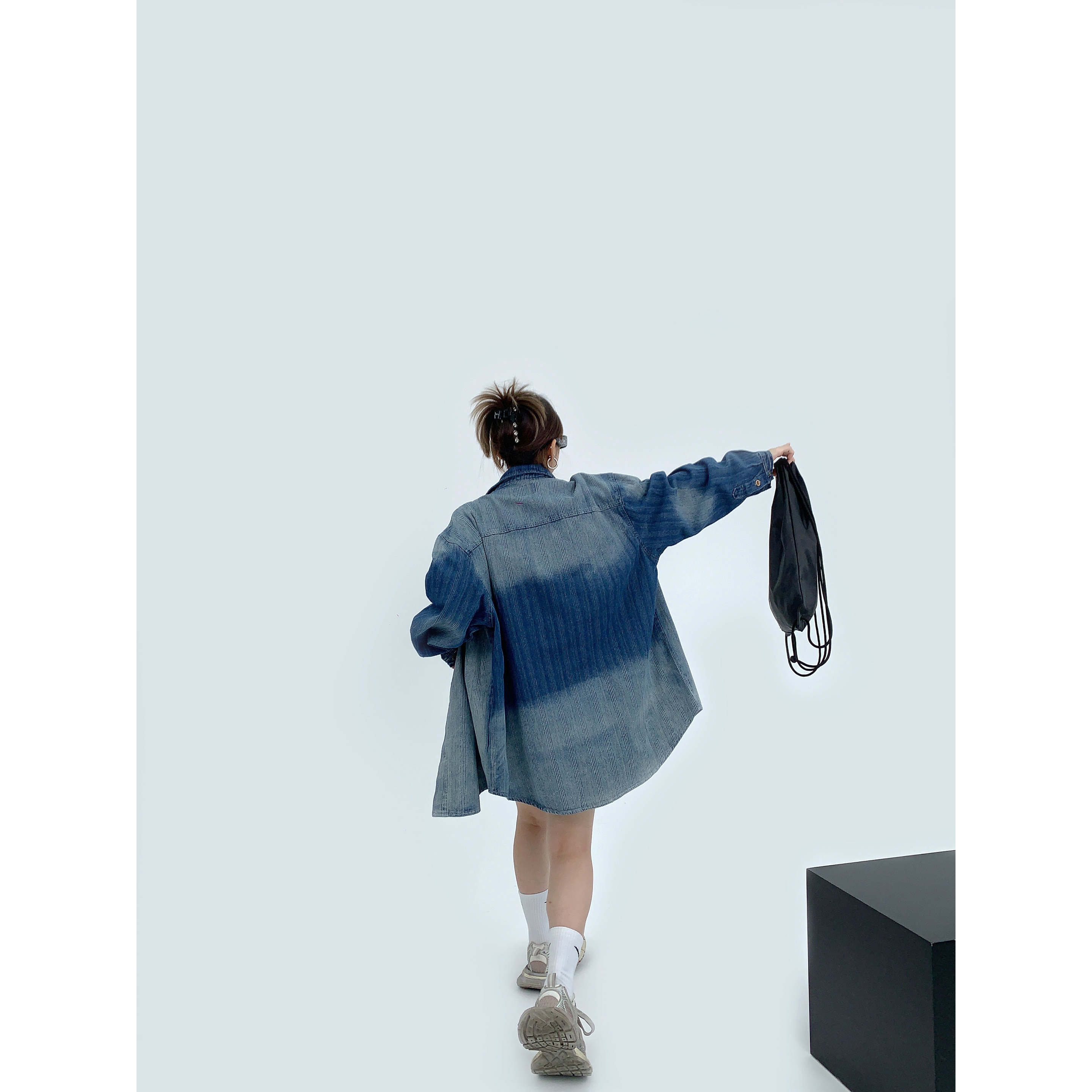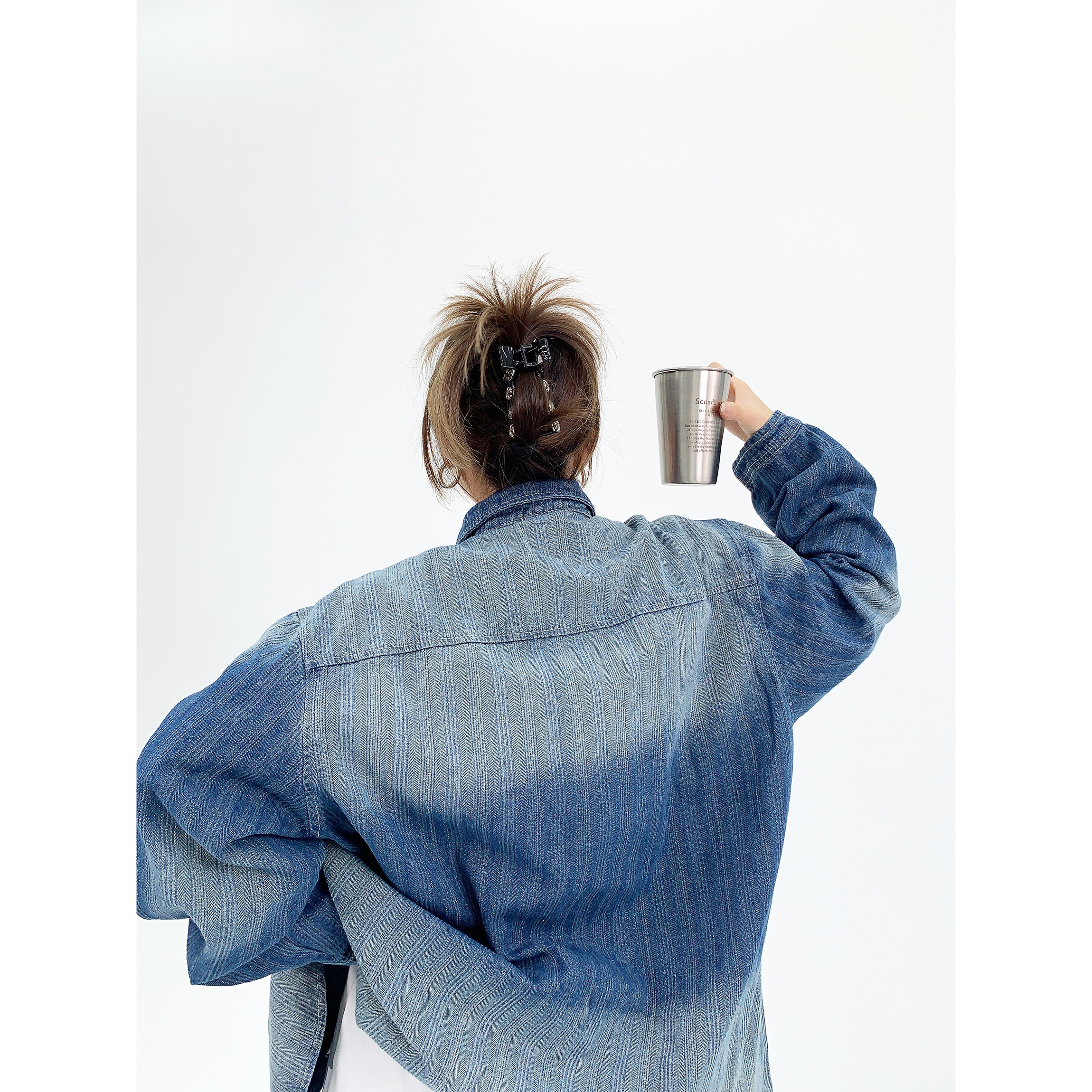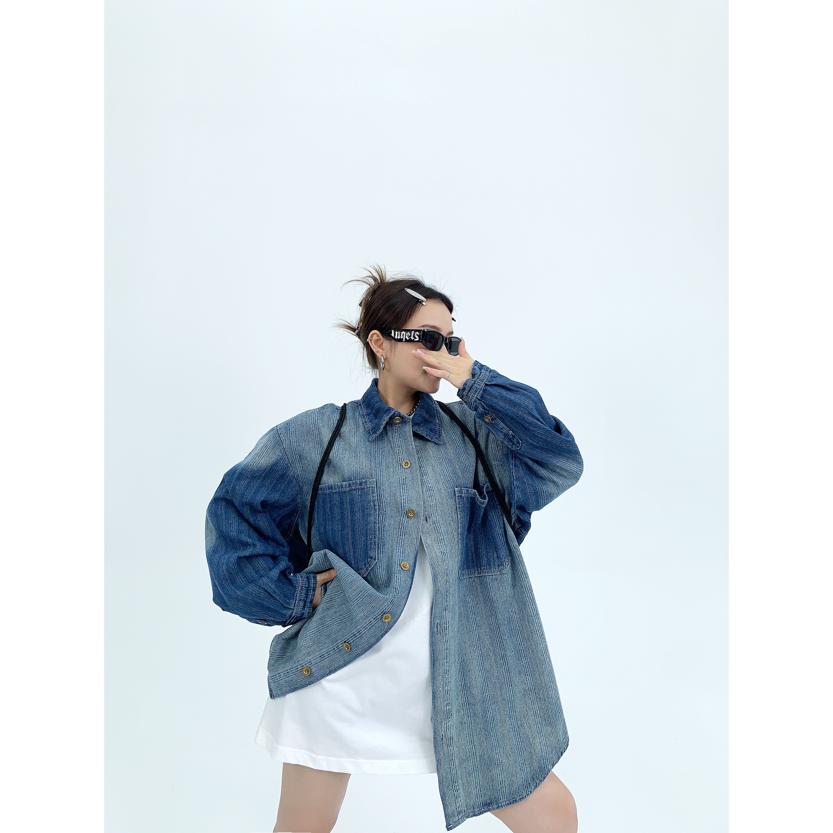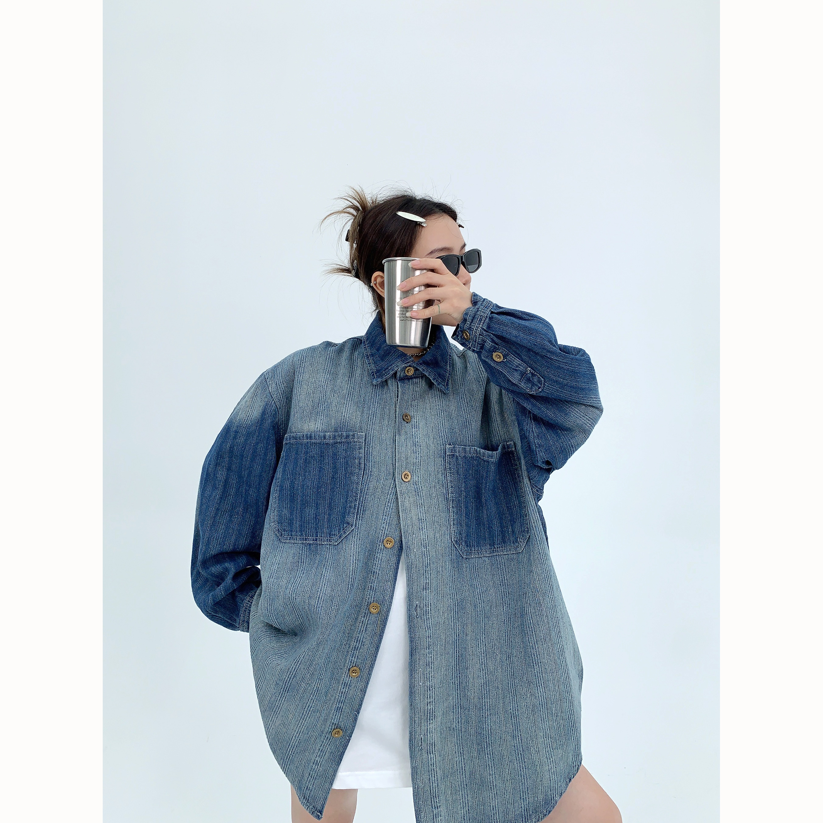 廢柴秋季chic美式重磅小眾做舊襯衫開衫寬鬆復古漸層牛仔襯衫女潮