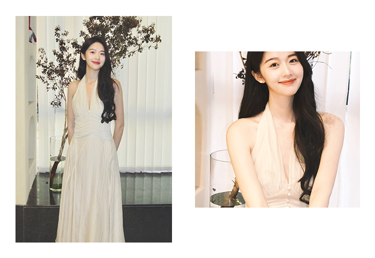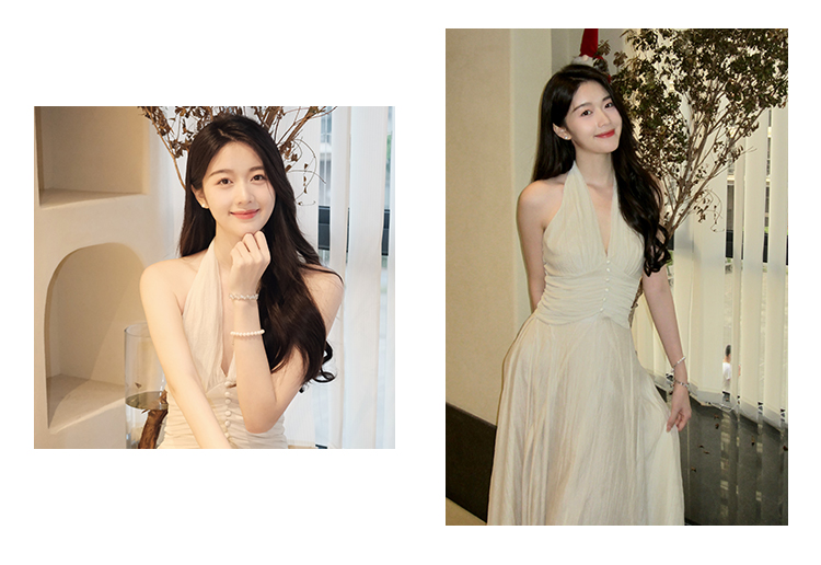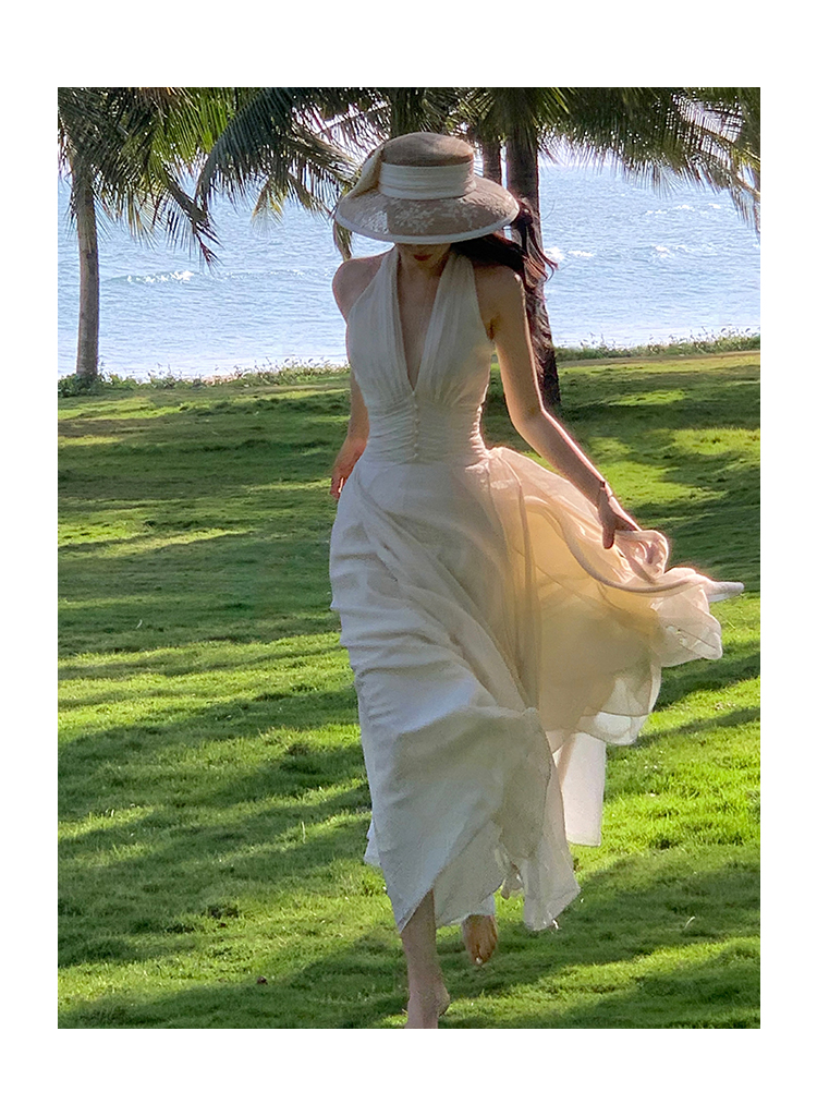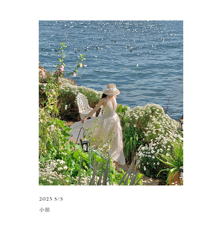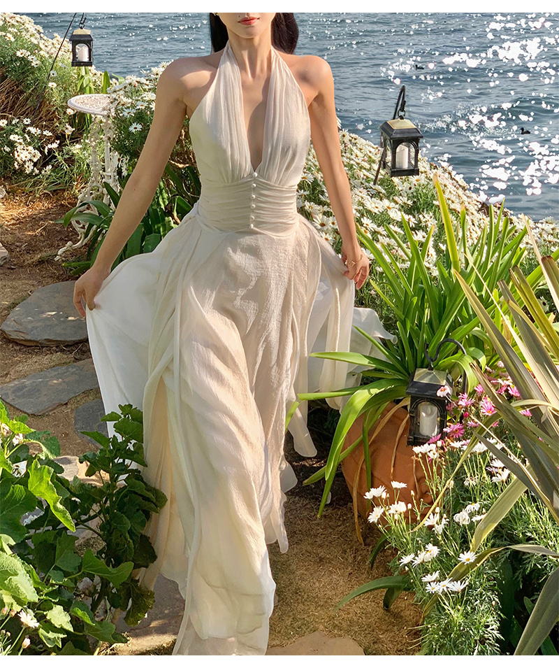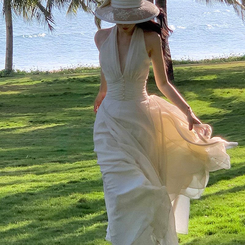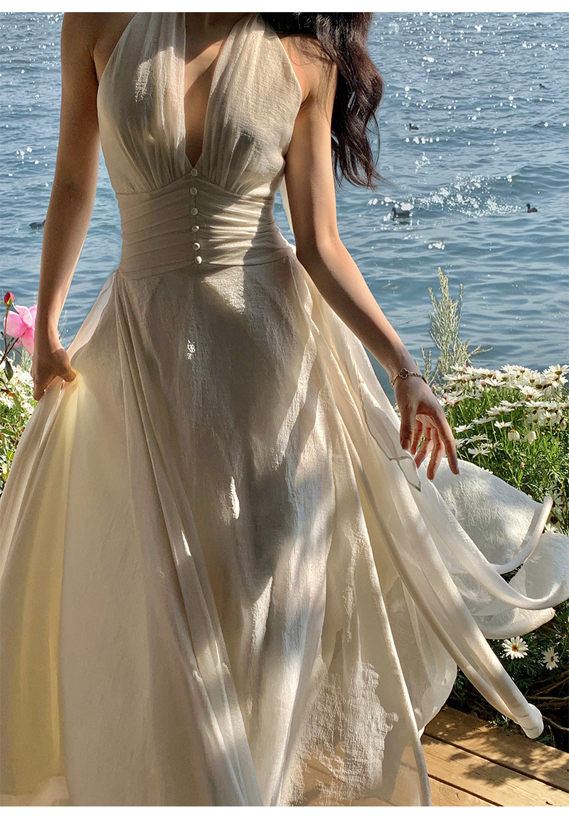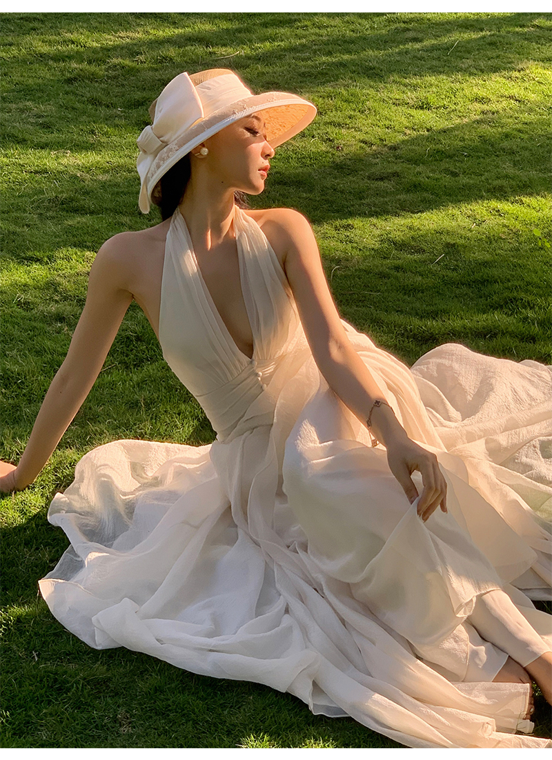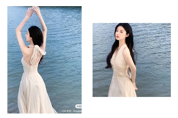 小麗XIAOLI美神降臨無袖V領掛頸洋裝夏溫柔氣質收腰顯瘦長裙子