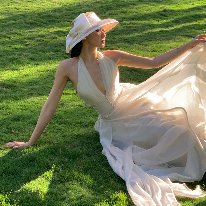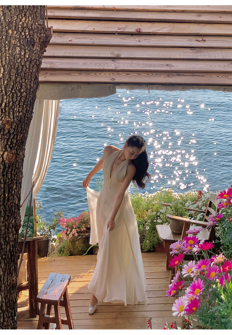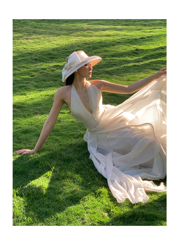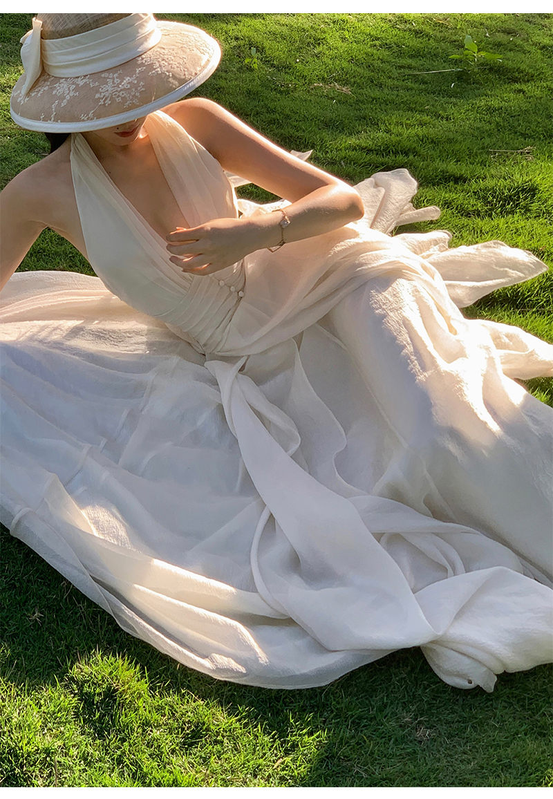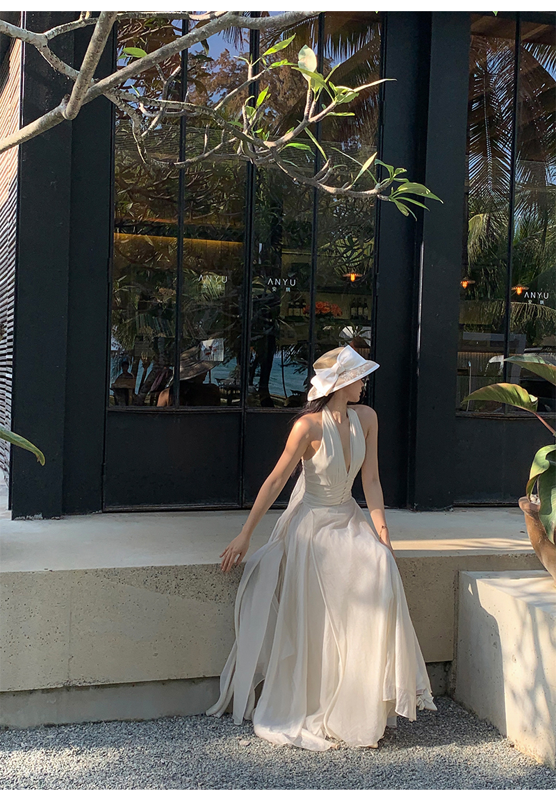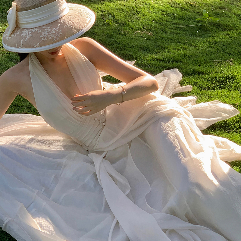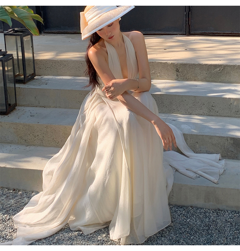 小麗XIAOLI美神降臨無袖V領掛頸洋裝夏溫柔氣質收腰顯瘦長裙子