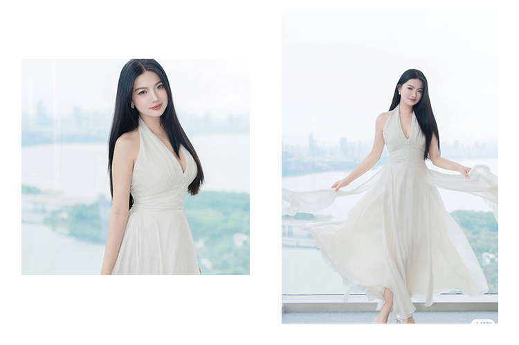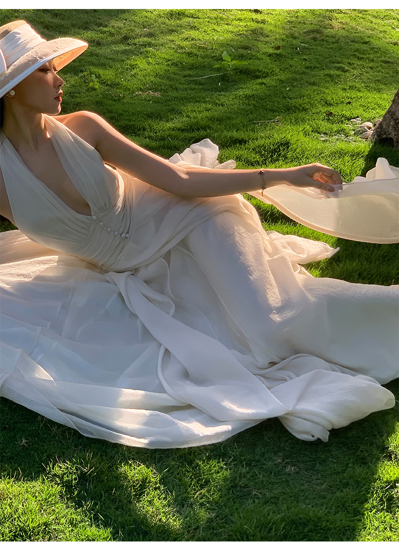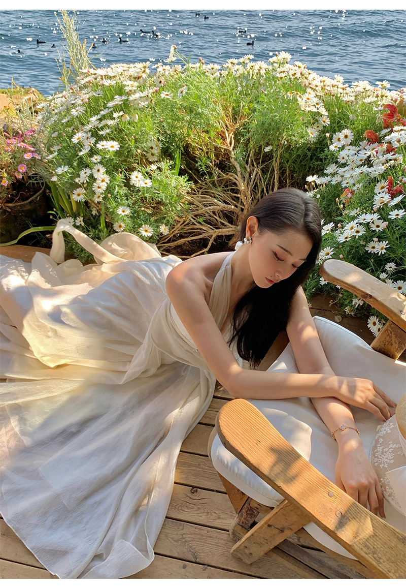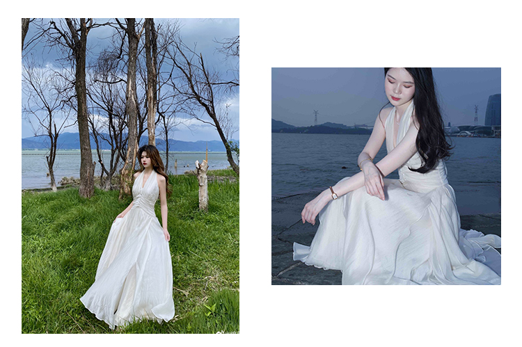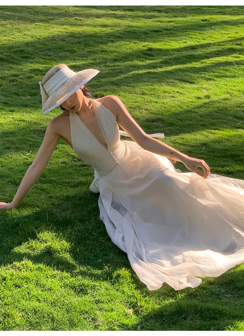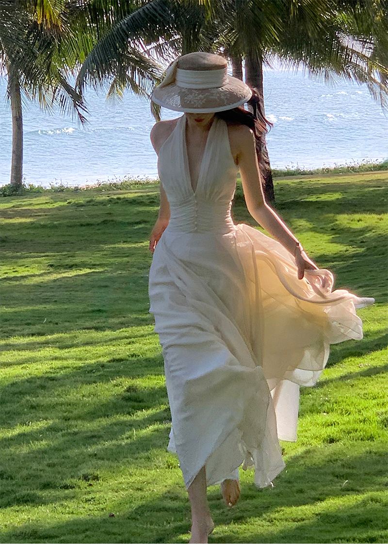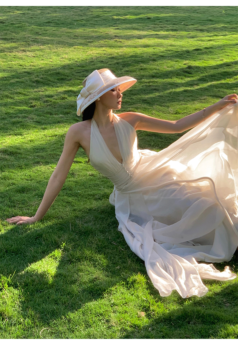 小麗XIAOLI美神降臨無袖V領掛頸洋裝夏溫柔氣質收腰顯瘦長裙子