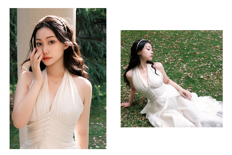 挂脖在胸前形成褶皱并延申至颈后做绑带设计