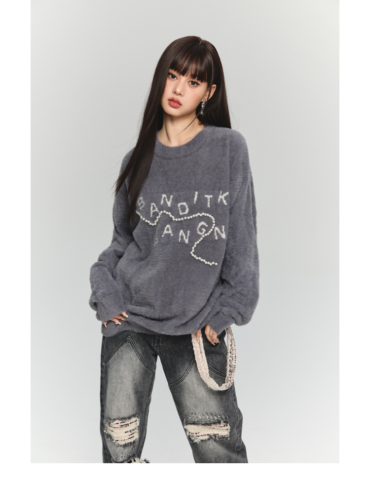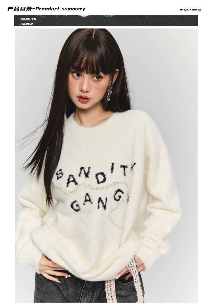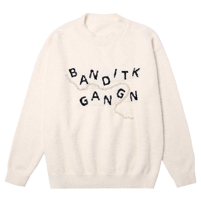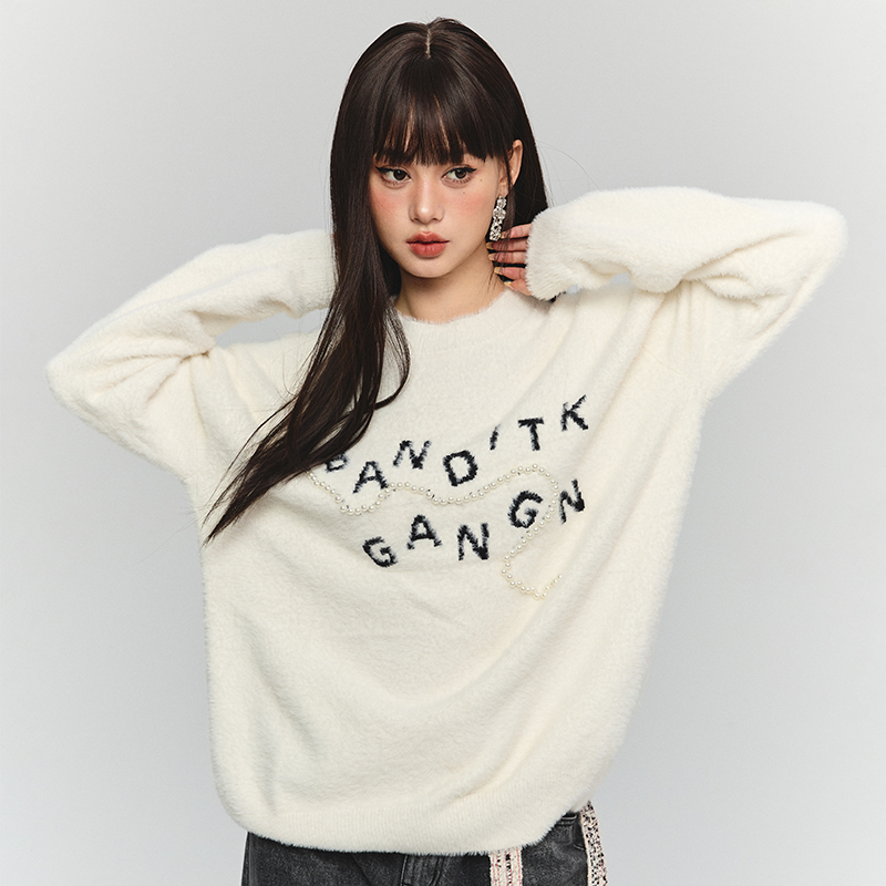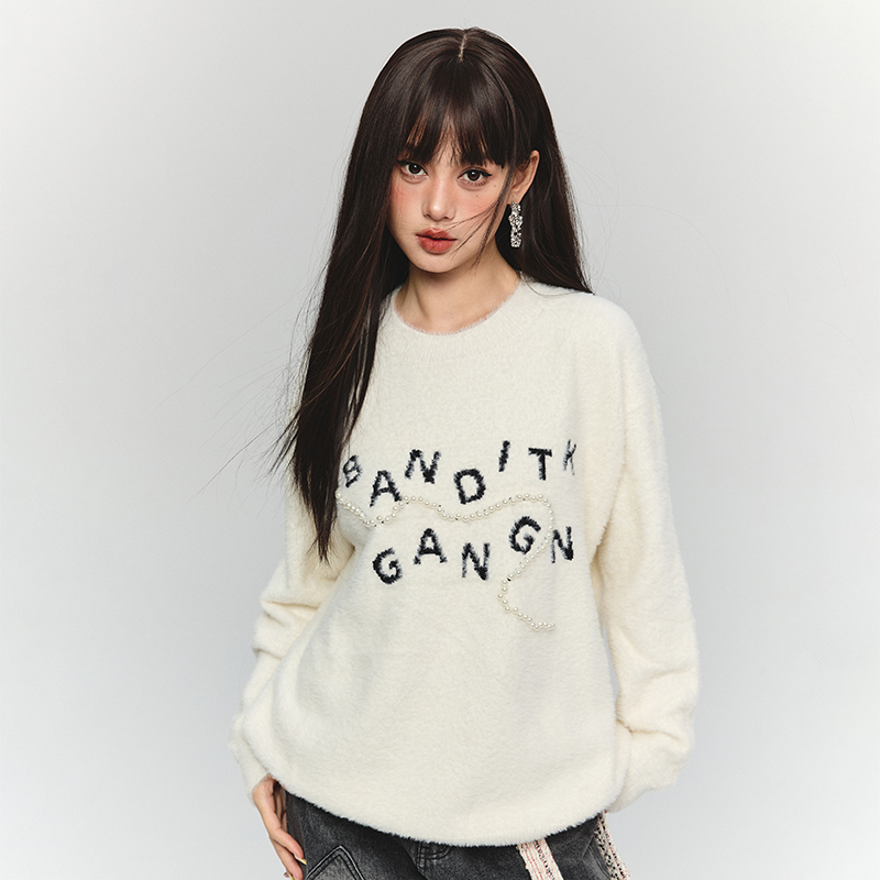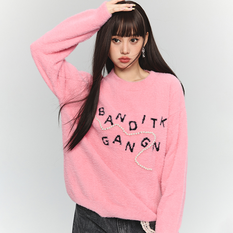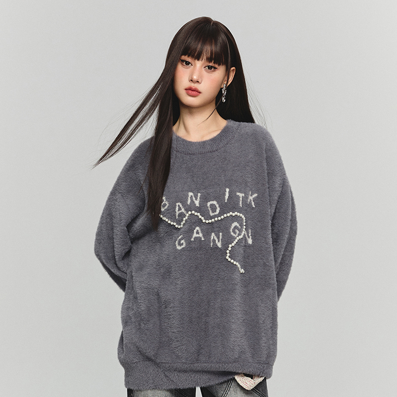 BANDITK GANGN仿水貂絨珍珠毛衣女早秋冬純色圓領寬鬆套頭針織衫