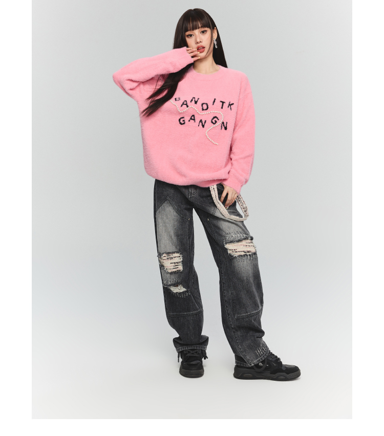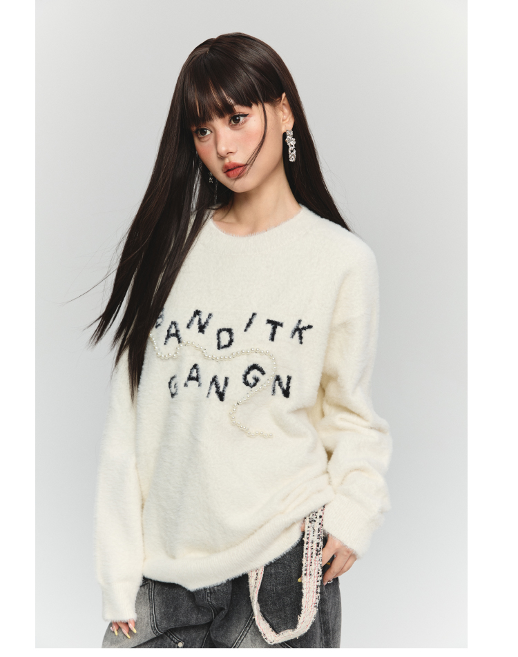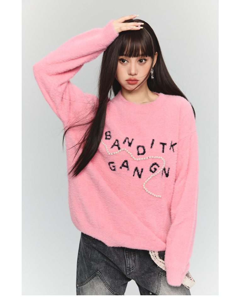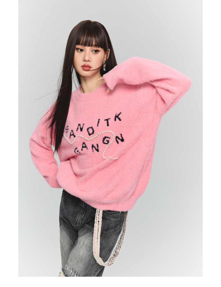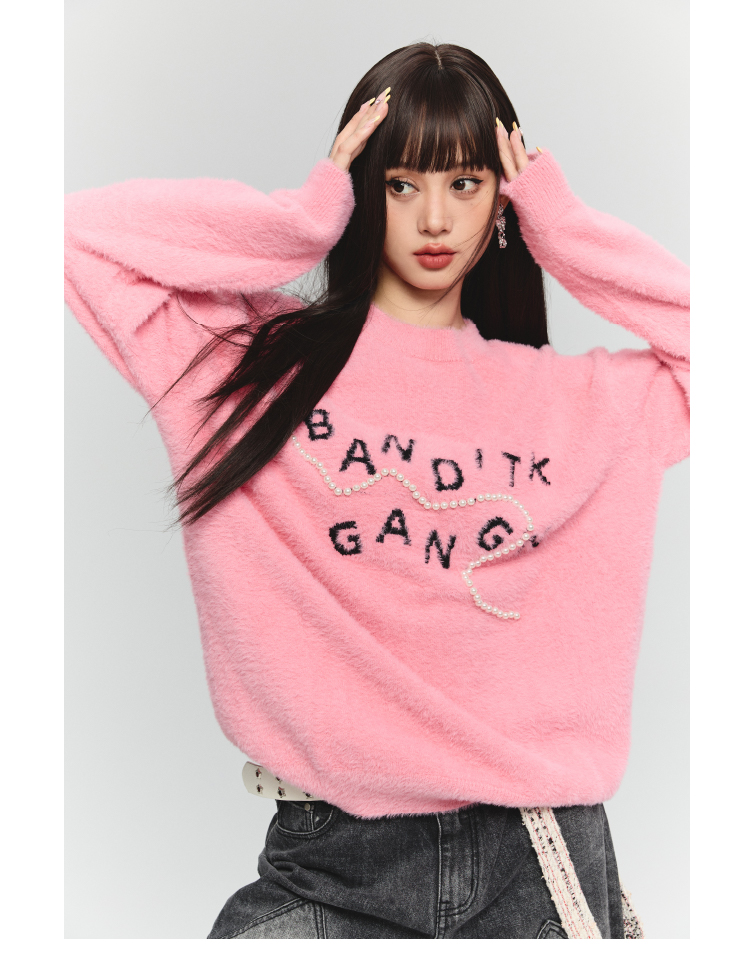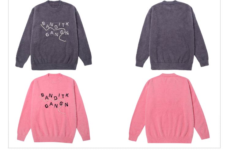 BANDITK GANGN仿水貂絨珍珠毛衣女早秋冬純色圓領寬鬆套頭針織衫