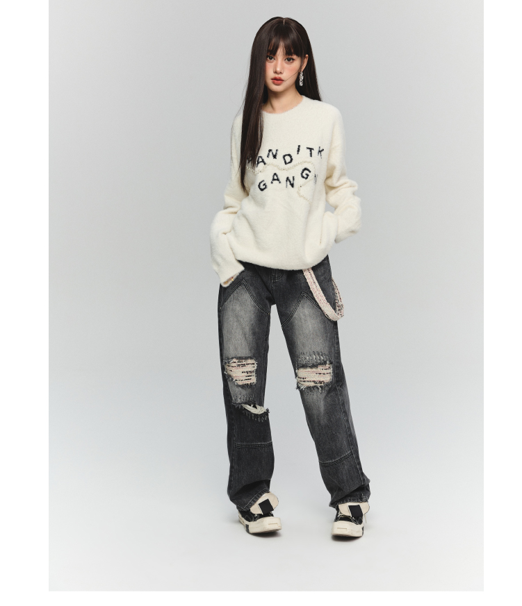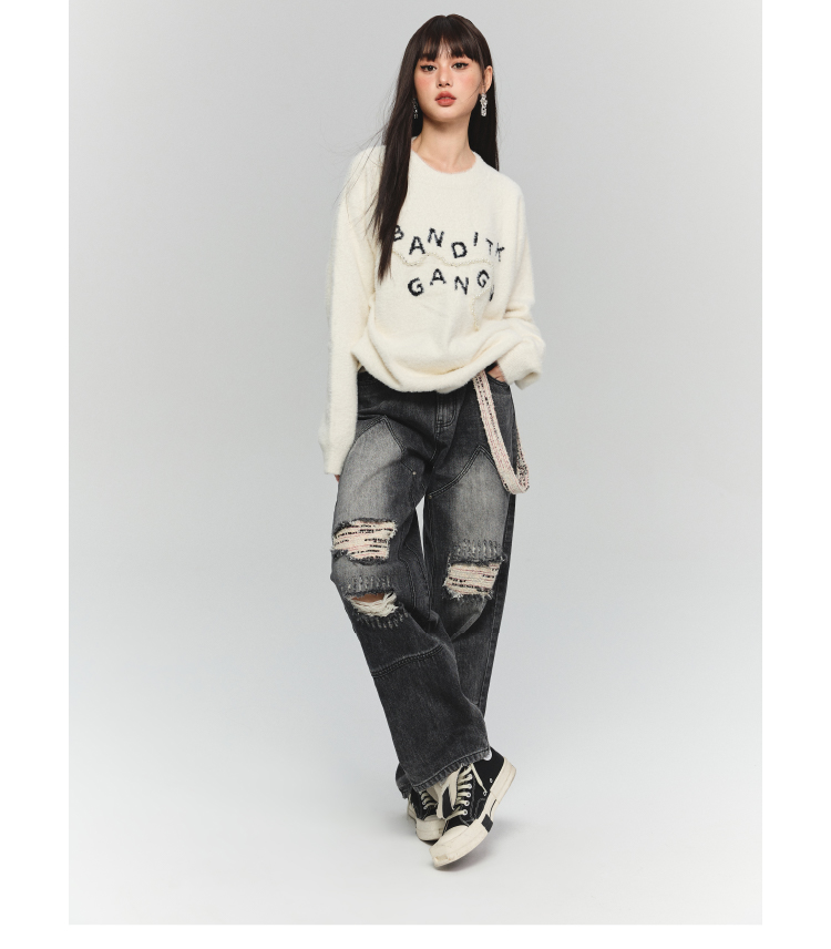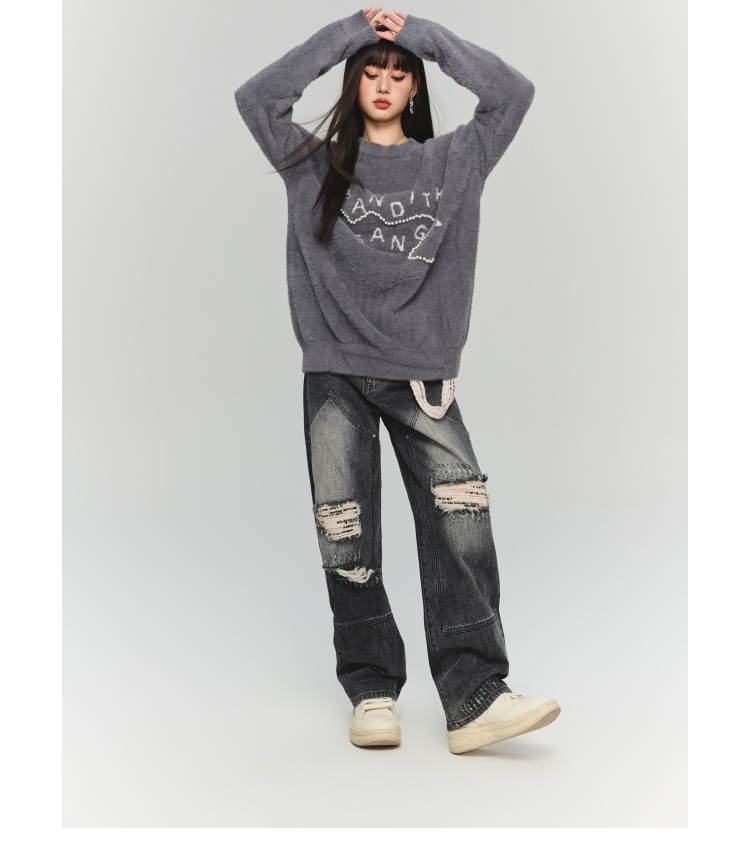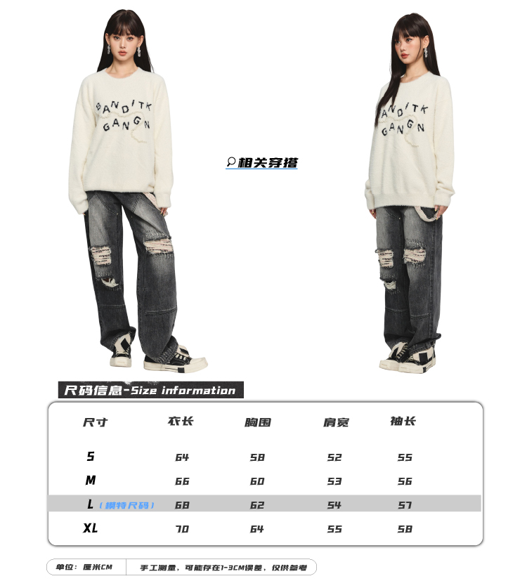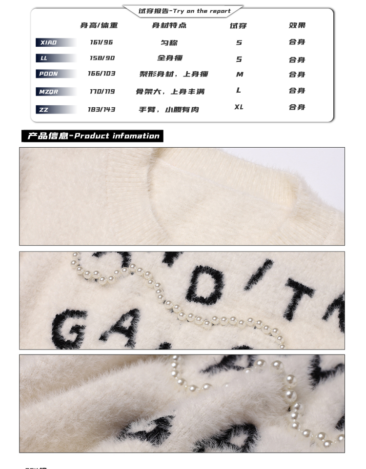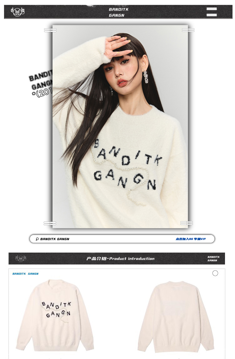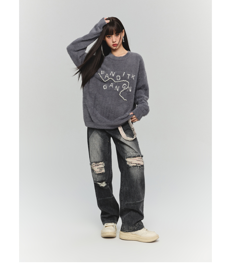 BANDITK GANGN仿水貂絨珍珠毛衣女早秋冬純色圓領寬鬆套頭針織衫