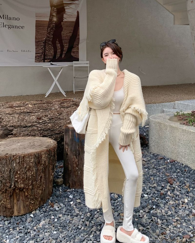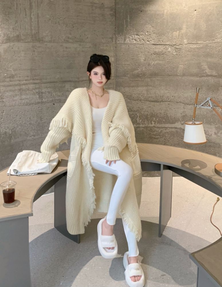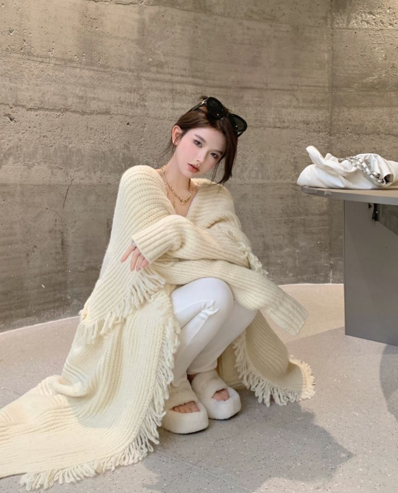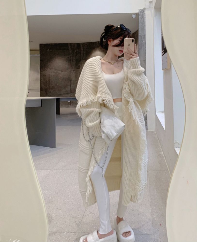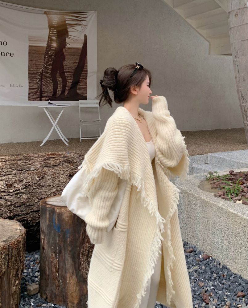 流蘇針織鬥篷披肩開衫外套女秋冬2023年新款寬鬆慵懶風中長版毛衣