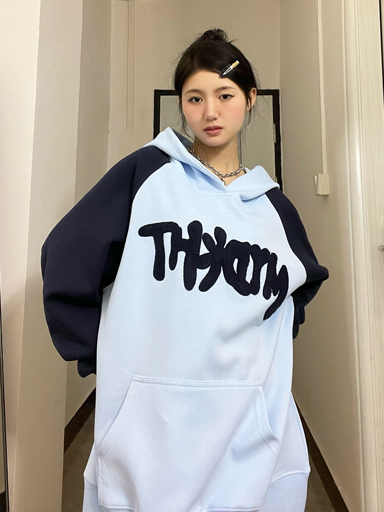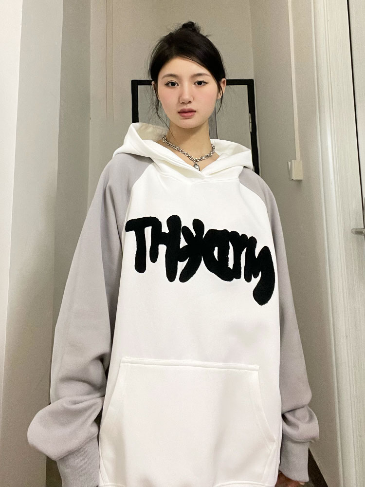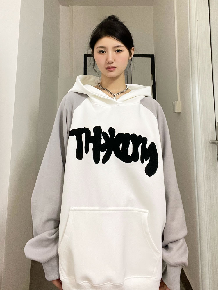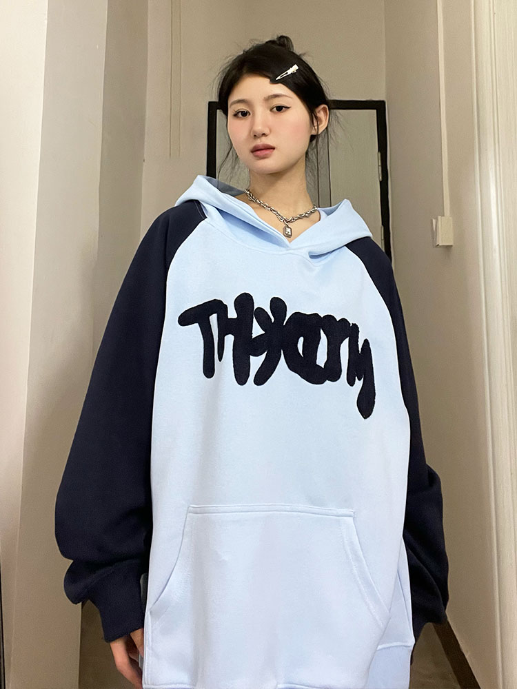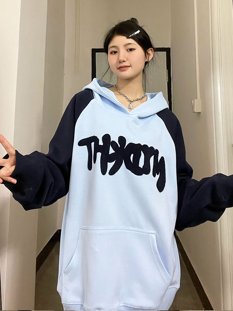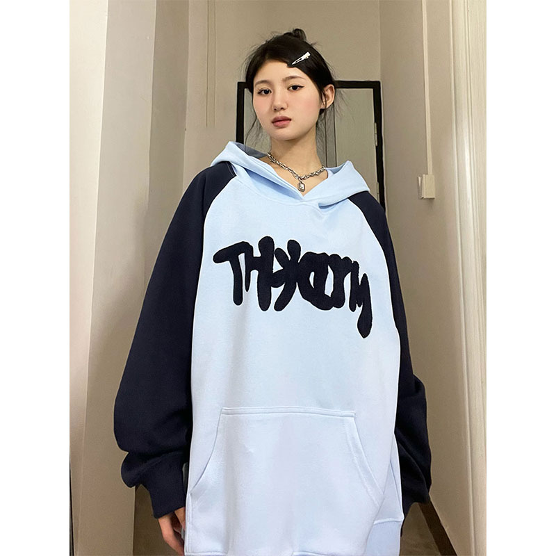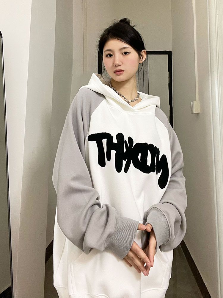 懶懶小朋友 美式字母連帽運動衫女秋季新款插肩袖oversize情侶外套