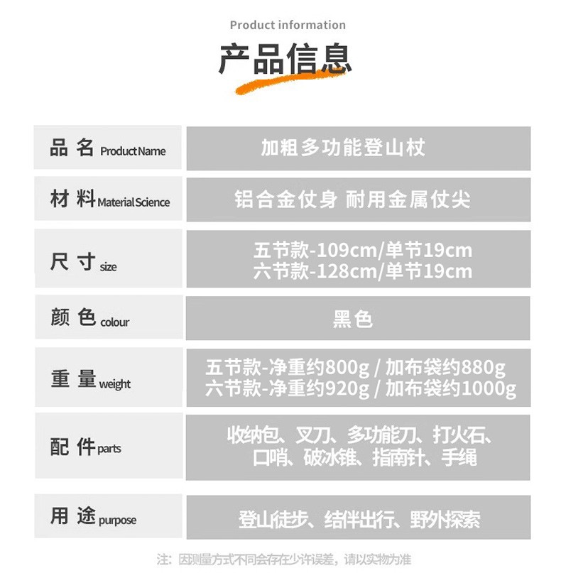 顏色分類 登山杖5節 107cm 登山杖4節 88.5cm 登山杖6節 125.5cm 加粗登山杖4節 90cm 加粗登山杖5節 109.5cm 加粗登山杖6節 128.5cm 升級款夜光款登山杖 五節114cm 加固登山杖銀色 5節101cm 加固登山杖銀色 6節119.5cm 加固登山杖黑 5節102cm 加固登山杖黑 6節120cm