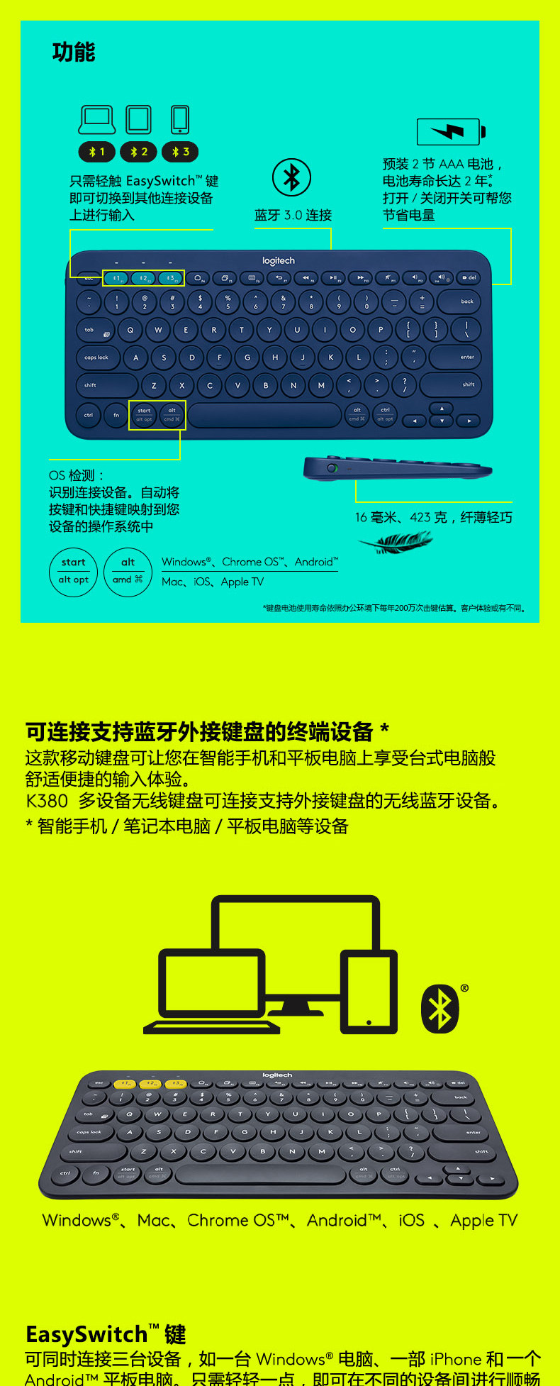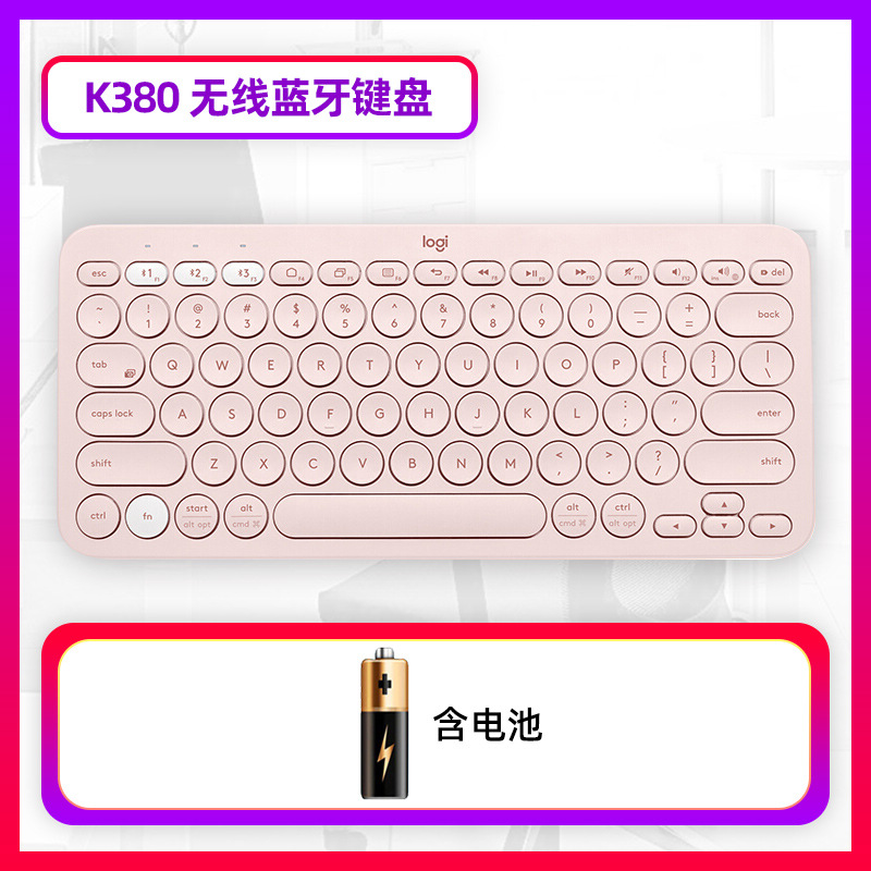 K380为蓝牙键盘,使用蓝牙连接具有蓝牙功能的笔记本电脑,平板,手机等设备,不含接收器,不占用电脑USB接口,无蓝牙功能的台式机需另配蓝牙适配器,请知悉。