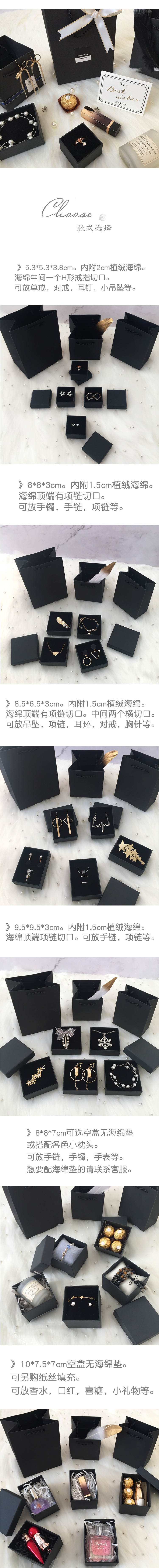 颜色 盒5.3*5.3*3.8cm带海绵,盒8*8*3cm带海绵,盒8.5*6.5*3cm带海绵,盒9.5*9.5*3cm带海绵,10*10*3.5cm配1cm黑垫,盒8*8*7cm空盒,盒8*8*7cm黑绒枕,盒8*8*7cm浅灰绒枕,盒8*8*7cm米白绒枕,小方袋10*10*10cm,小竖袋11*6*13cm,中竖袋13.5*9*18cm,贴纸-这是一份给你的礼物,贴纸-特别的礼物,贴纸-最好的祝福给你,贴纸-爱的手作-黑,贴纸-爱的手作-白,贴纸-特别为你,贴纸-感谢烫金贴8枚黑白各半,贴纸-祝福烫金贴6枚不重样,吊卡-最美好的时光6枚,吊卡-祝福卡4枚不重样,长条盒24*5.5*3.5cm带海绵,15mm宽烫金菱形黑色缎带2m,15mm宽白色金边缎带2m,20mm宽银灰色雪纱带2m,6mm宽银灰高密缎带2m,9mm宽白色金边缎带2m,9mm宽米白色雪纱带2m,9mm宽银灰雪纱带2m,9mm烫金菱形黑色缎带2m,9mm银灰高密缎带2m,星星合金吊坠1颗装,珍珠合金吊坠1颗装,4cm圆形烫金透明贴纸,贴纸-星月贴纸-白色,贴纸-星月贴纸-黑色,盒10*7.5*7空盒,小贺卡9*7cm,配套小信封cm